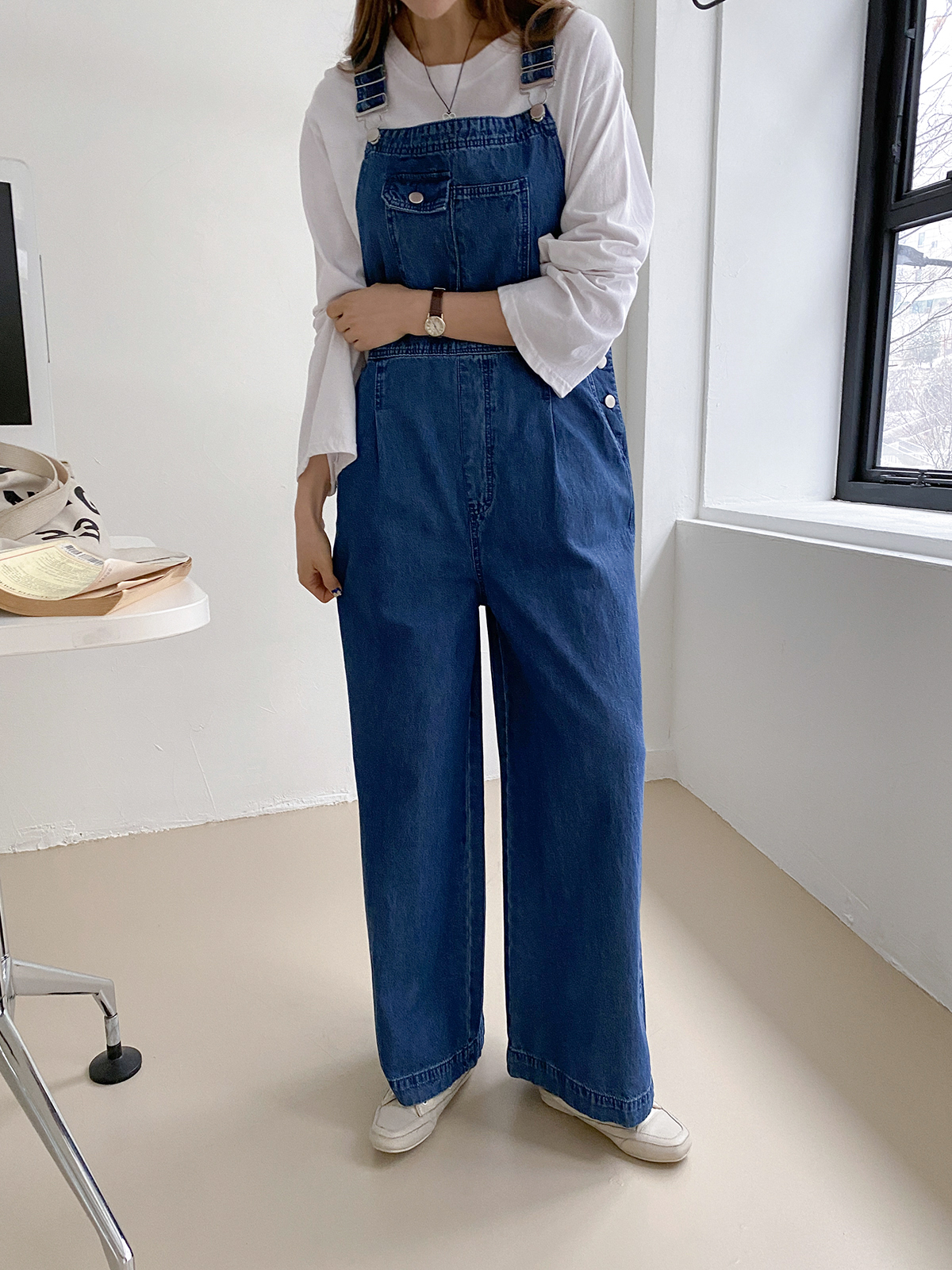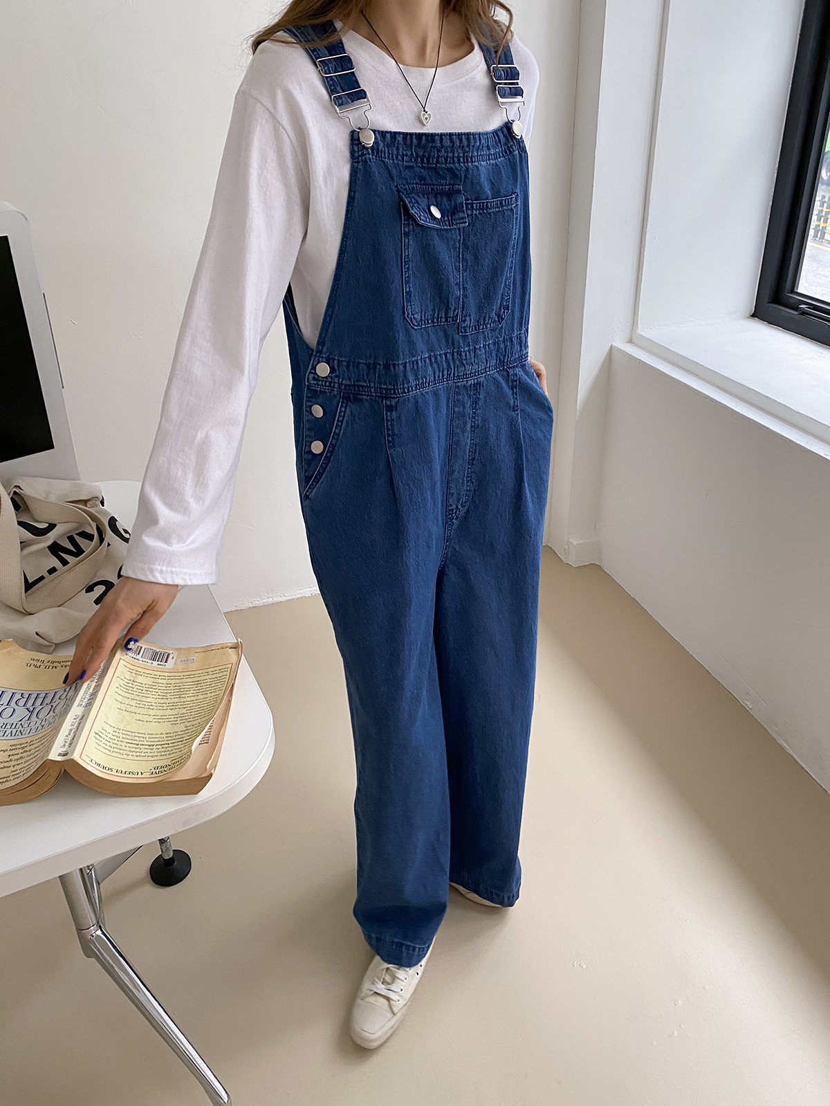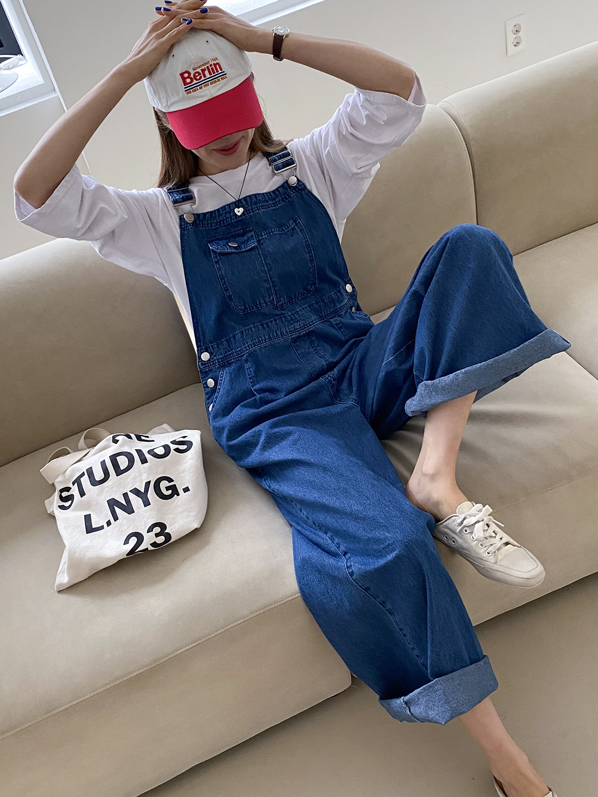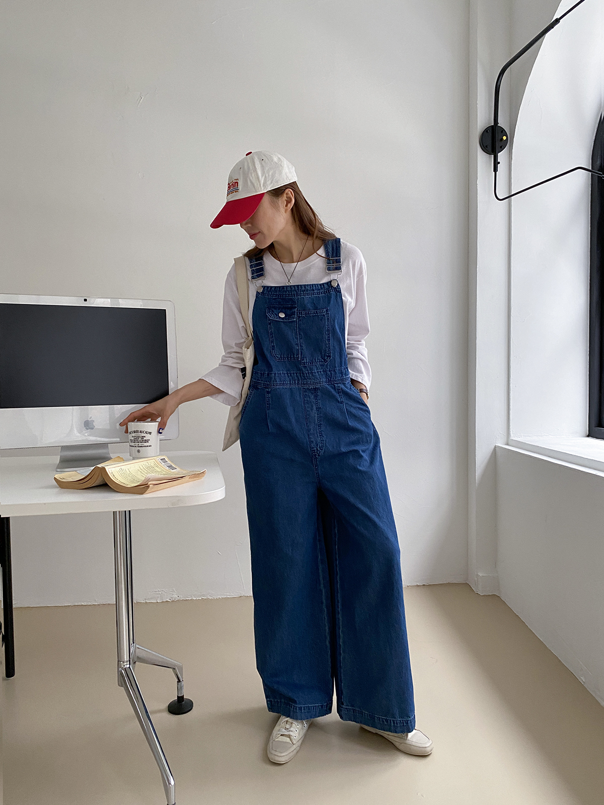 멜빵 디자인으로 러블리하고 귀여운 분위기를 낼 수 있고, 와이드한 핏으로 편하면서 멋스러운 룩을 연출할 수 있는 멜빵 데님 팬츠