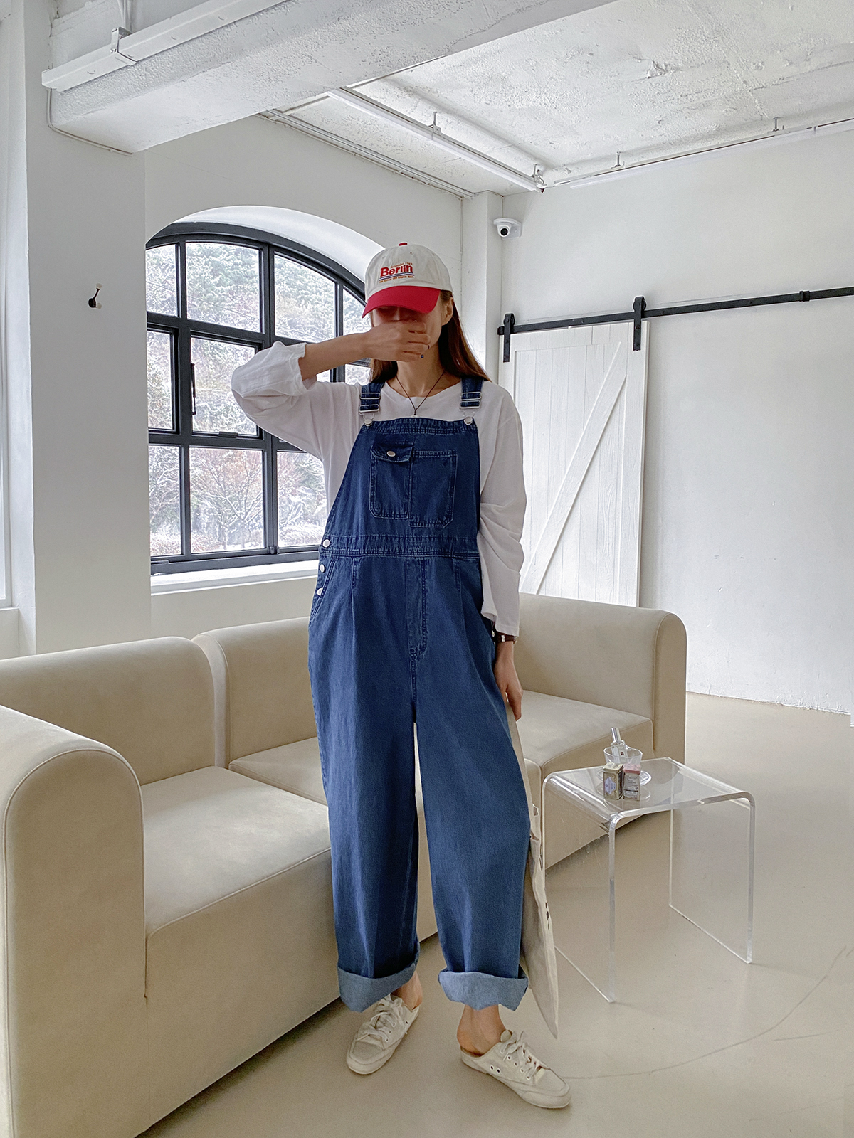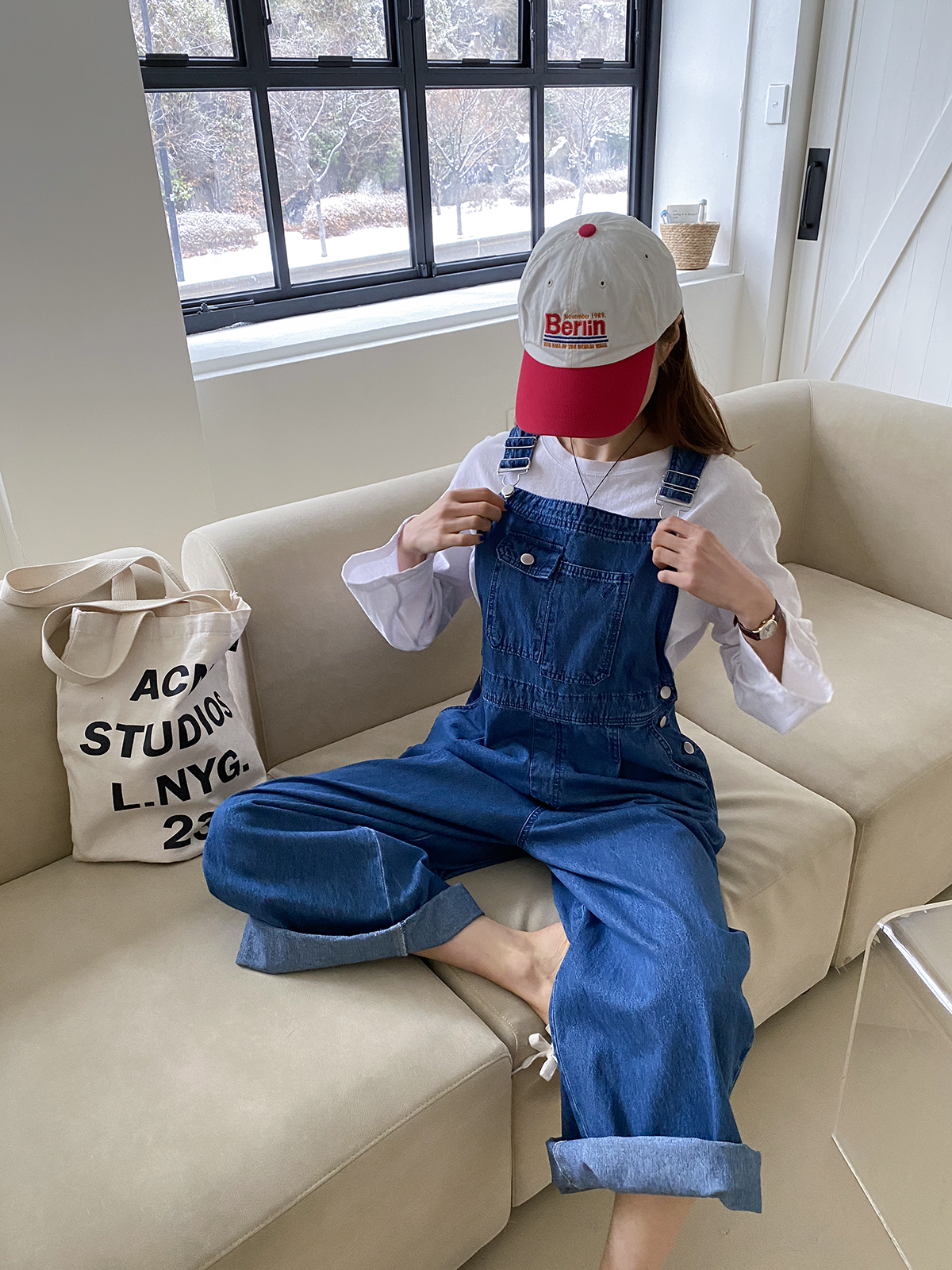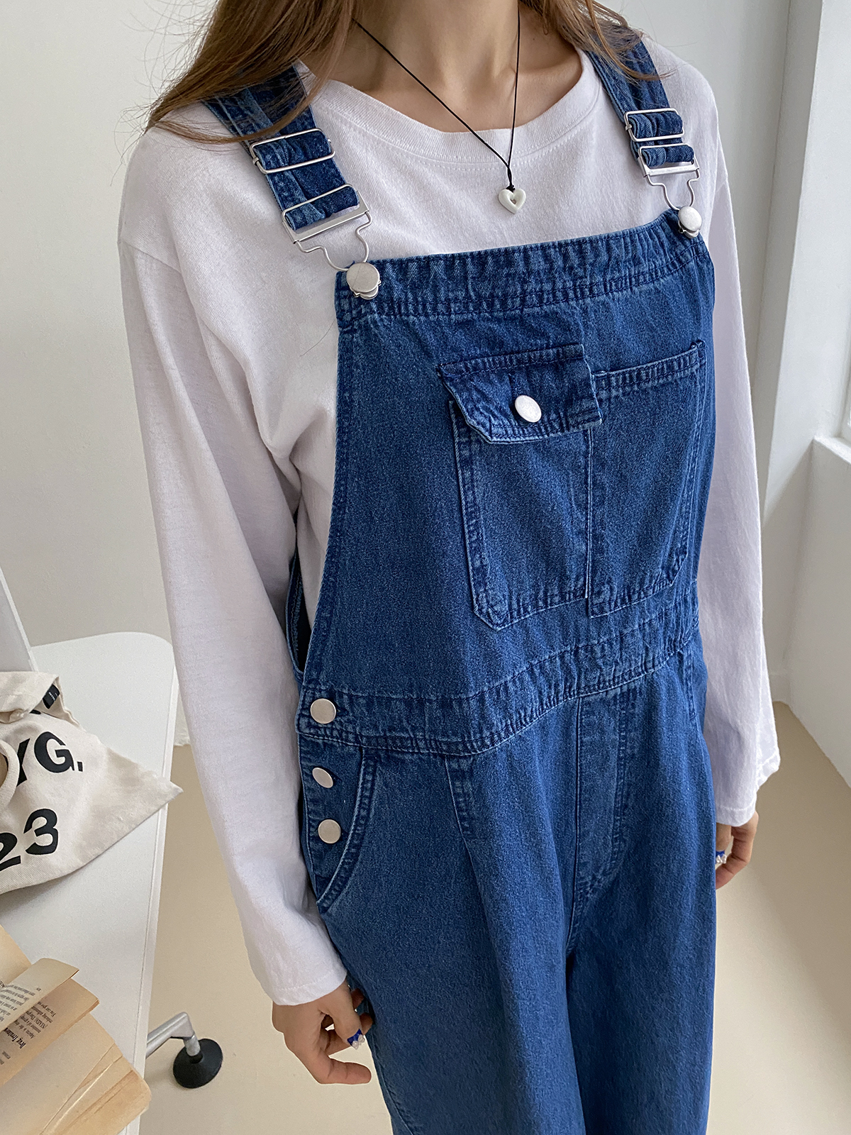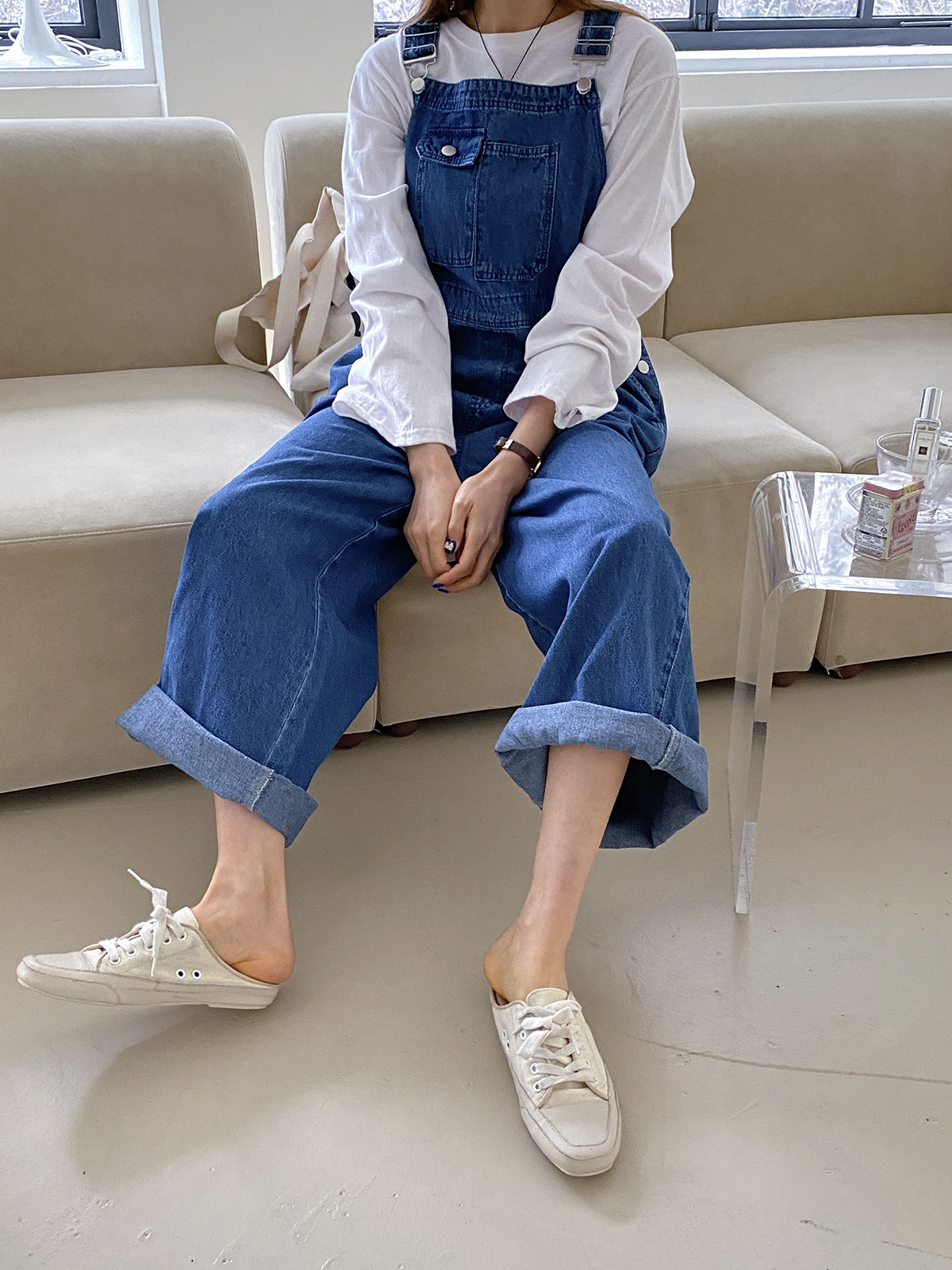 멜빵 디자인으로 러블리하고 귀여운 분위기를 낼 수 있고, 와이드한 핏으로 편하면서 멋스러운 룩을 연출할 수 있는 멜빵 데님 팬츠