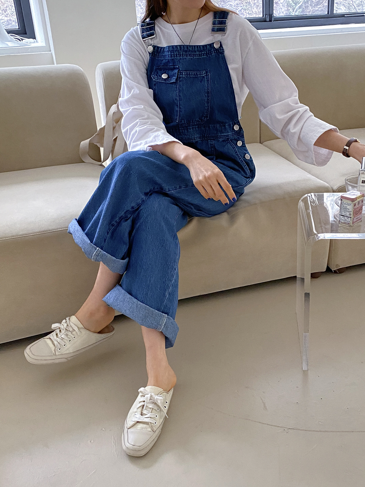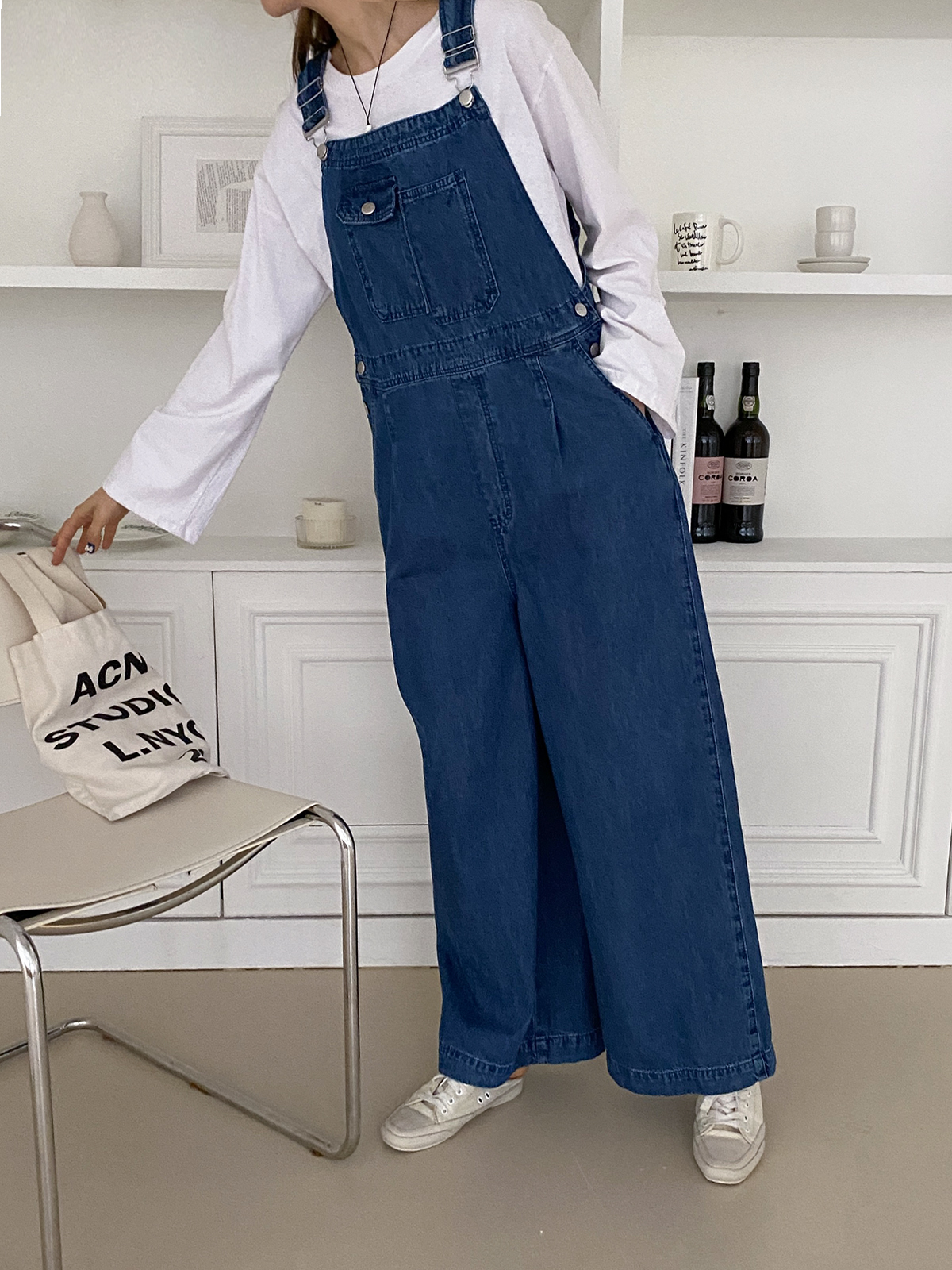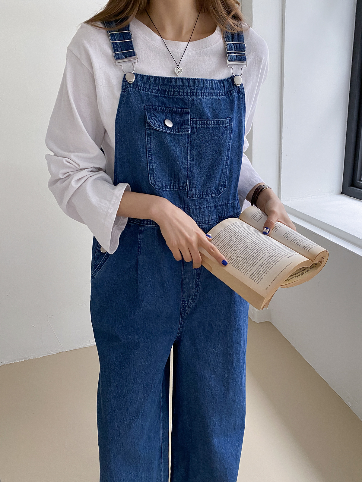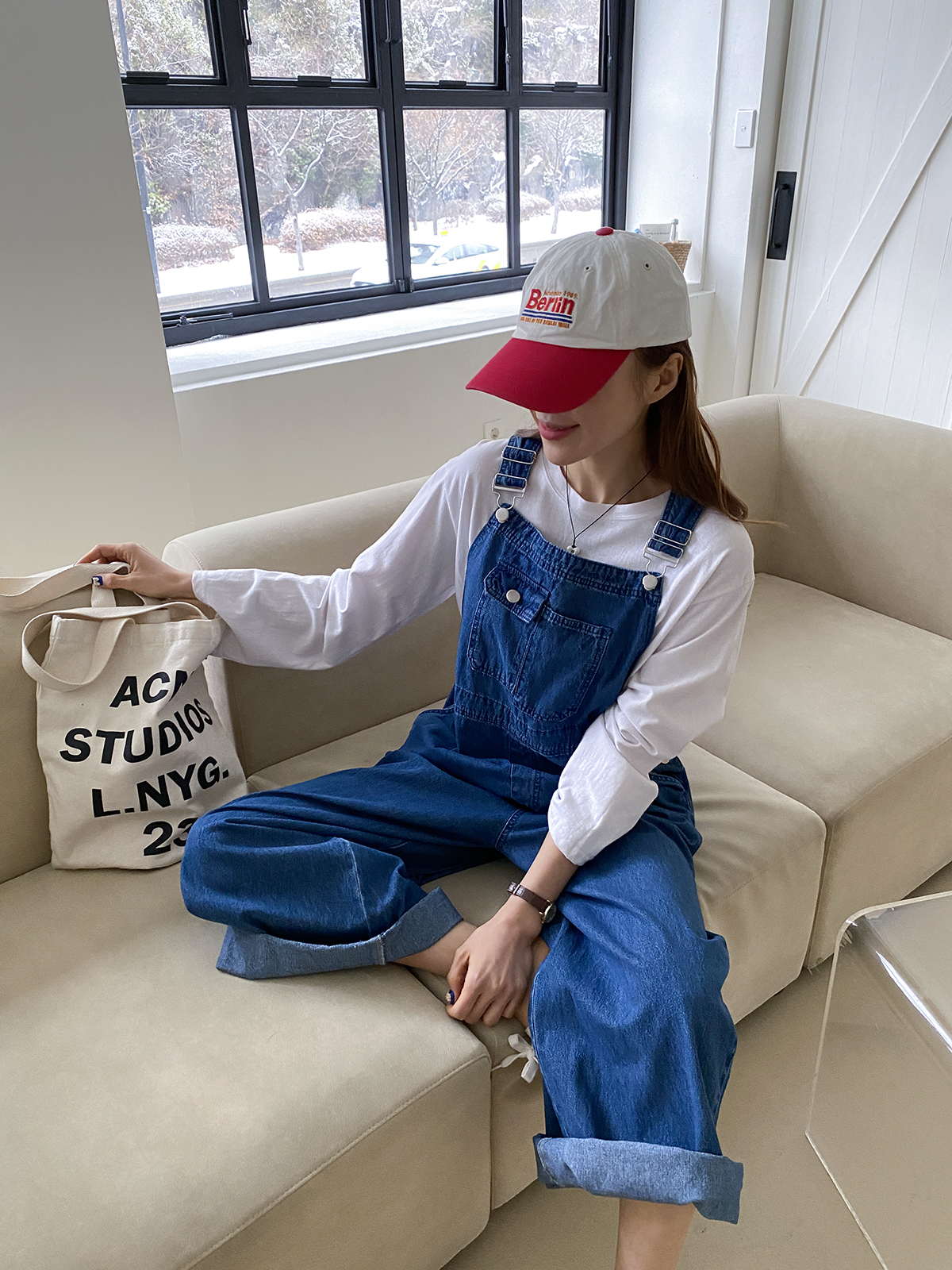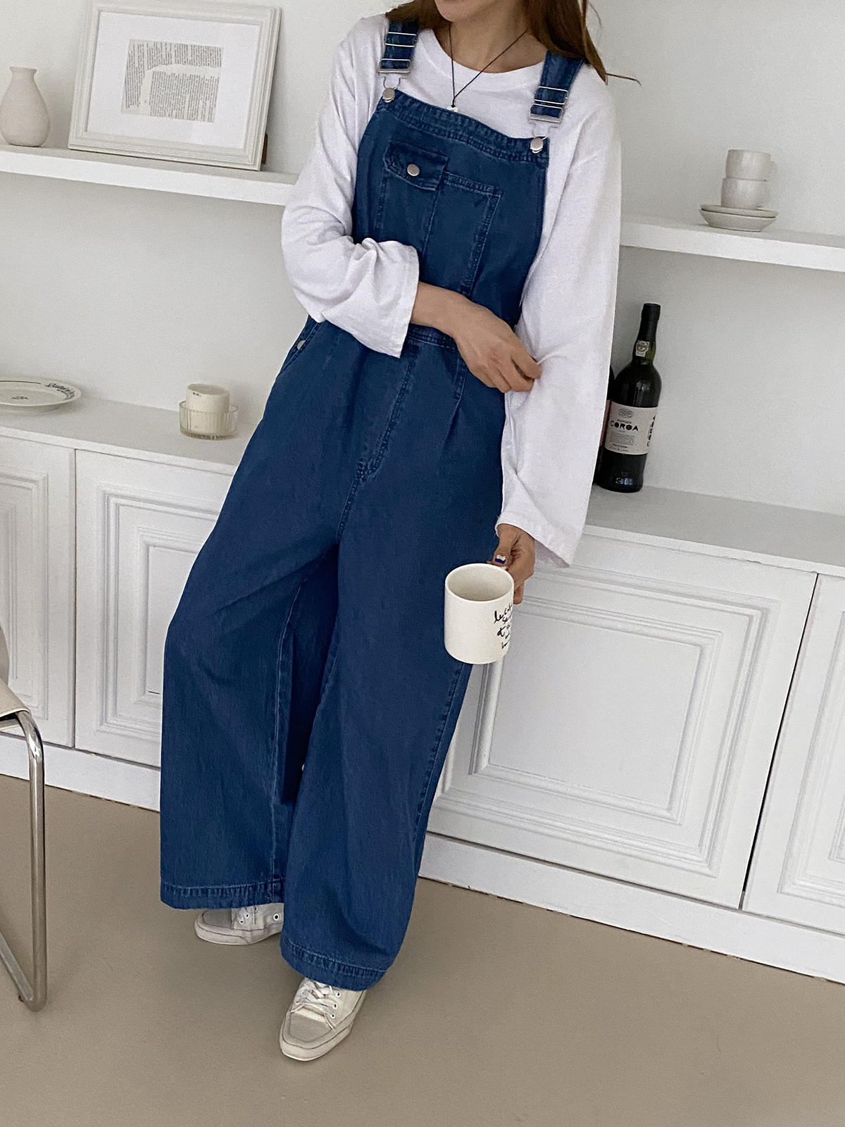 멜빵 디자인으로 러블리하고 귀여운 분위기를 낼 수 있고, 와이드한 핏으로 편하면서 멋스러운 룩을 연출할 수 있는 멜빵 데님 팬츠
