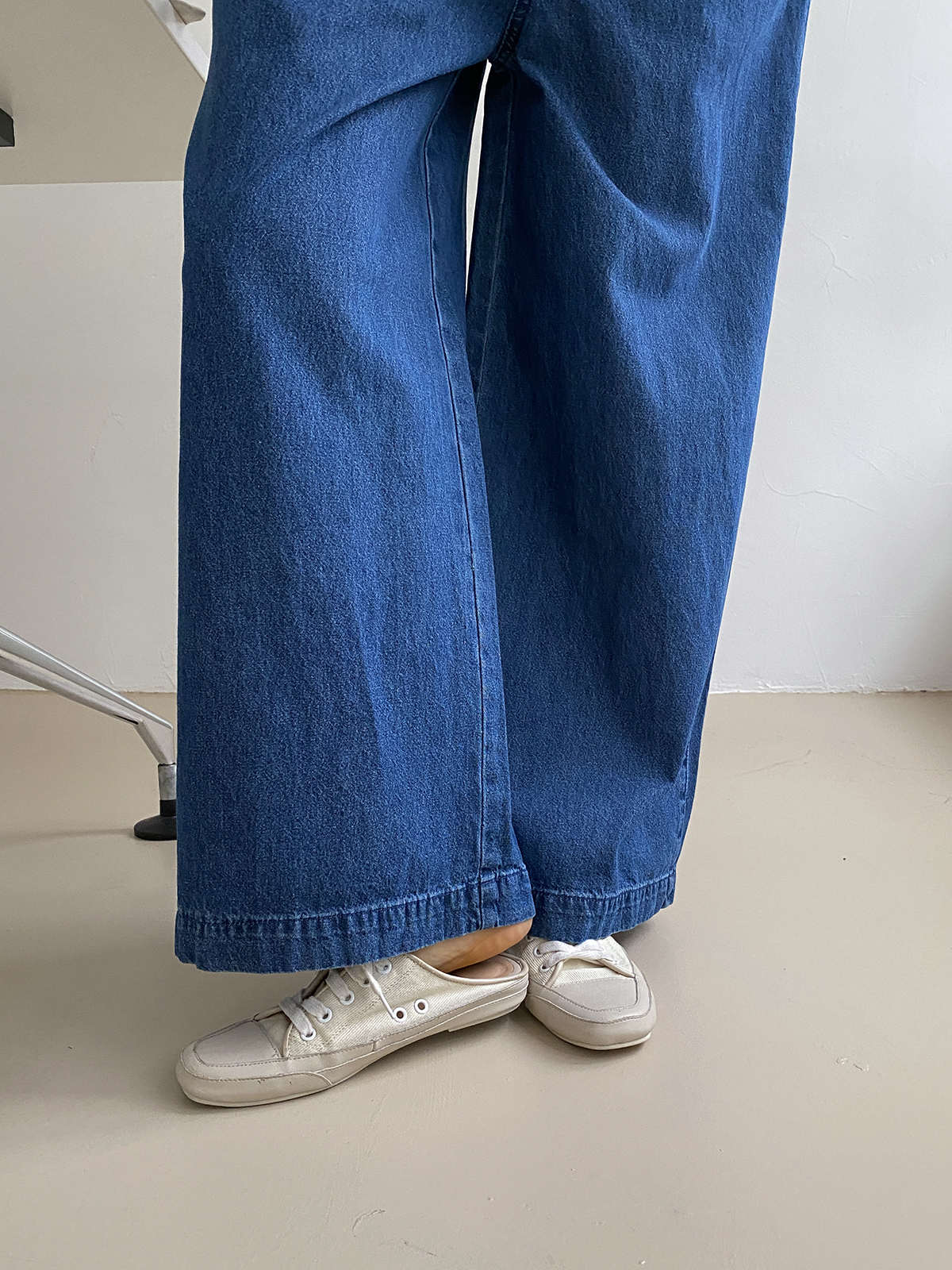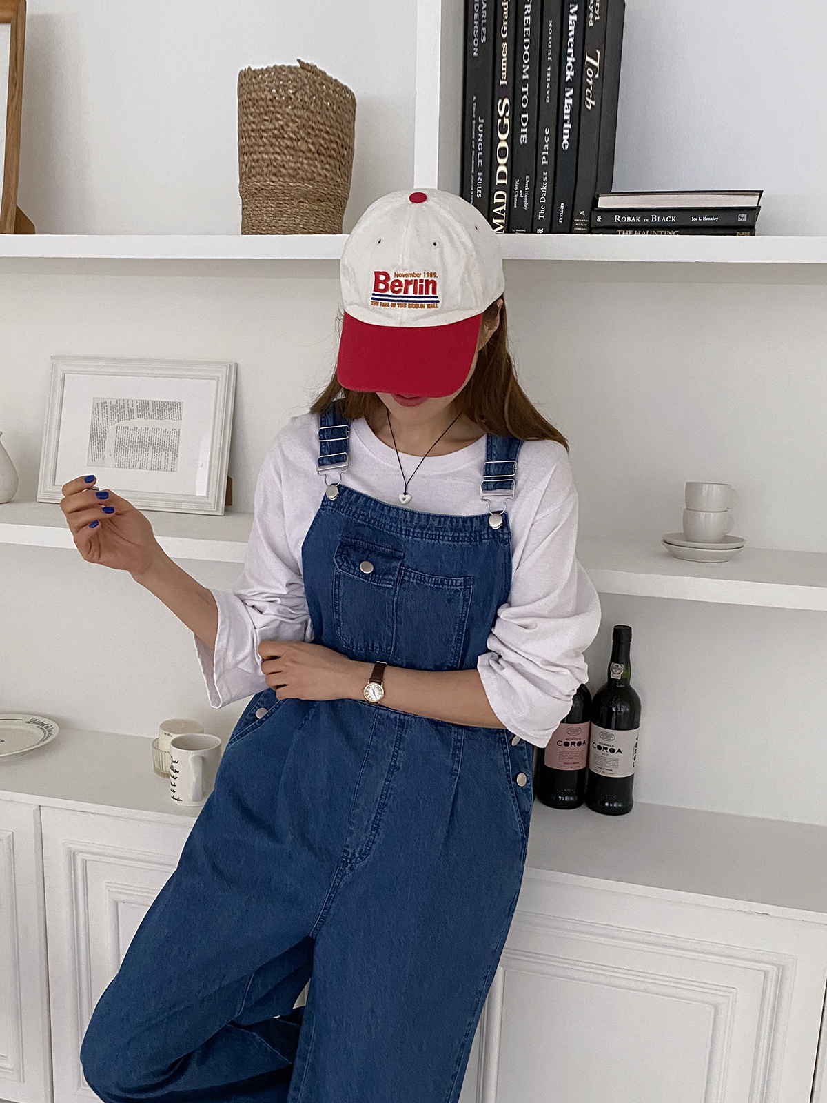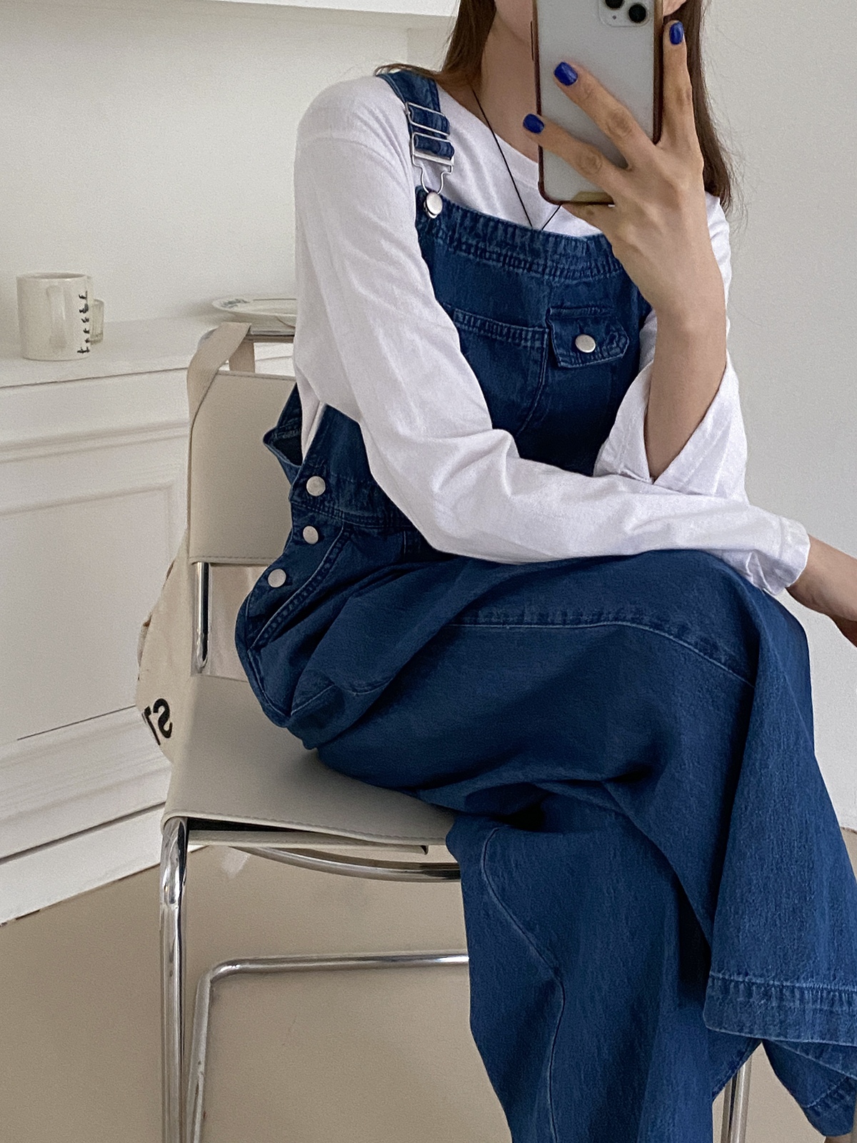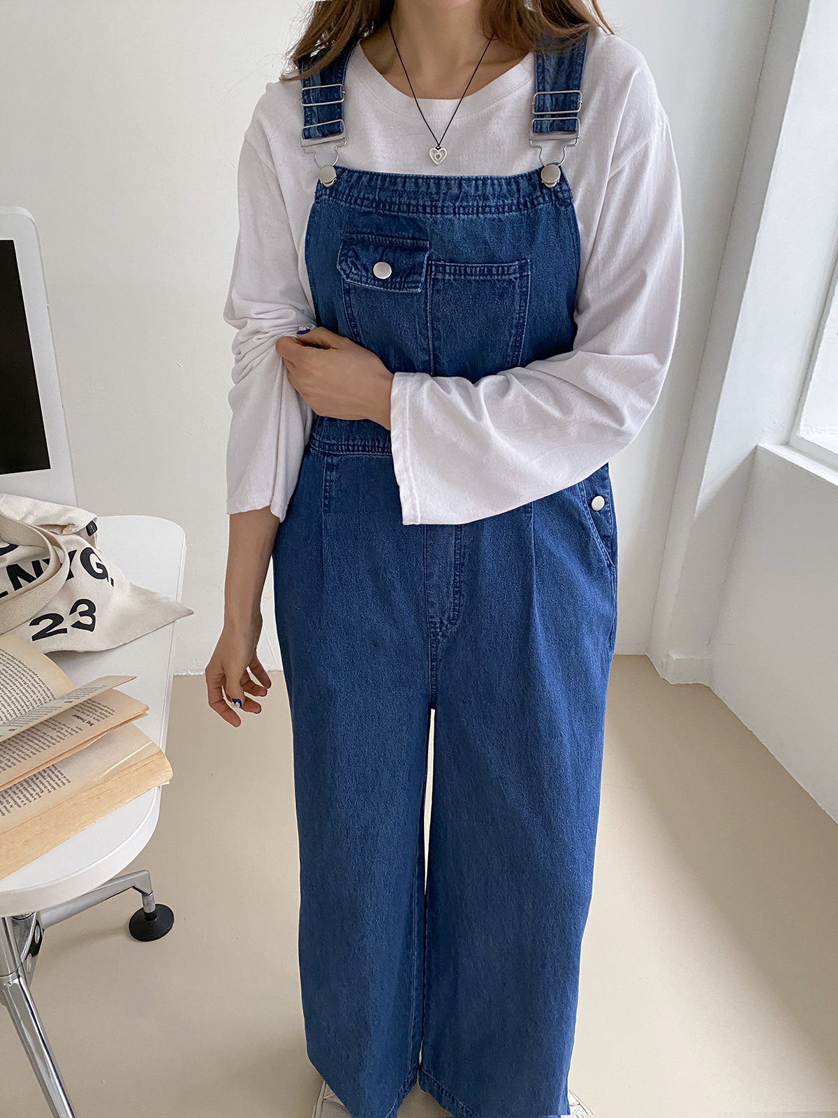 멜빵 디자인으로 러블리하고 귀여운 분위기를 낼 수 있고, 와이드한 핏으로 편하면서 멋스러운 룩을 연출할 수 있는 멜빵 데님 팬츠