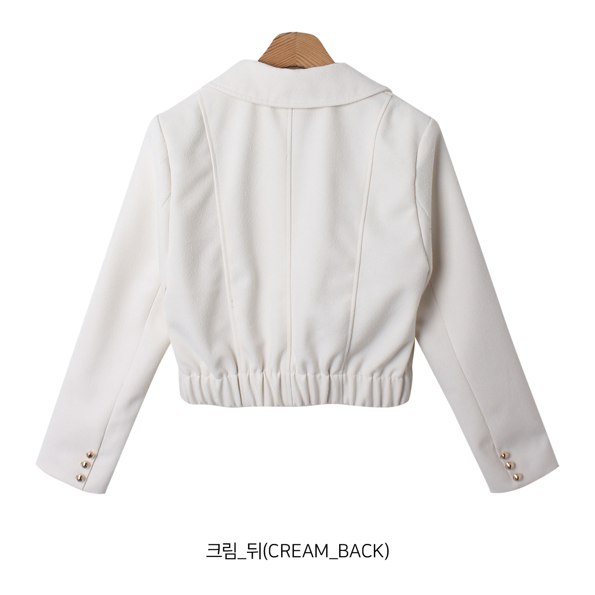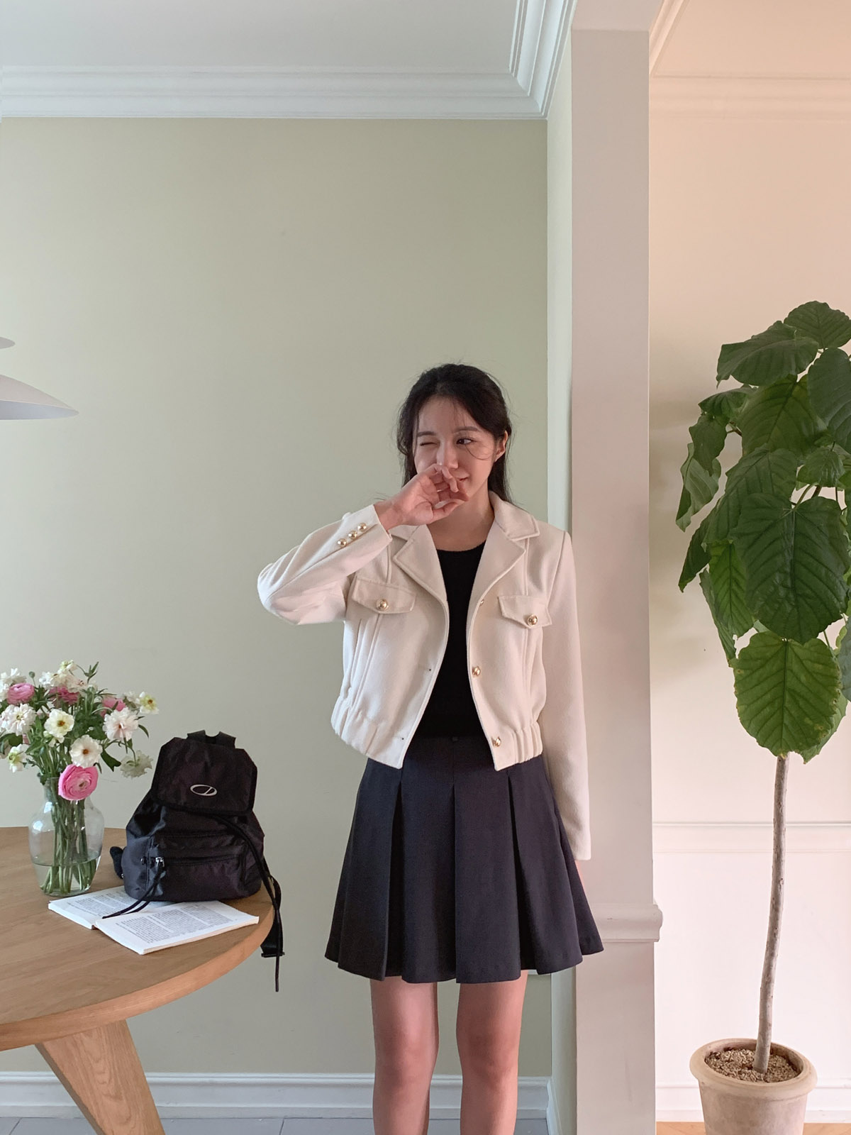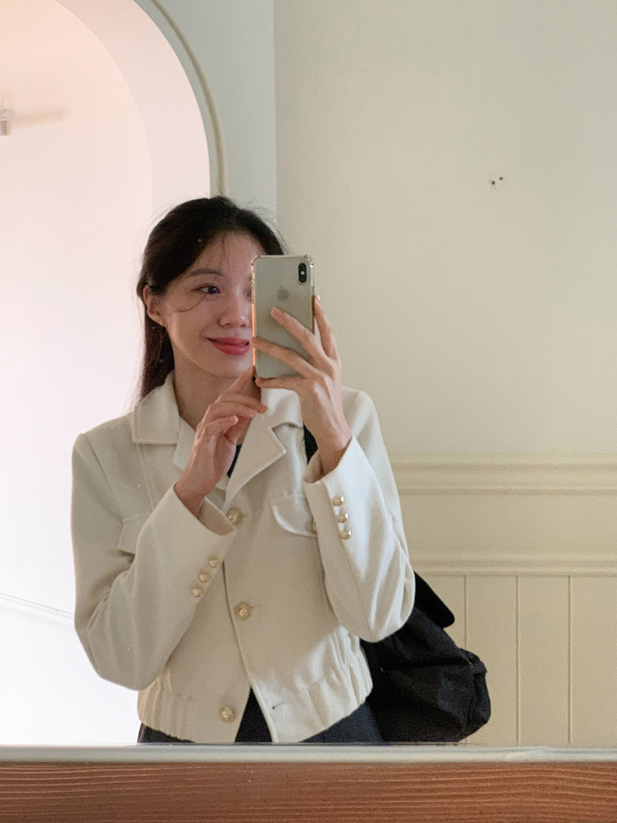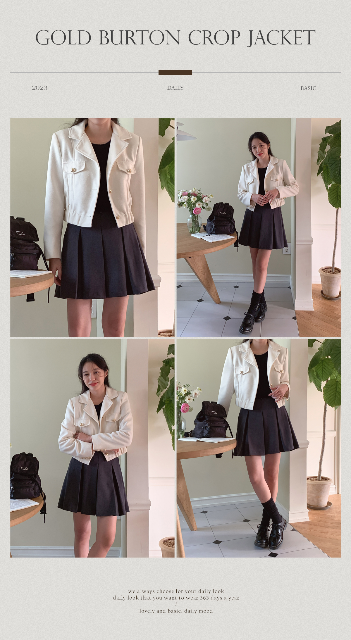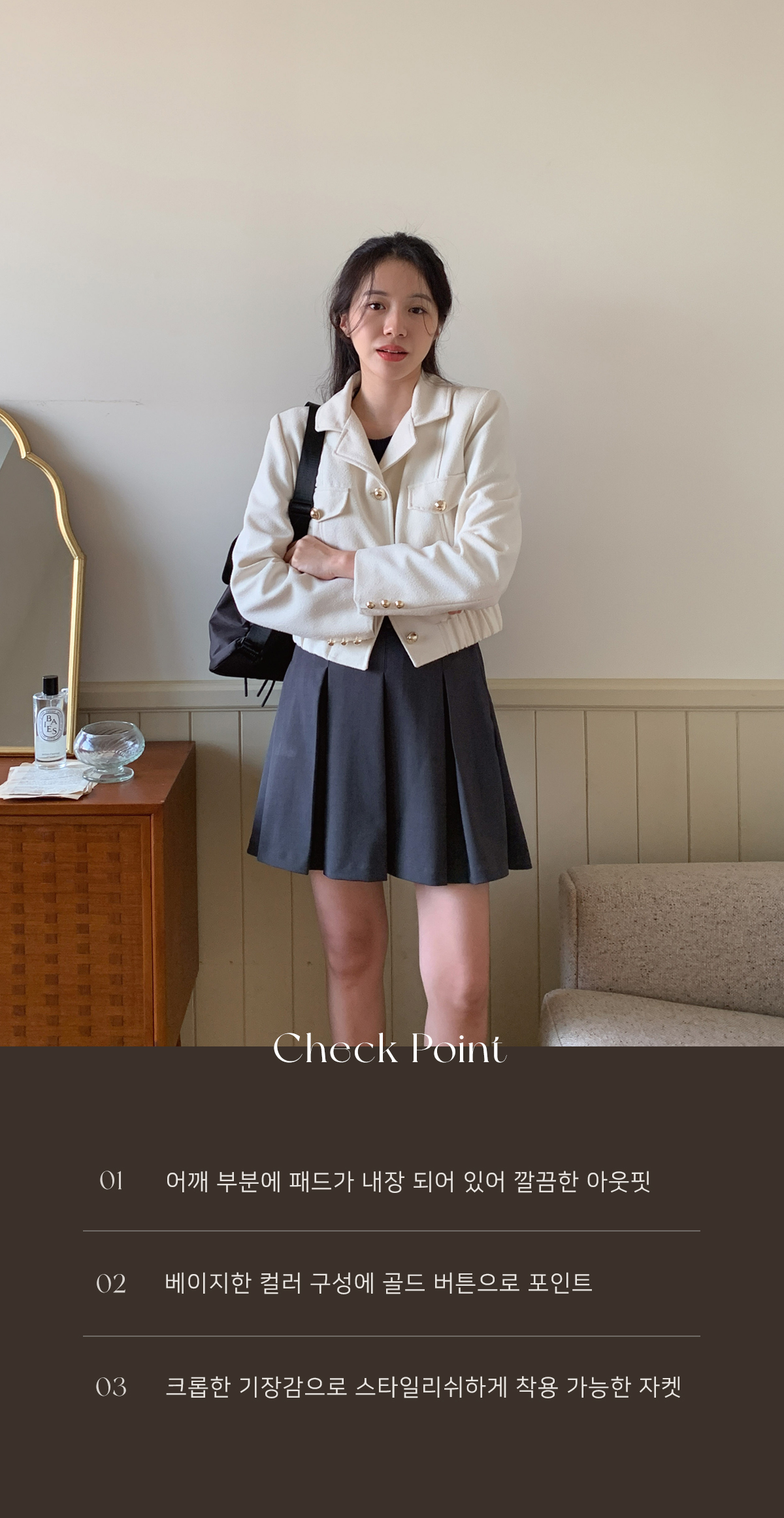 베이지한 컬러 구성에 골드 버튼 포인트가 있으며 크롭한 기장감으로