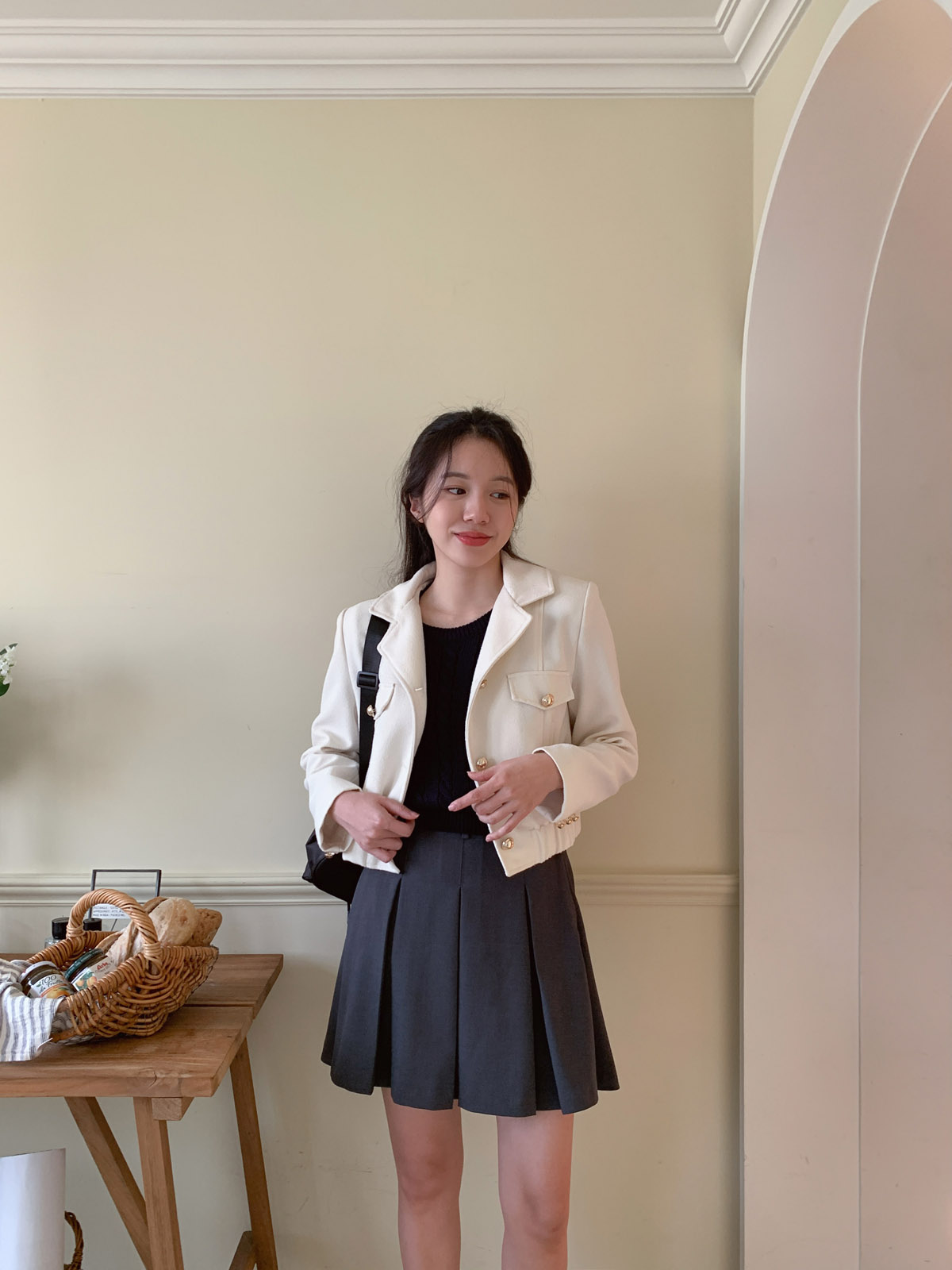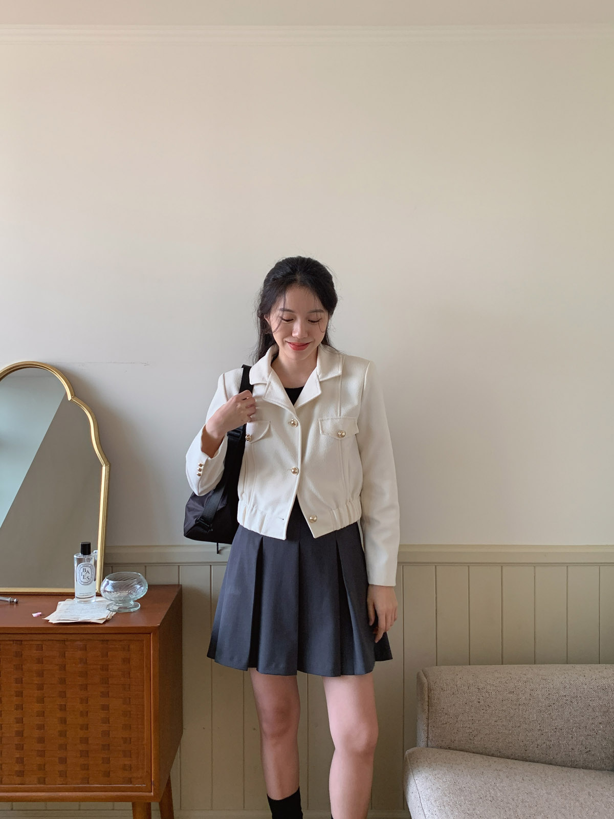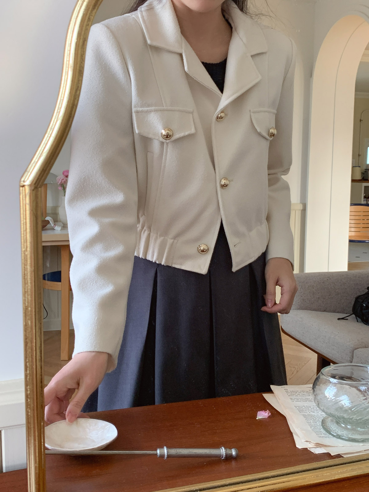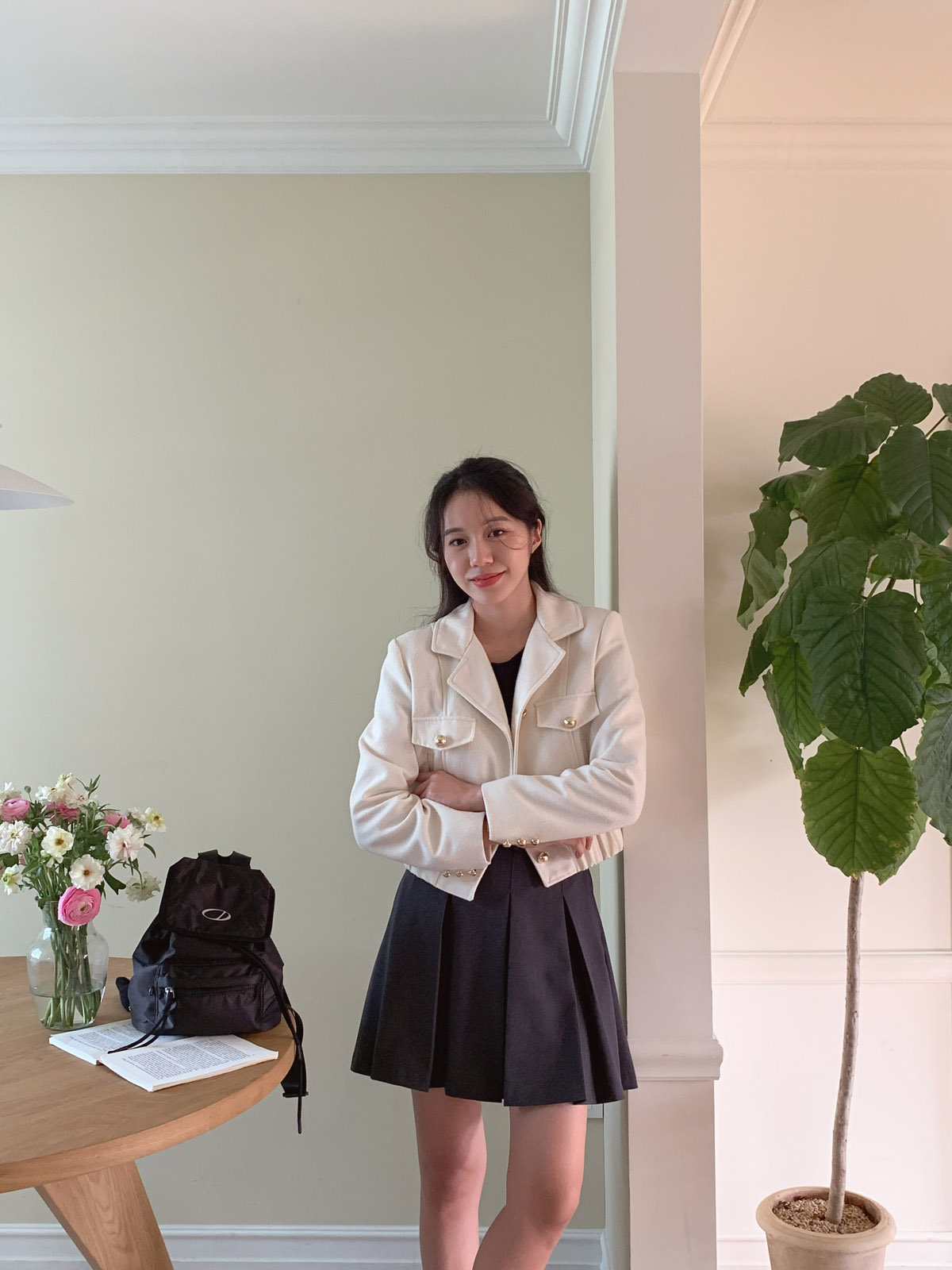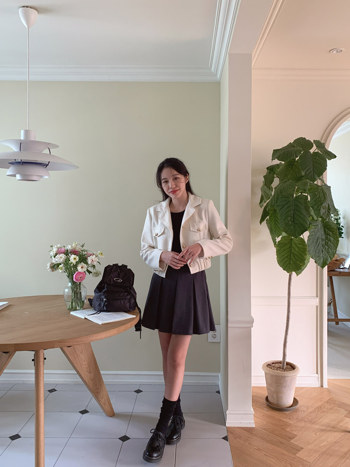 베이지한 컬러 구성에 골드 버튼 포인트가 있으며 크롭한 기장감으로