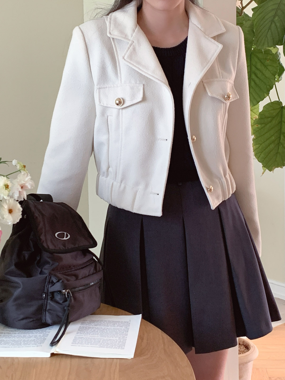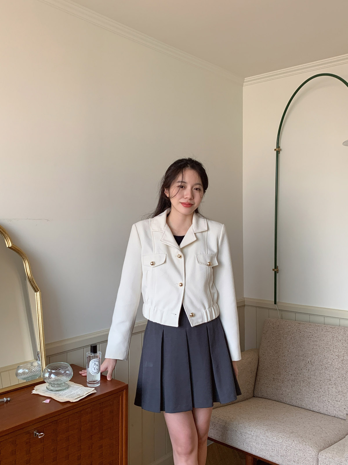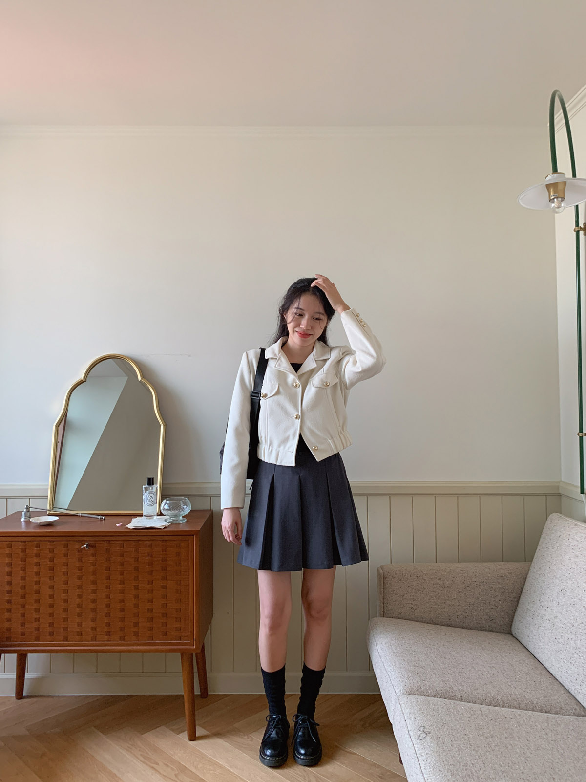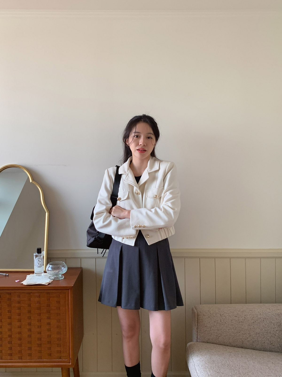 베이지한 컬러 구성에 골드 버튼 포인트가 있으며 크롭한 기장감으로