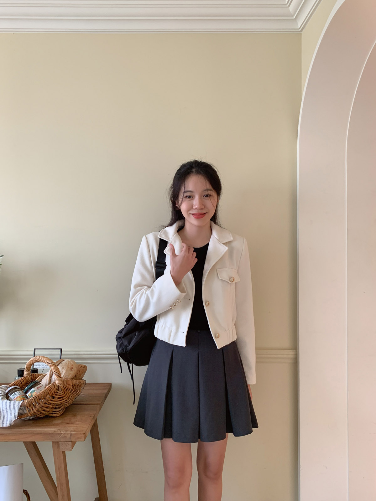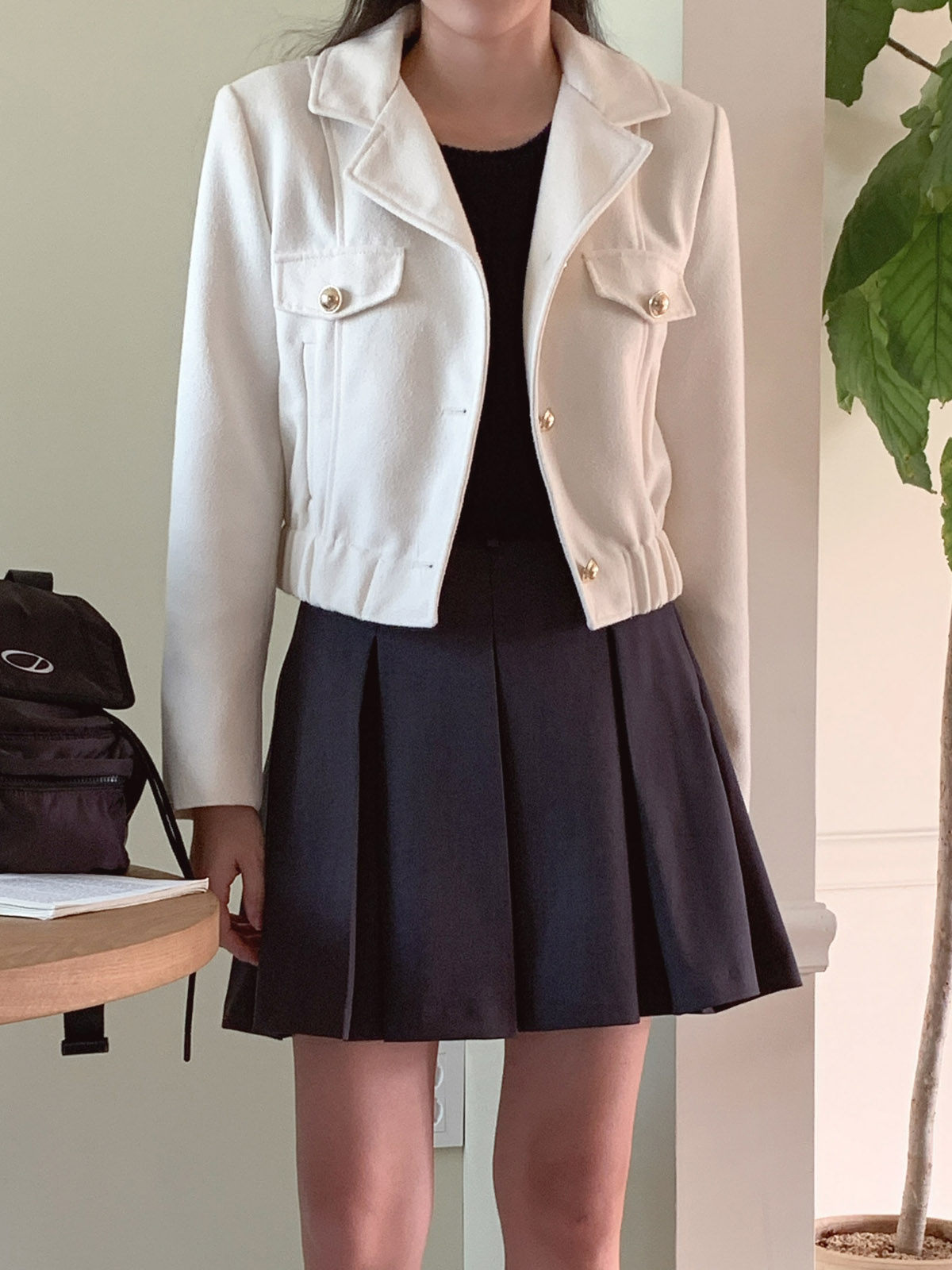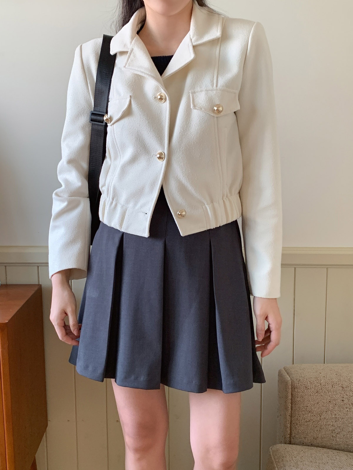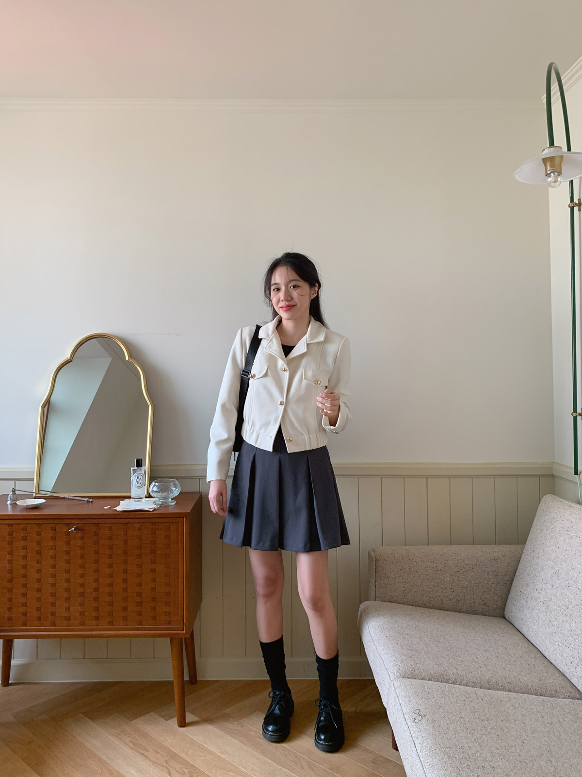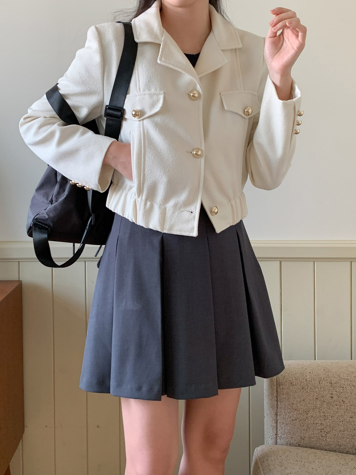 베이지한 컬러 구성에 골드 버튼 포인트가 있으며 크롭한 기장감으로