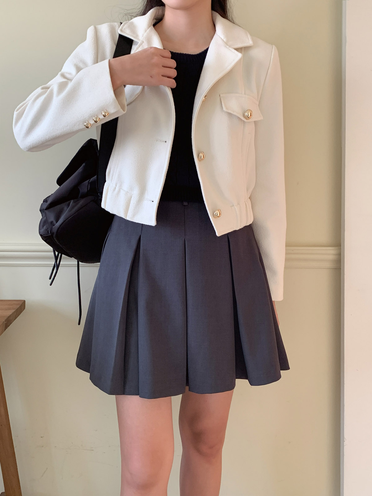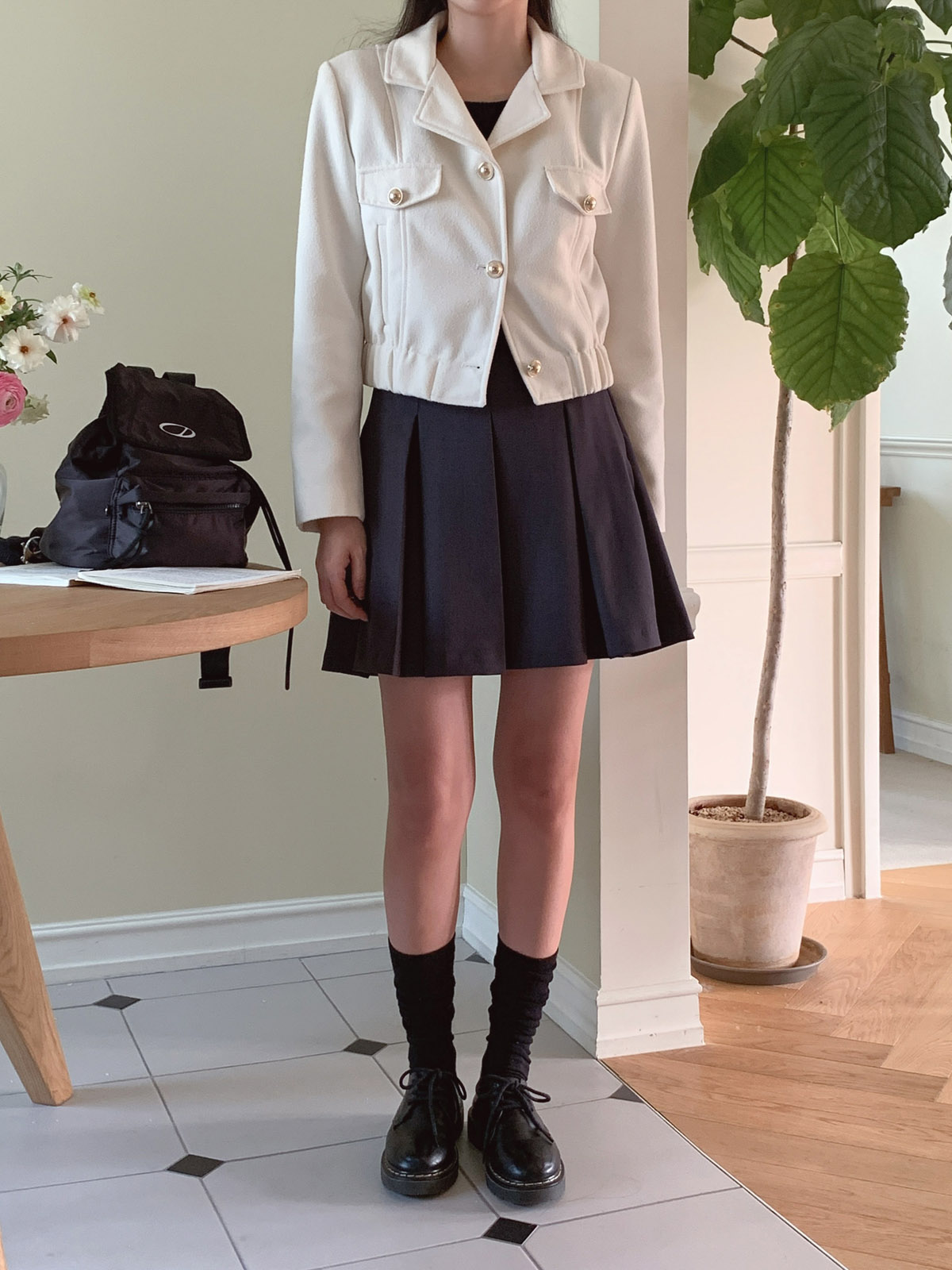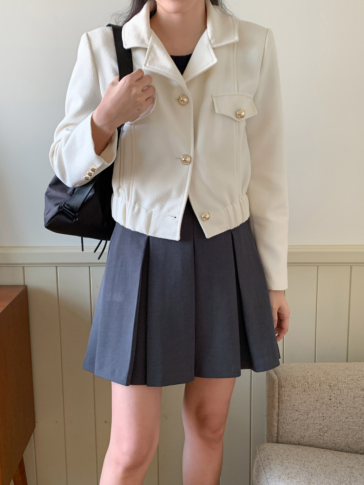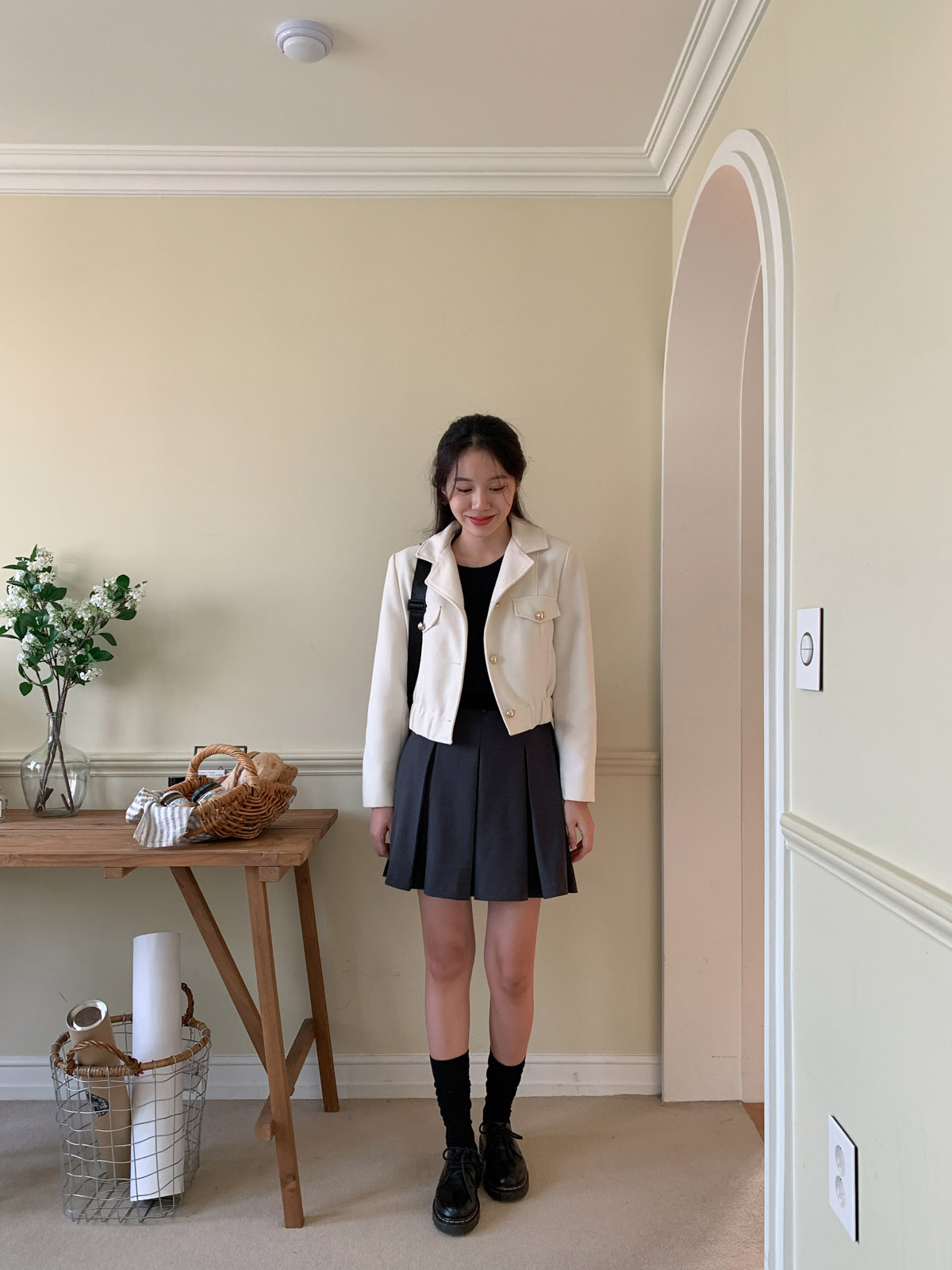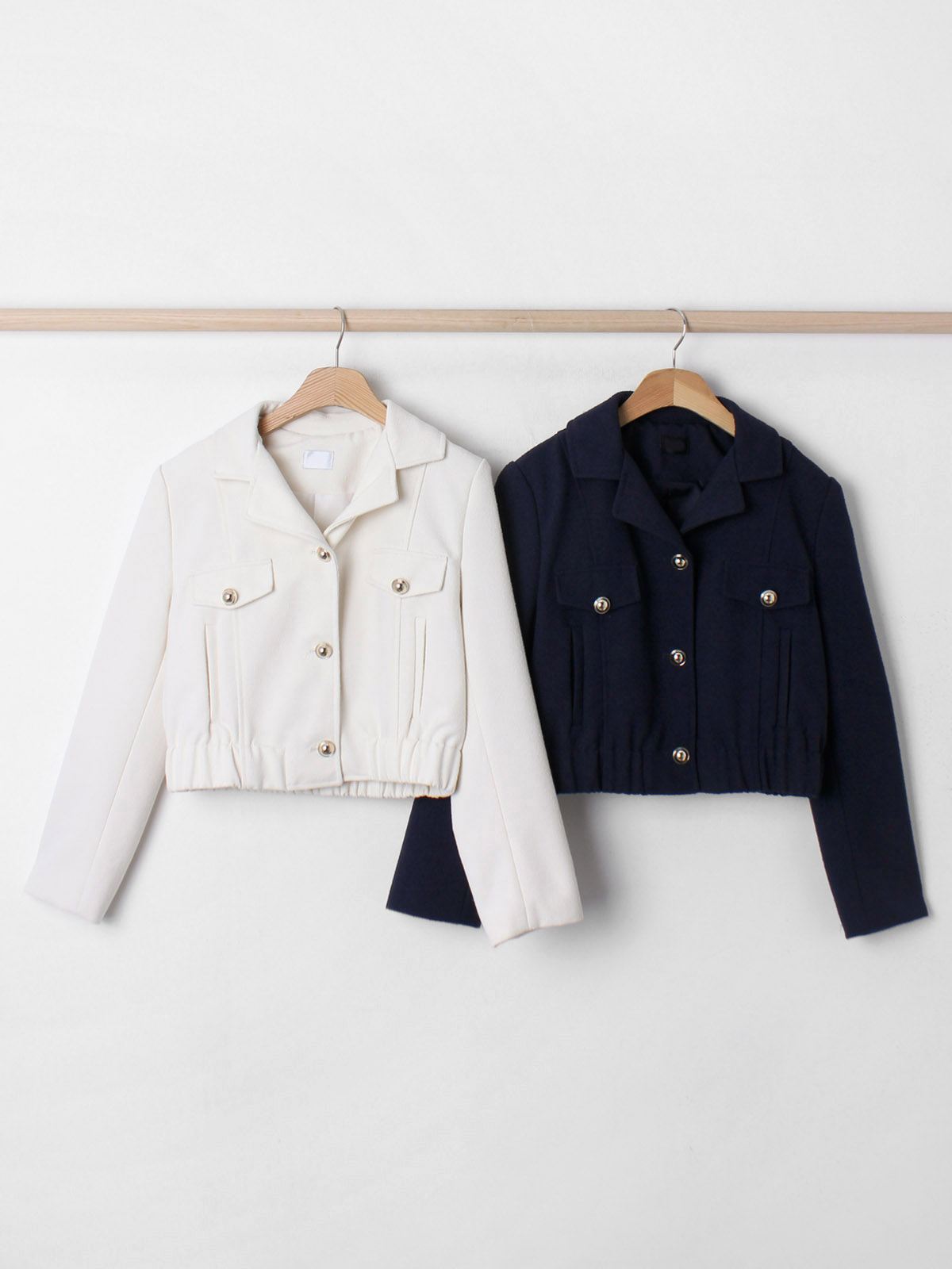 베이지한 컬러 구성에 골드 버튼 포인트가 있으며 크롭한 기장감으로