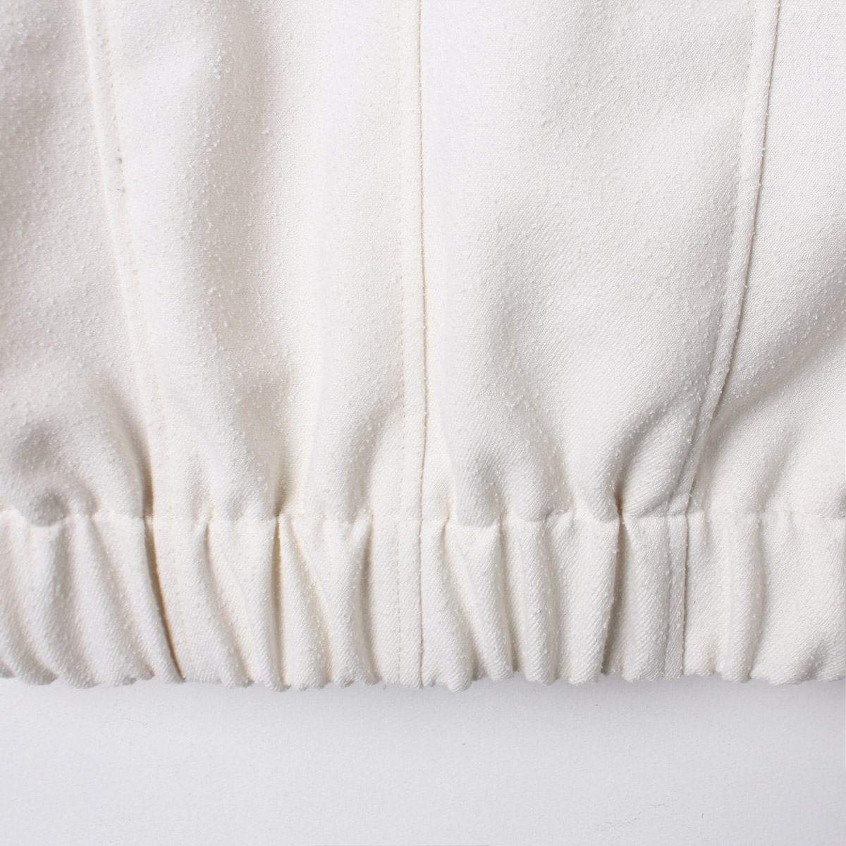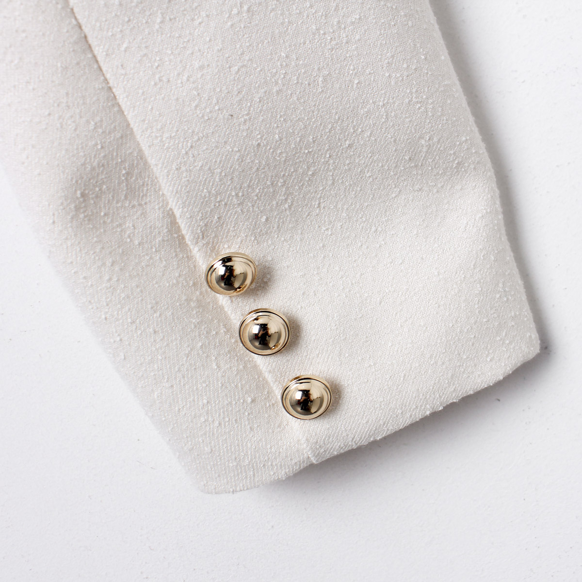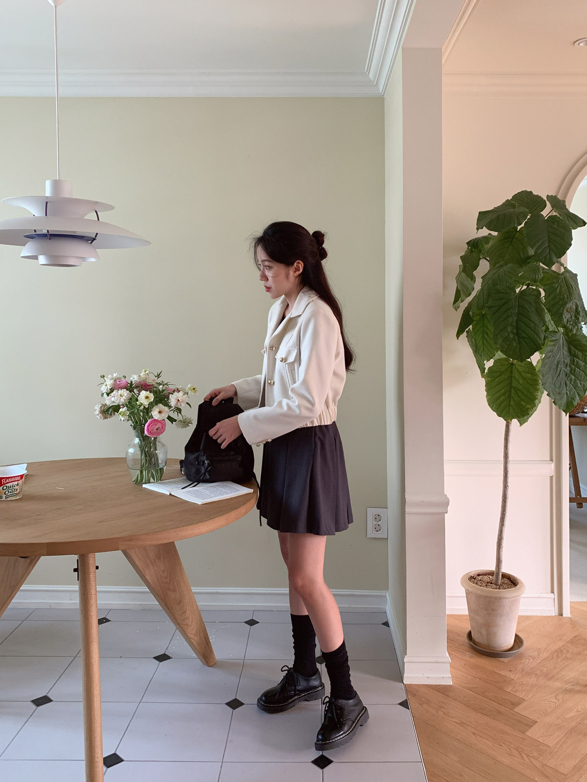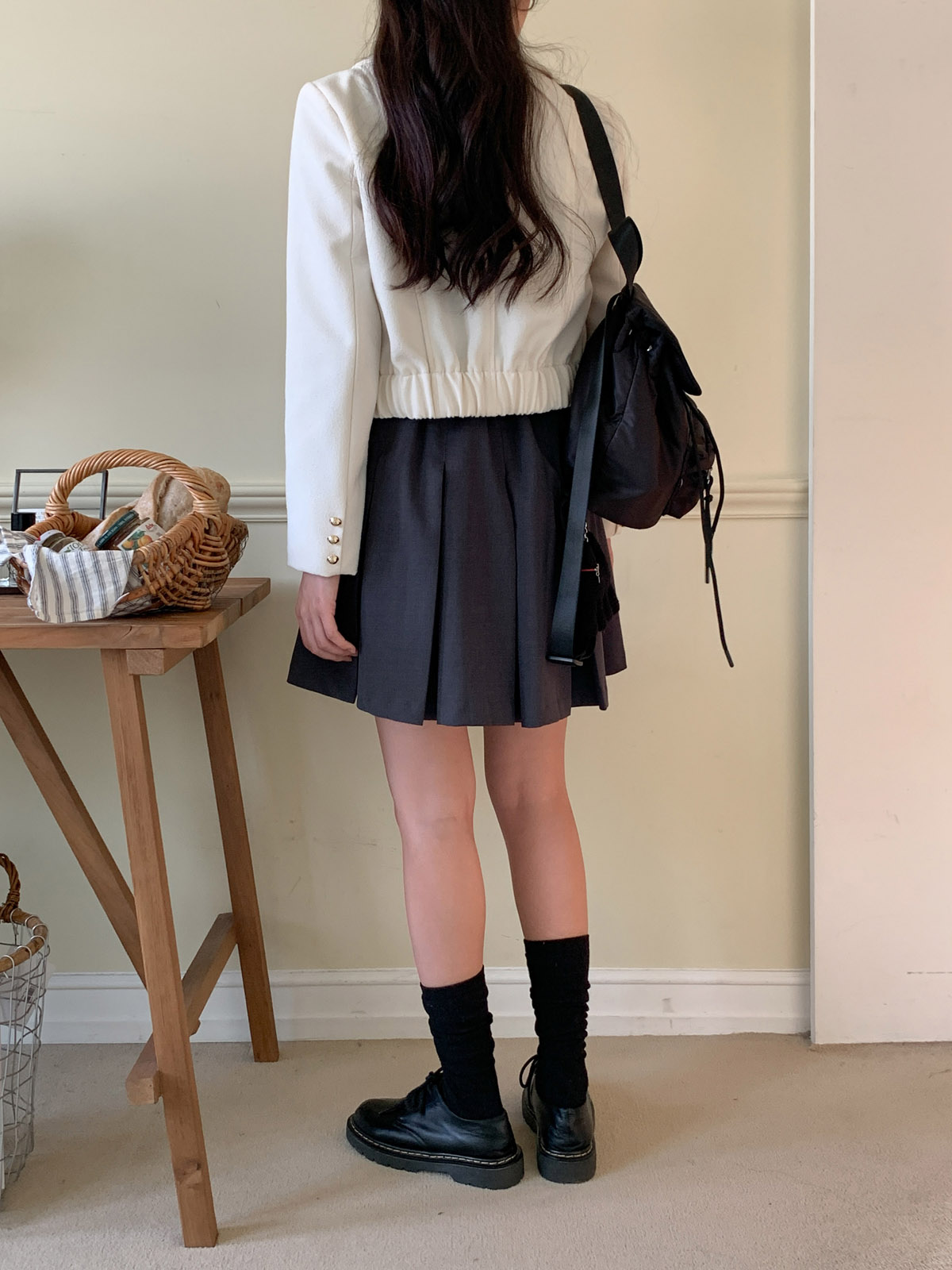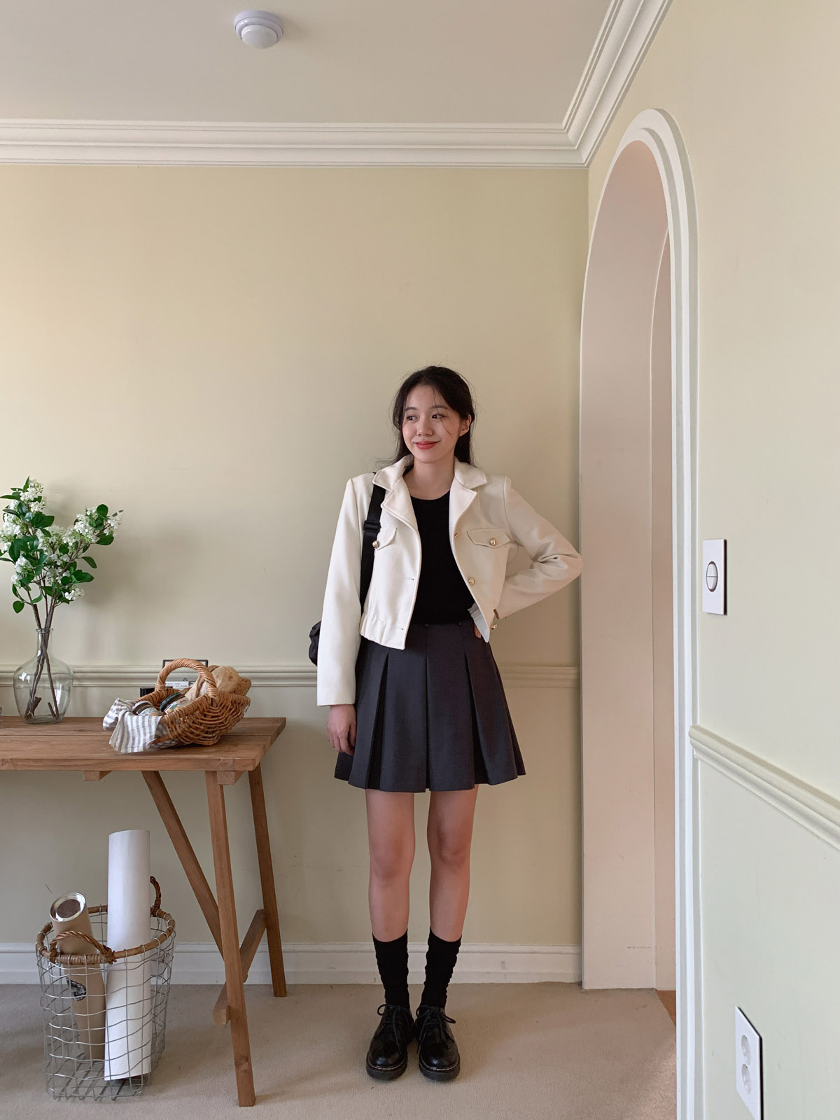 베이지한 컬러 구성에 골드 버튼 포인트가 있으며 크롭한 기장감으로
