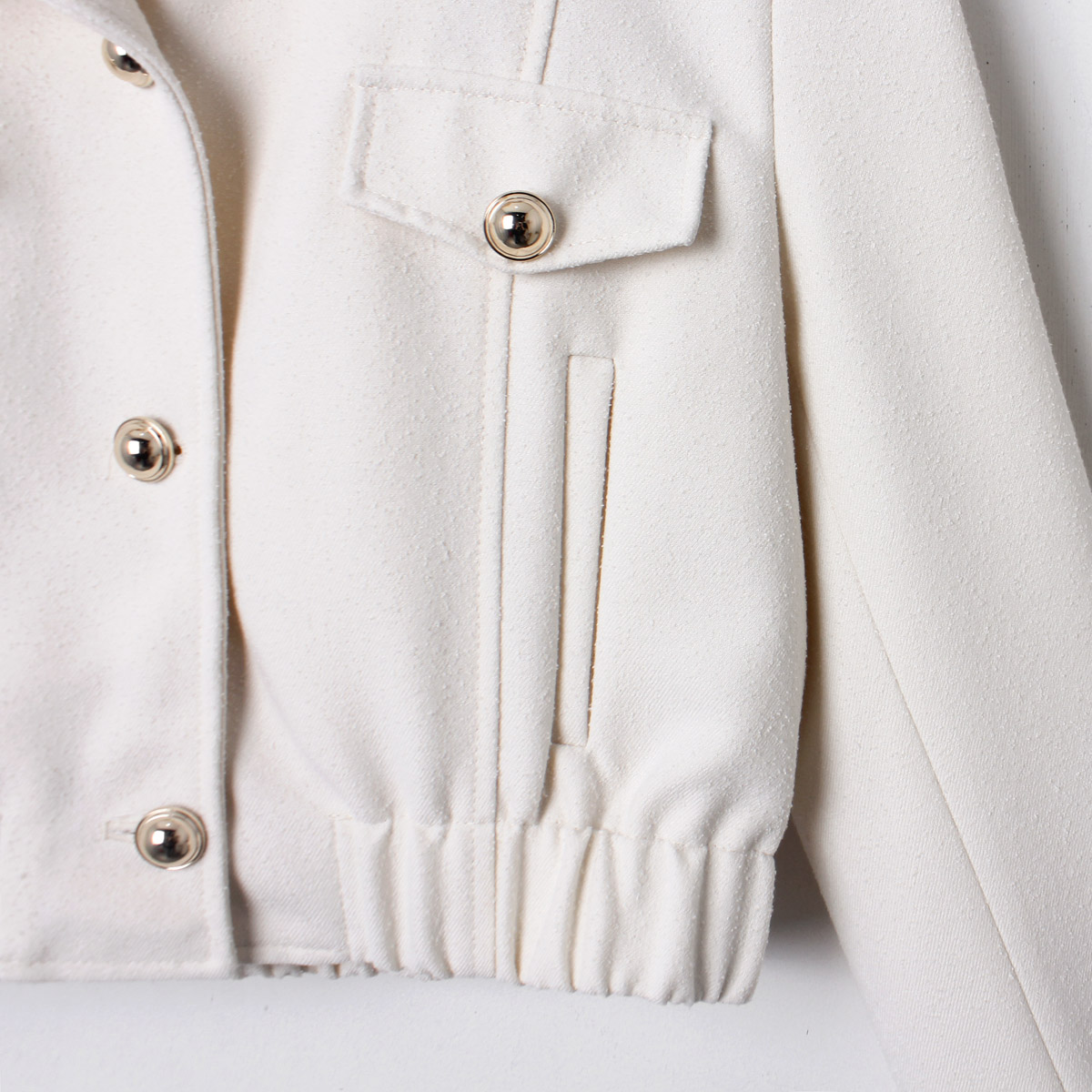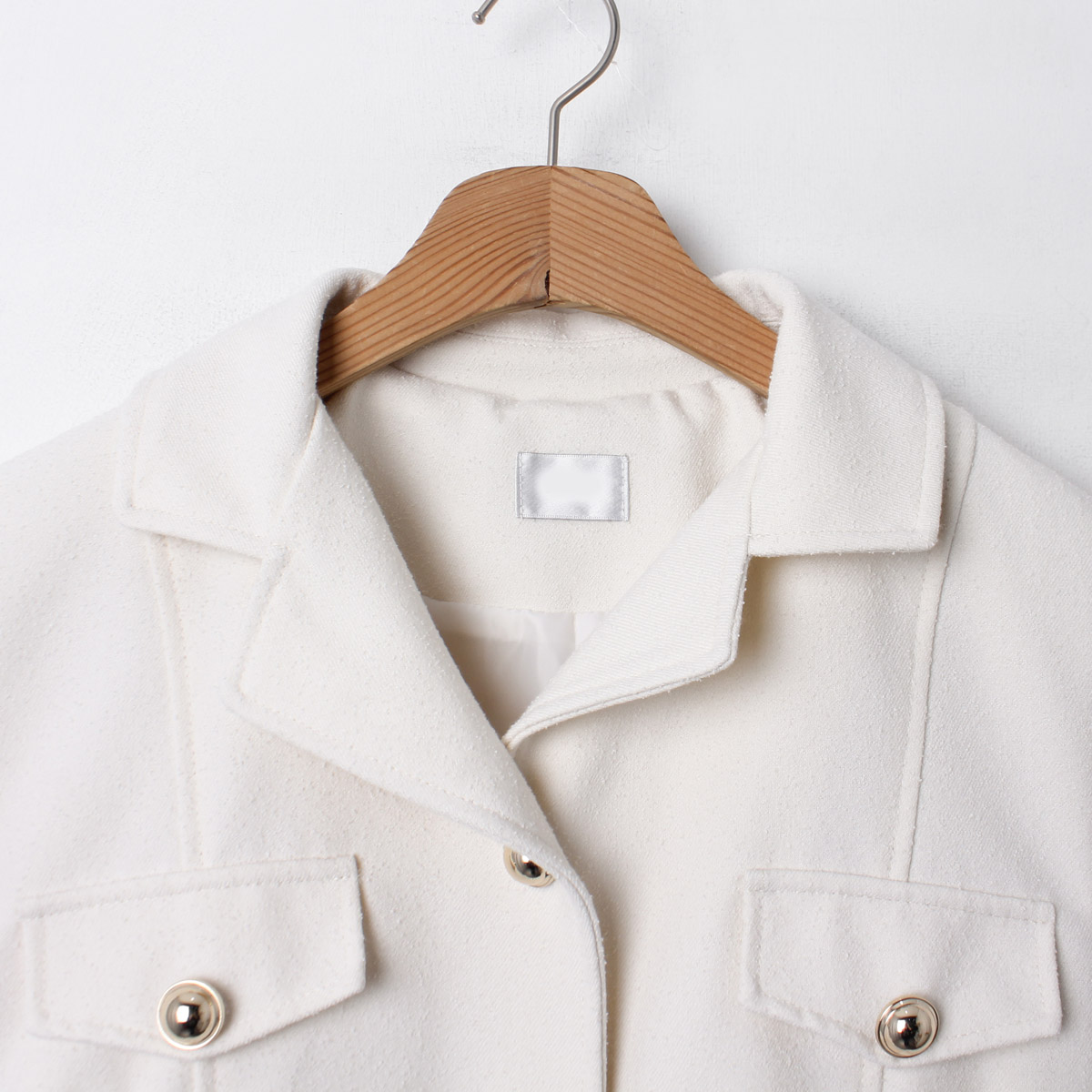 어깨 부분에 패드가 내장 되어 있어 직각 어깨 연출을 해주며 , 베이지한 컬러 구성에 골드 버튼 포인트가 있으며 크롭한 기장감으로 하이웨스트 하의와 매치해서 스타일리쉬하게 착용이 가능한 코자켓