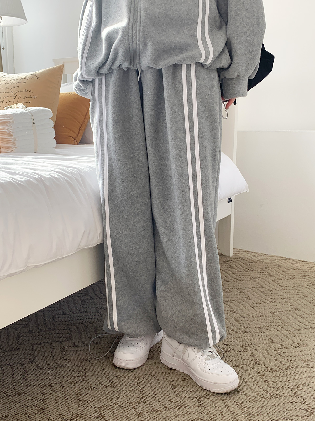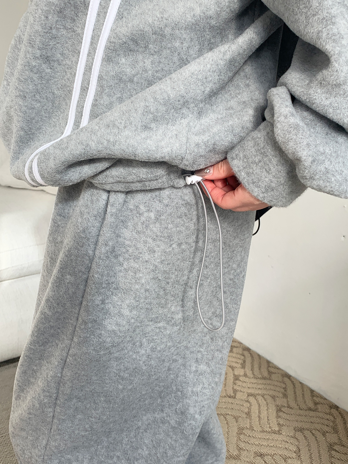 밑단에 스트링이 있어 원하는 핏 조절을 할 수 있으며, 넉넉한 와이드 핏에 팬츠에 편안하게 착용이 가능한 트레이닝세트