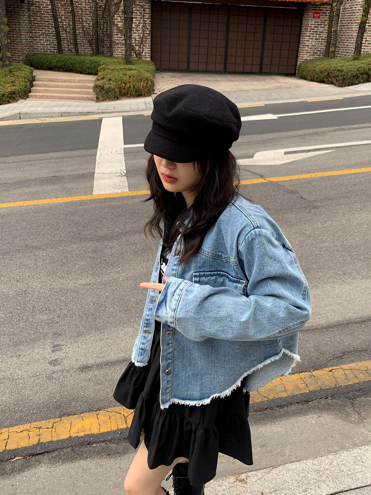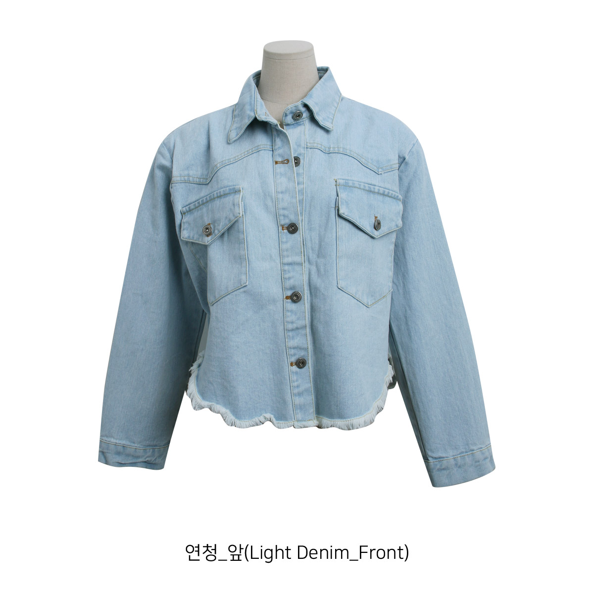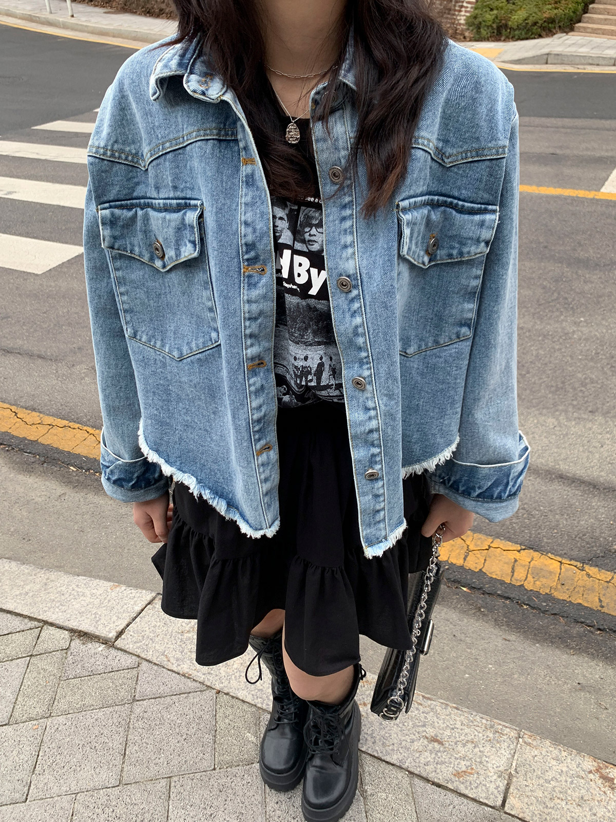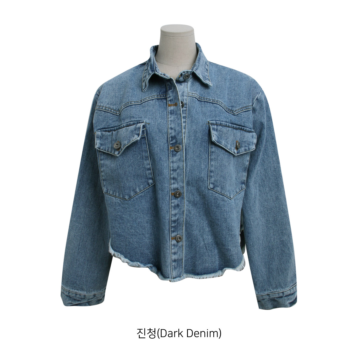 [ JK5585K42-메일르 빈티지 컷팅 언발 세미 크롭 청자켓 ]