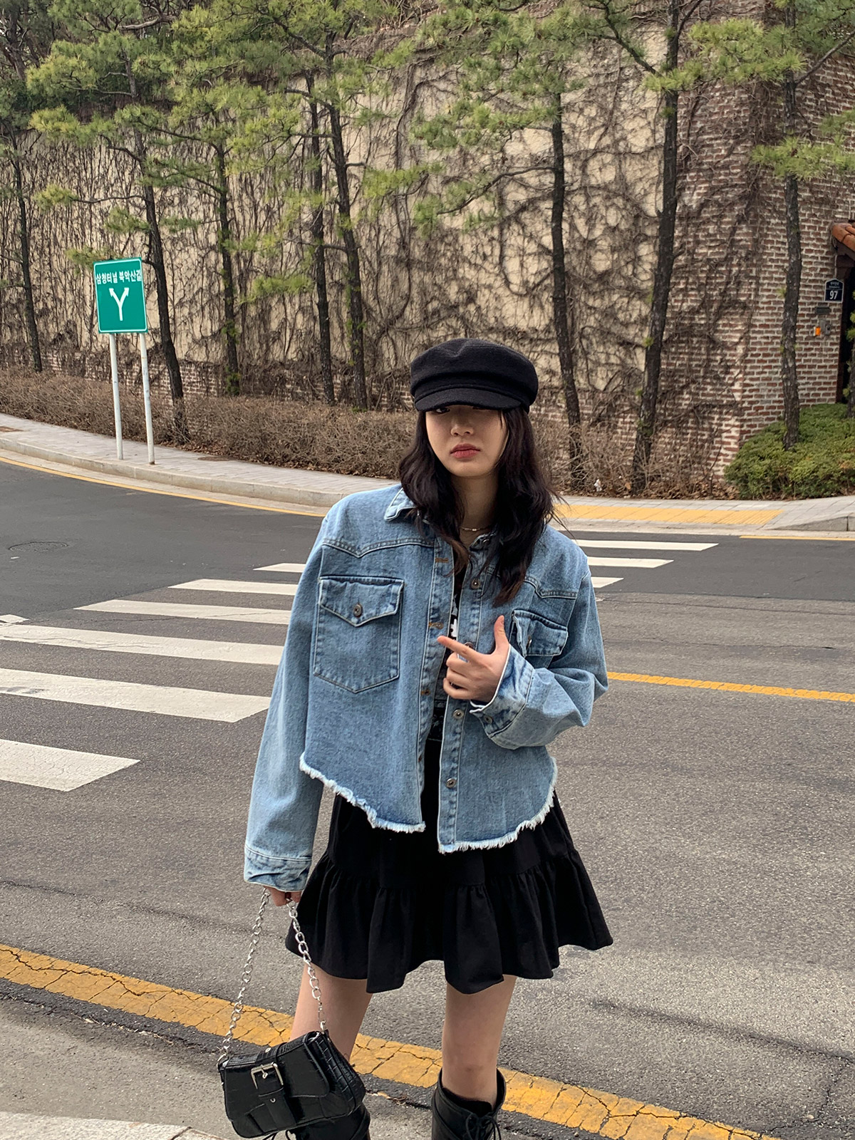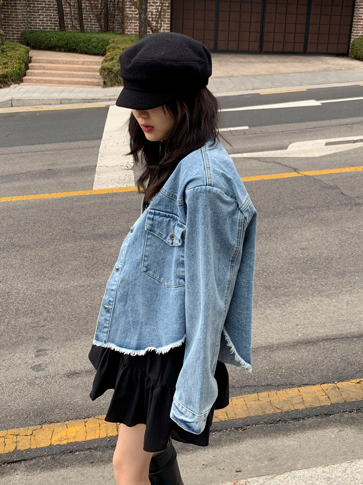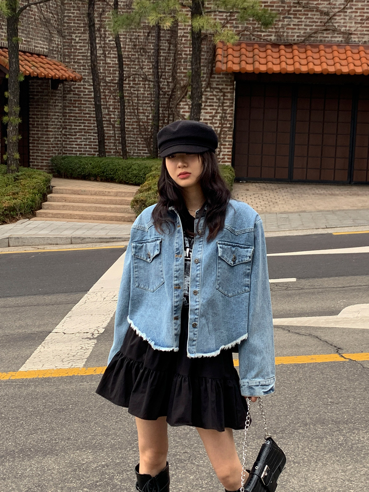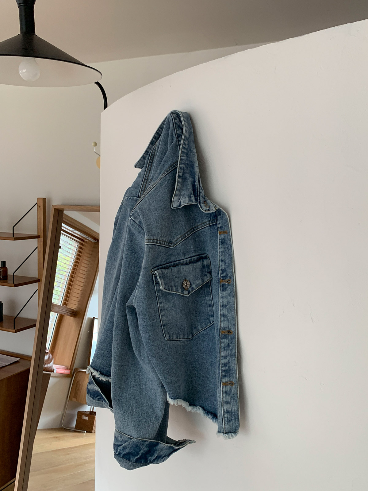 [ JK5585K42-메일르 빈티지 컷팅 언발 세미 크롭 청자켓 ]