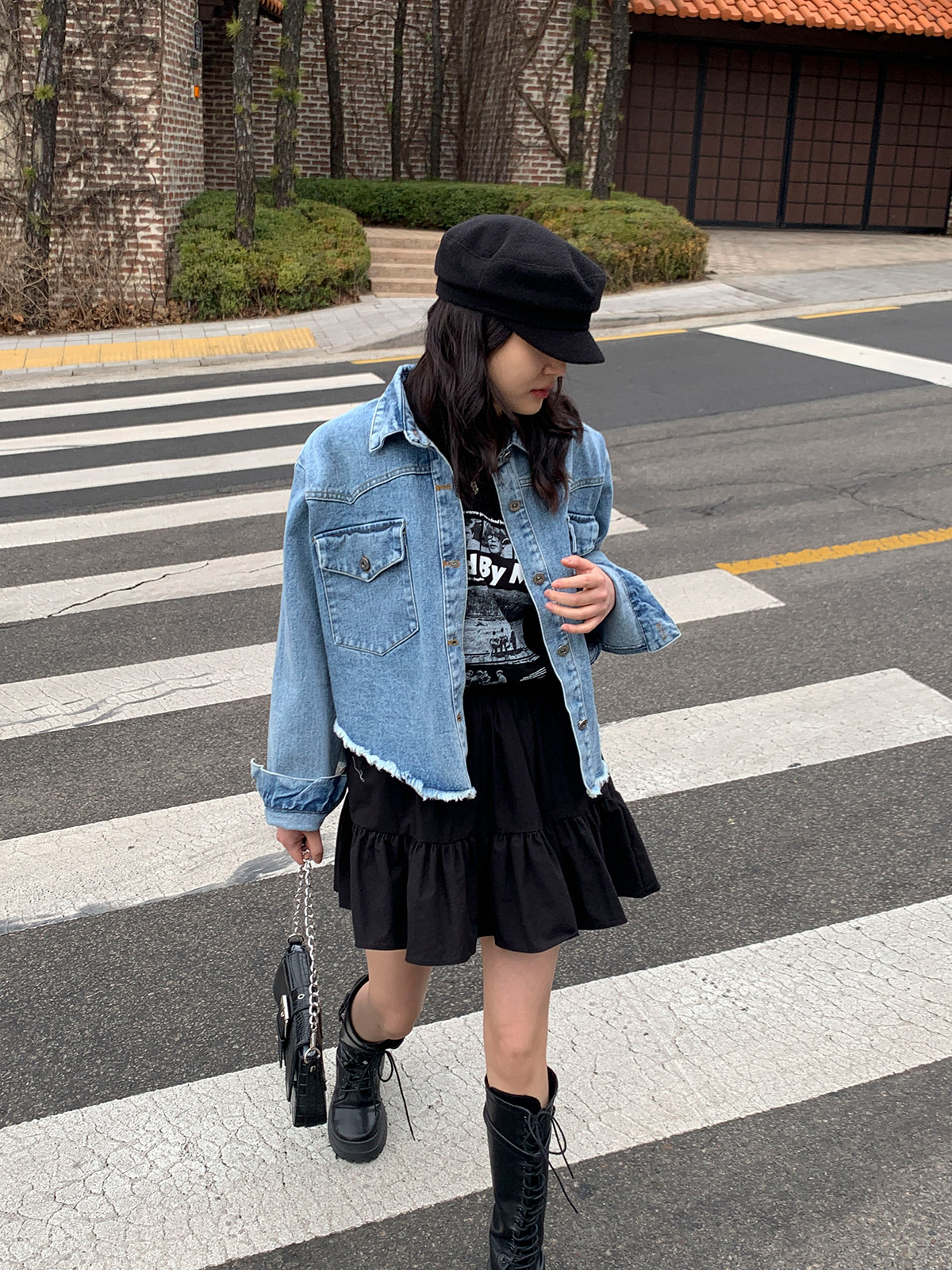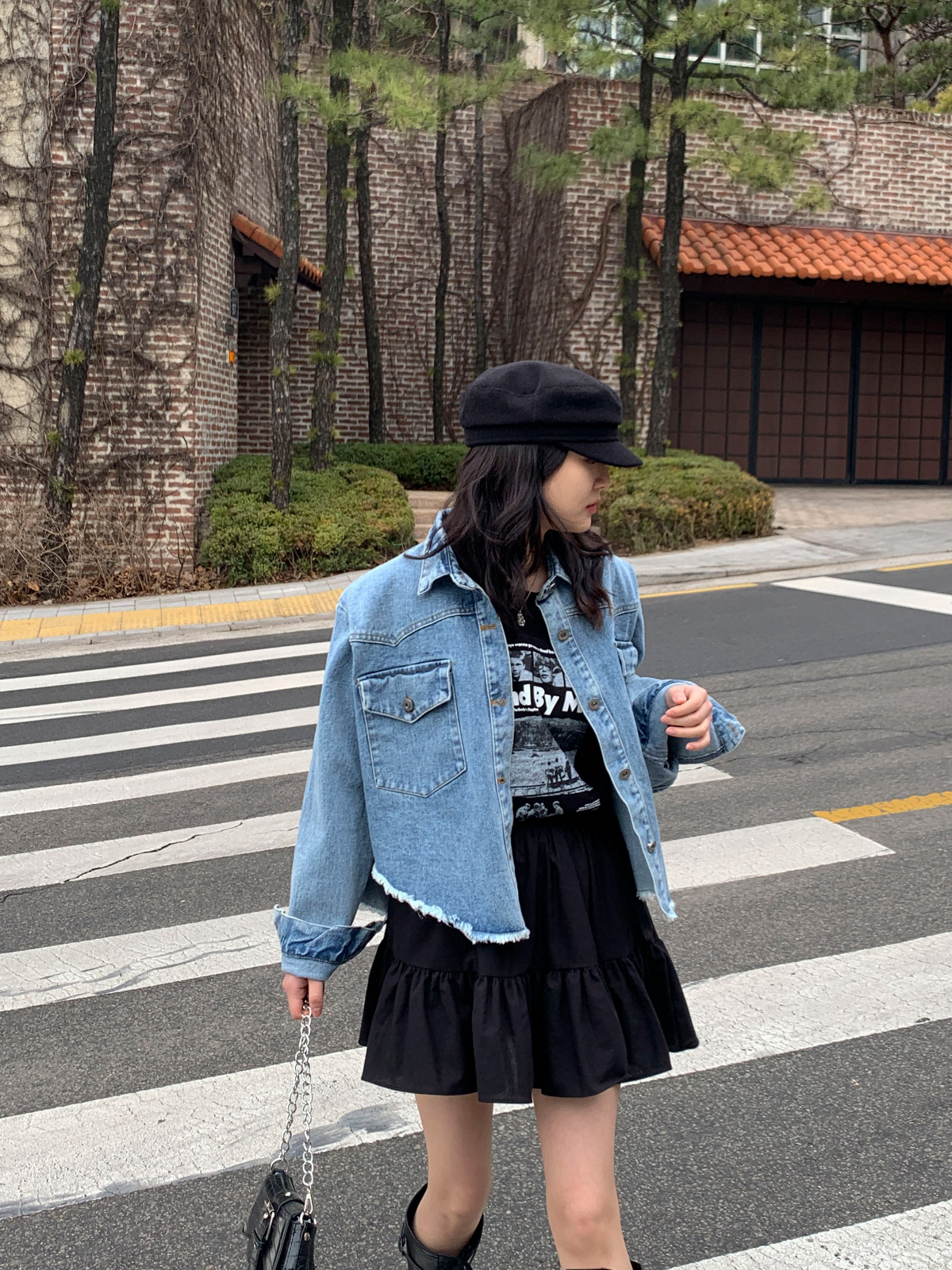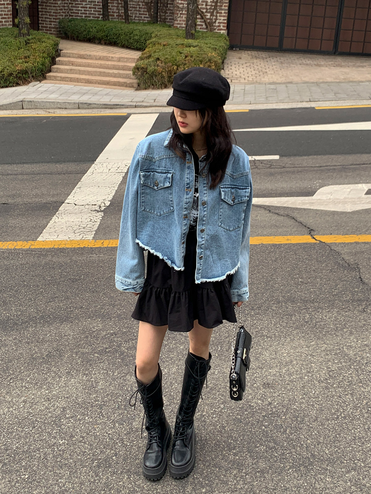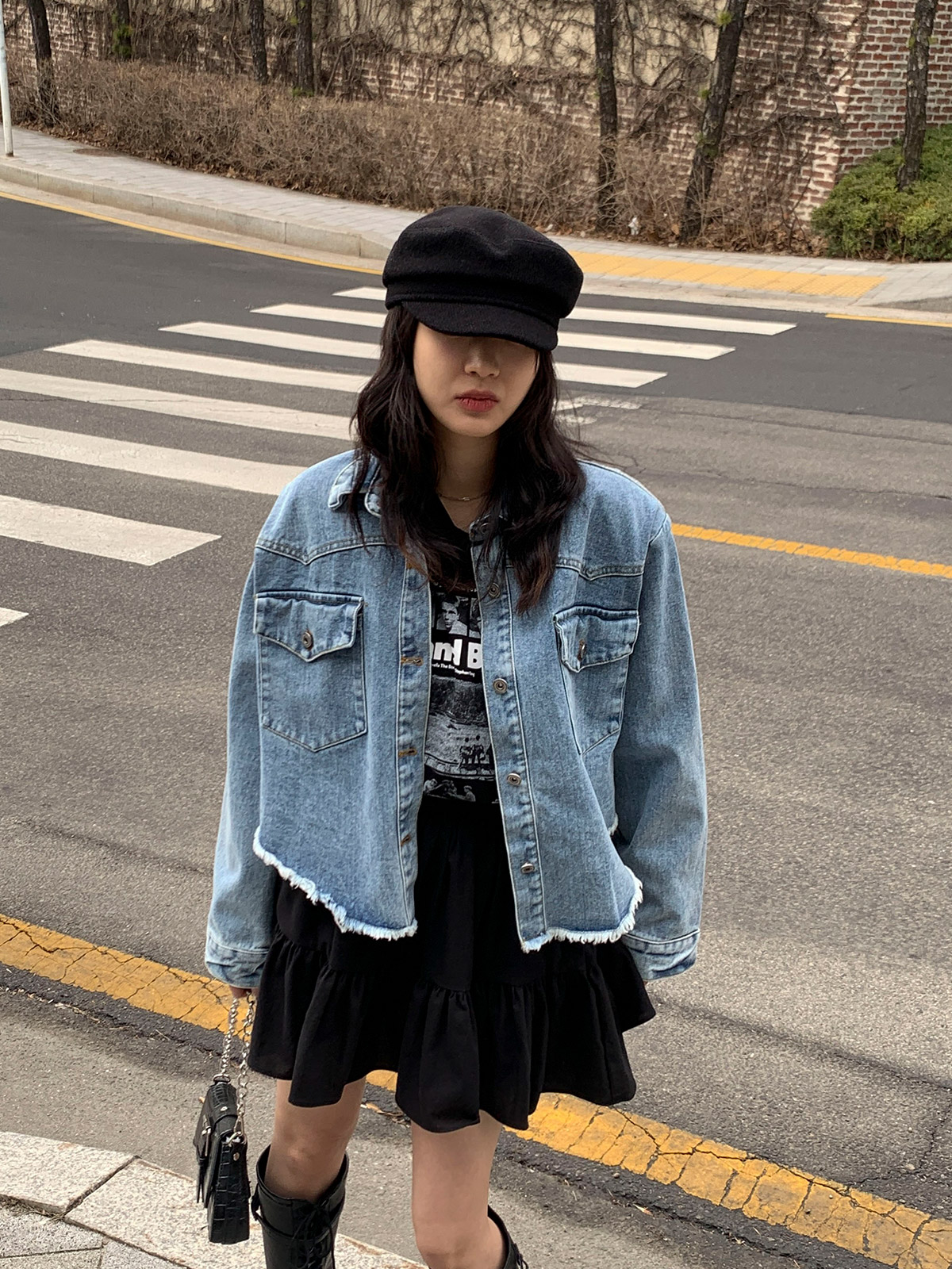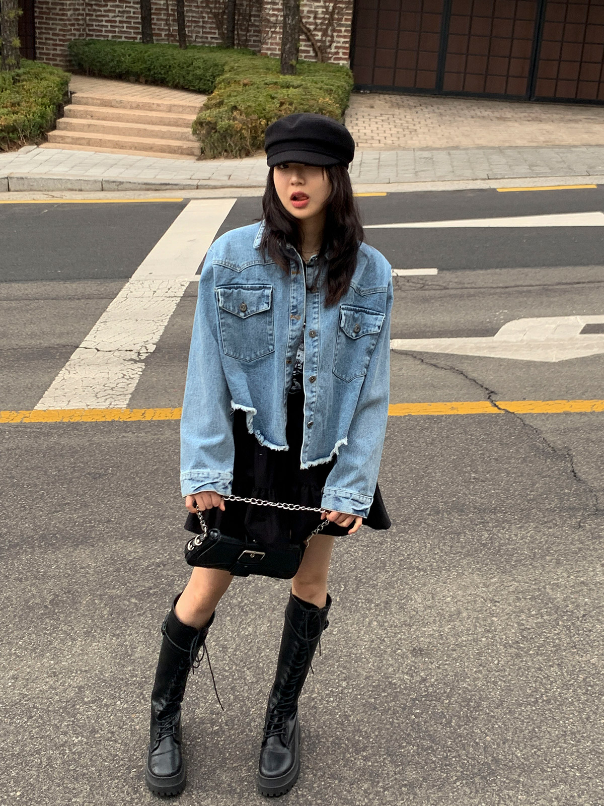 [ JK5585K42-메일르 빈티지 컷팅 언발 세미 크롭 청자켓 ]