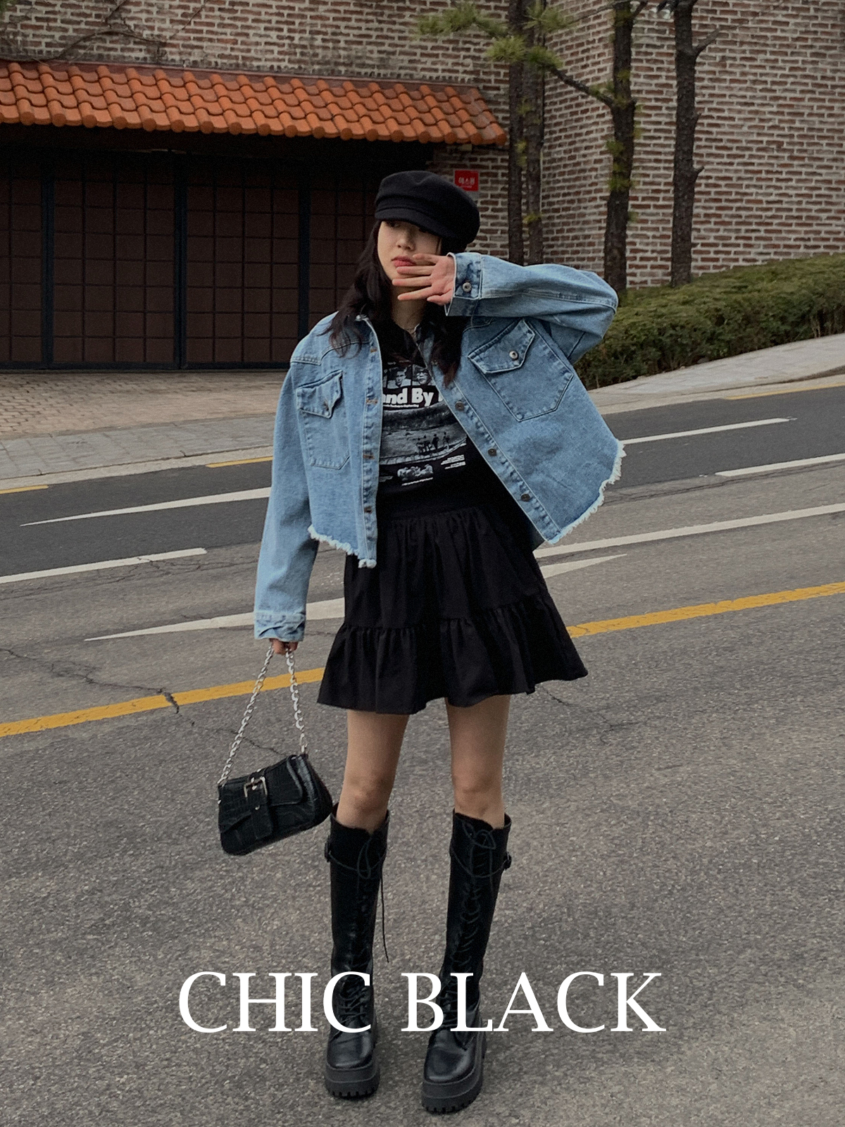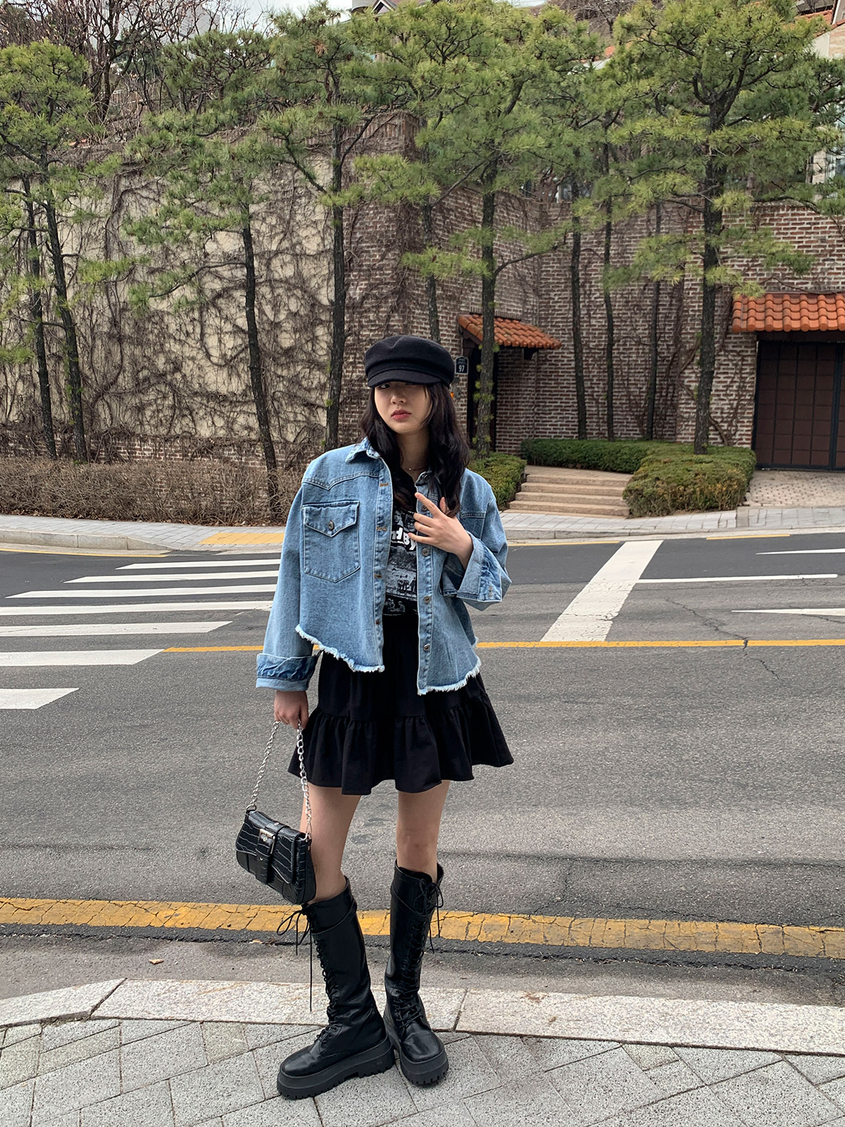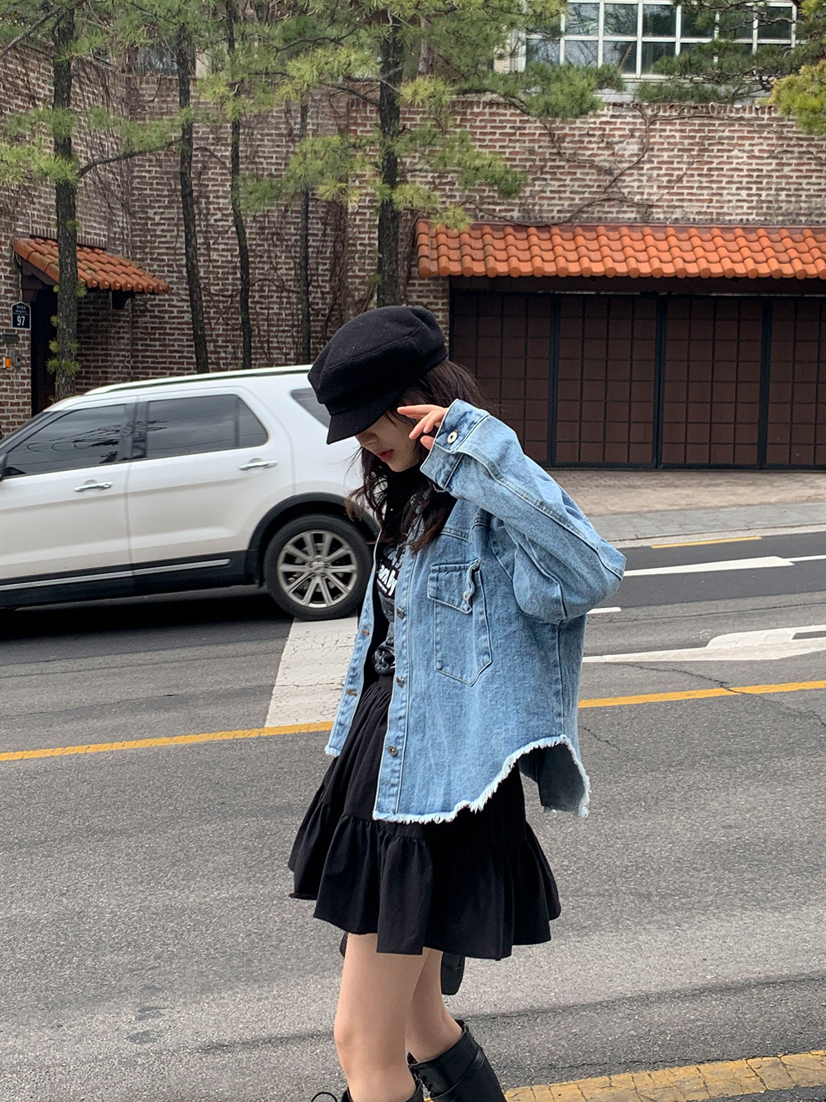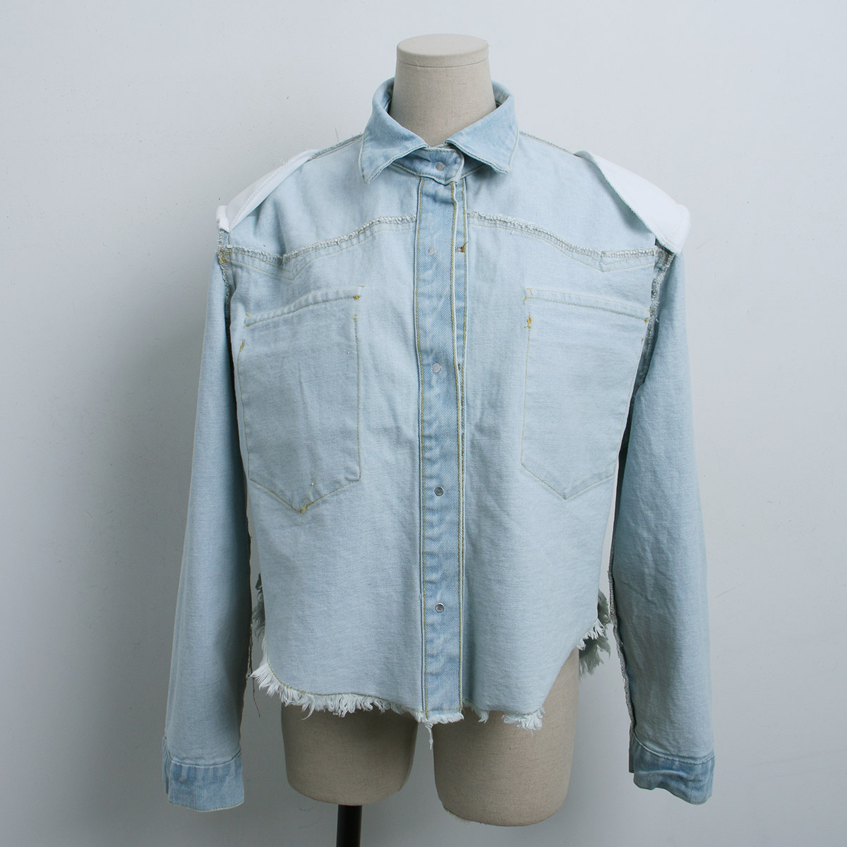 [ JK5585K42-메일르 빈티지 컷팅 언발 세미 크롭 청자켓 ]