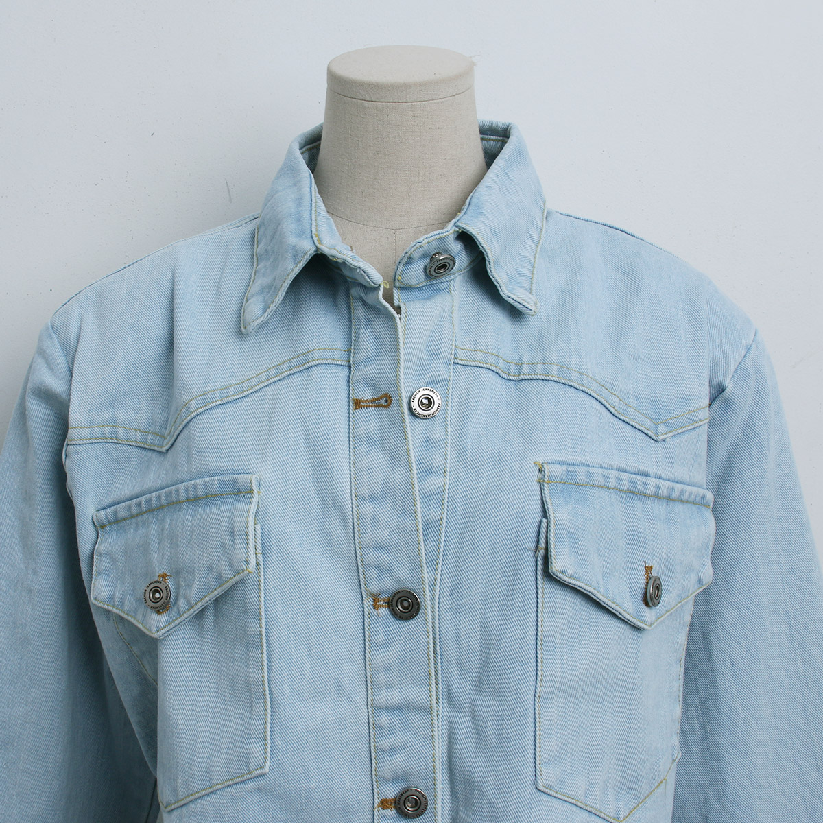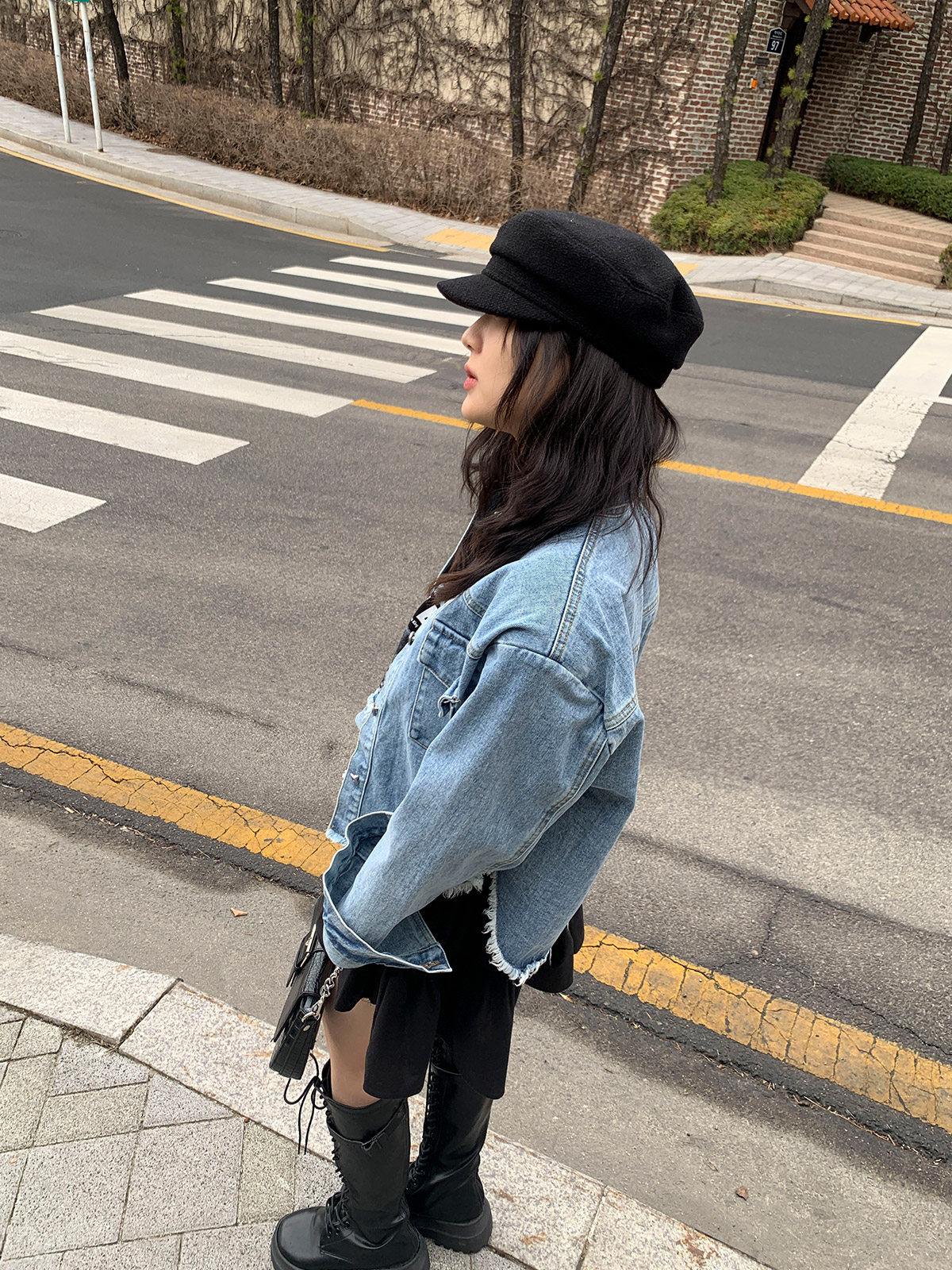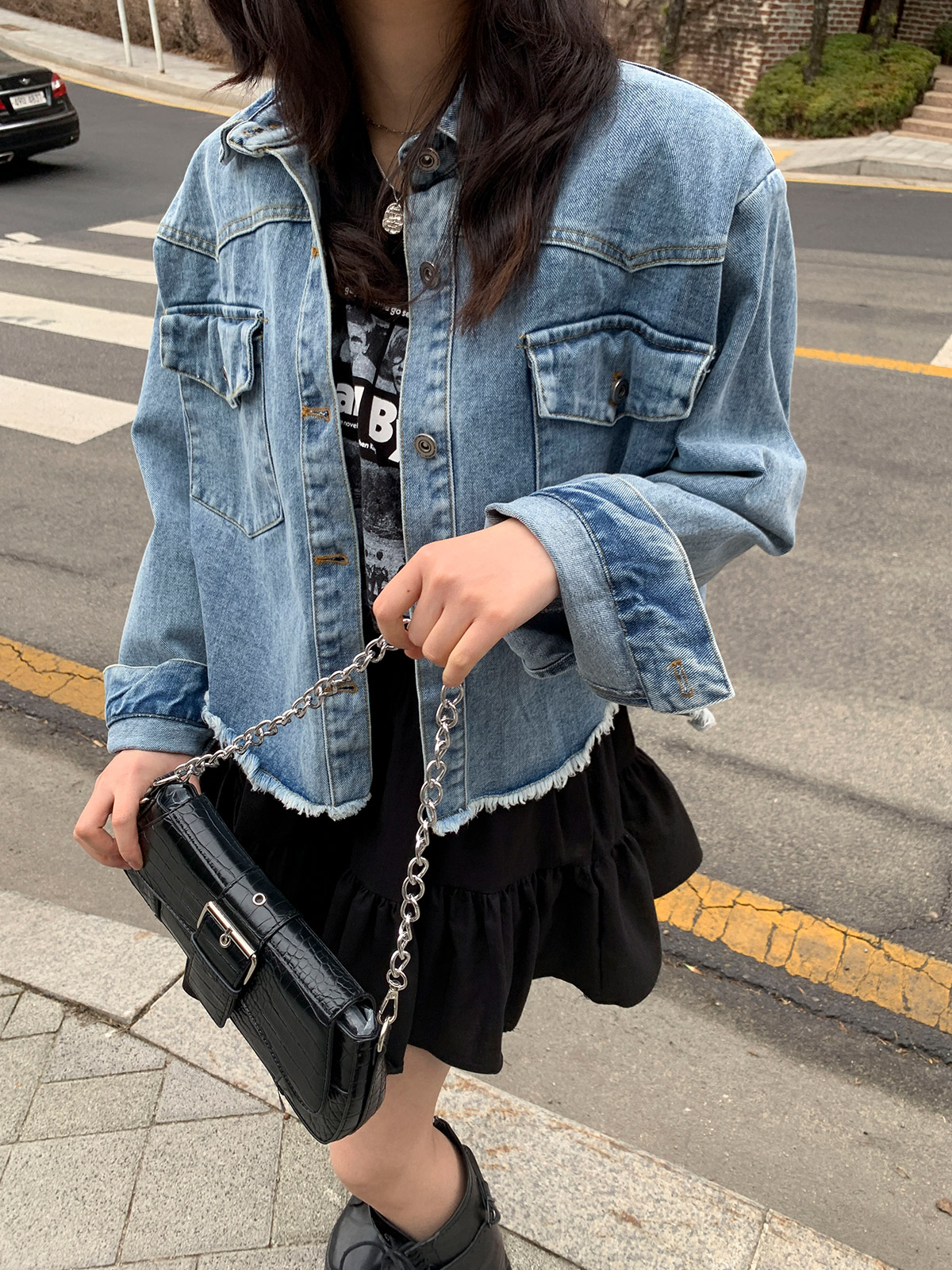 어깨 패드가 들어가있어 자켓의 핏을 예쁘게 잡아주며 빈티지한 디자인의 세미 크롭 기장으로 룩을 스타일리쉬하게 연출하기 좋은 청자켓