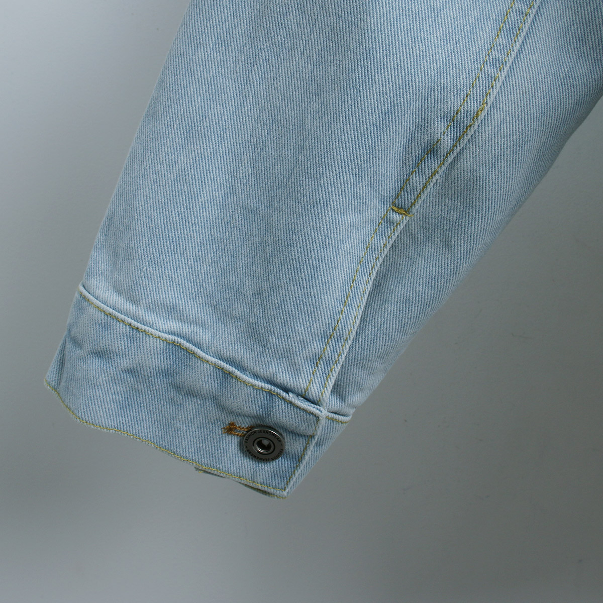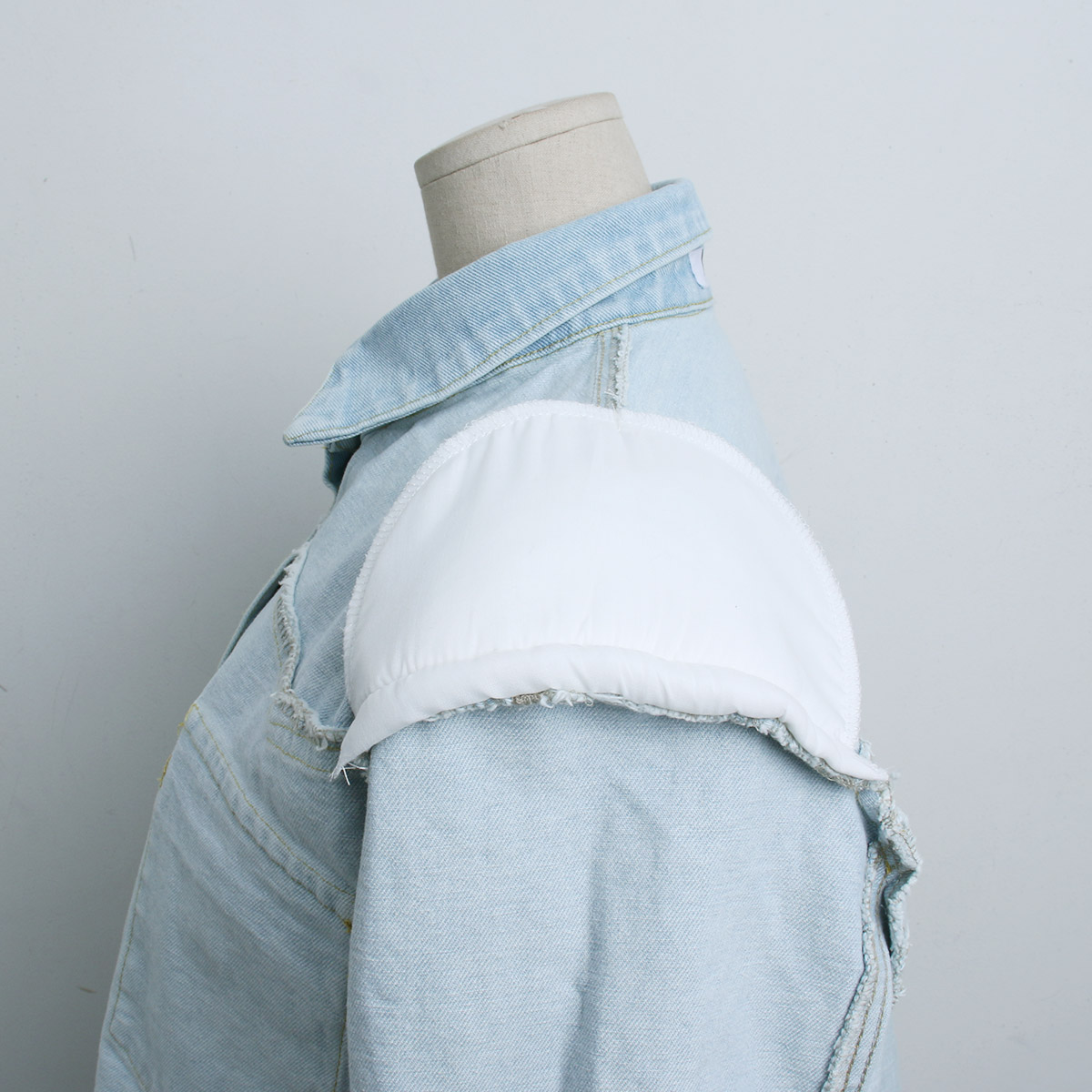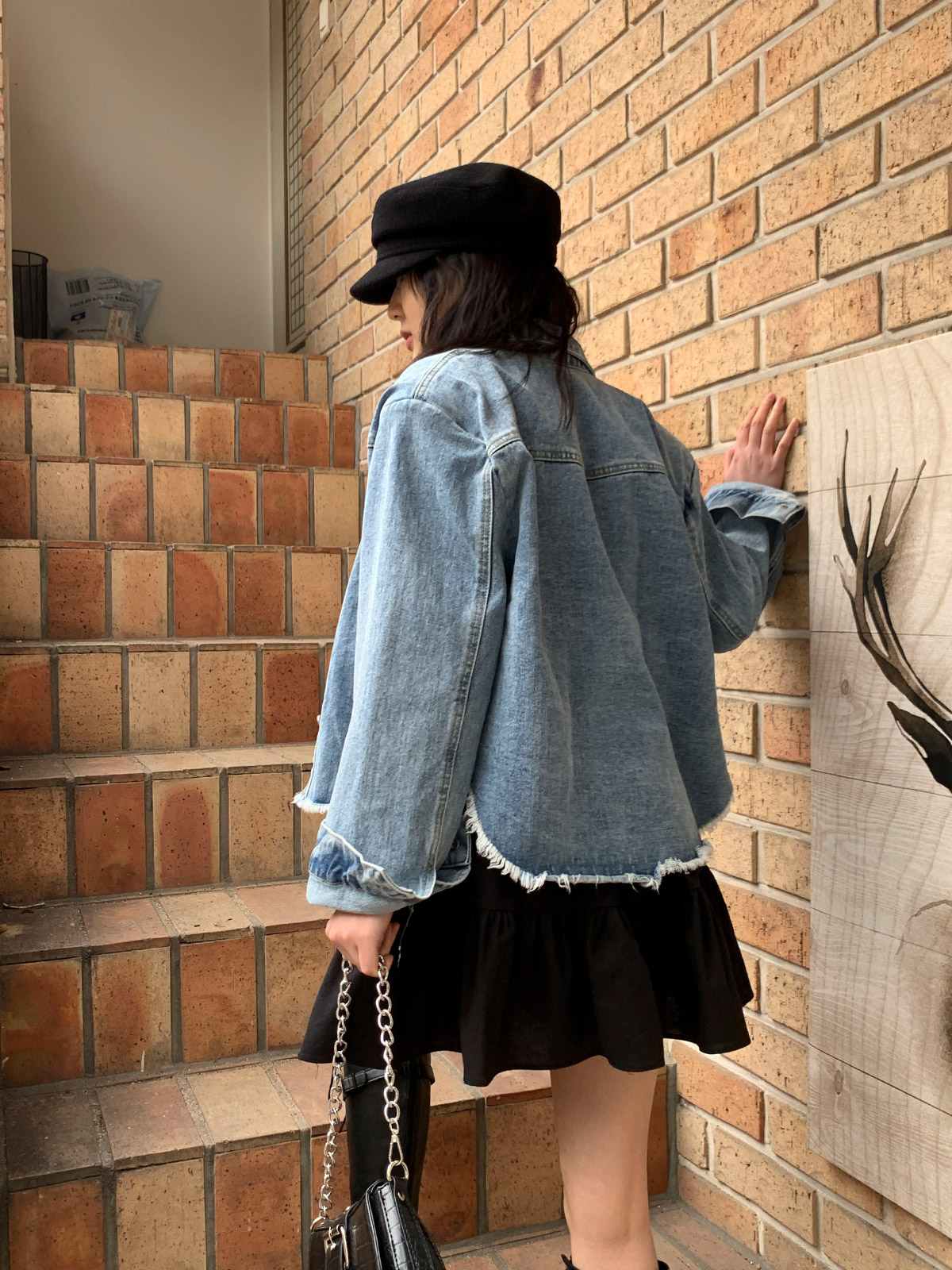 어깨 패드가 들어가있어 자켓의 핏을 예쁘게 잡아주며 빈티지한 디자인의 세미 크롭 기장으로 룩을 스타일리쉬하게 연출하기 좋은 청자켓