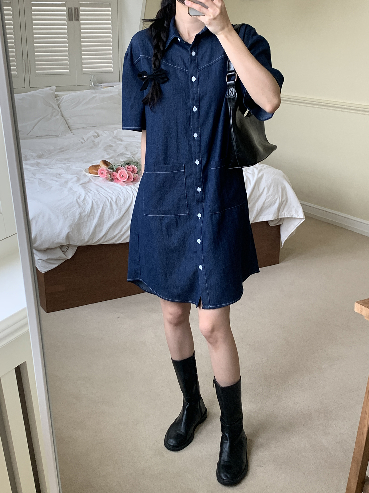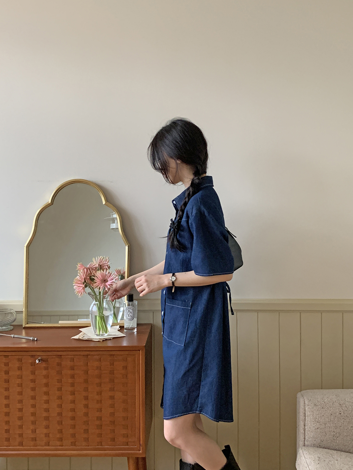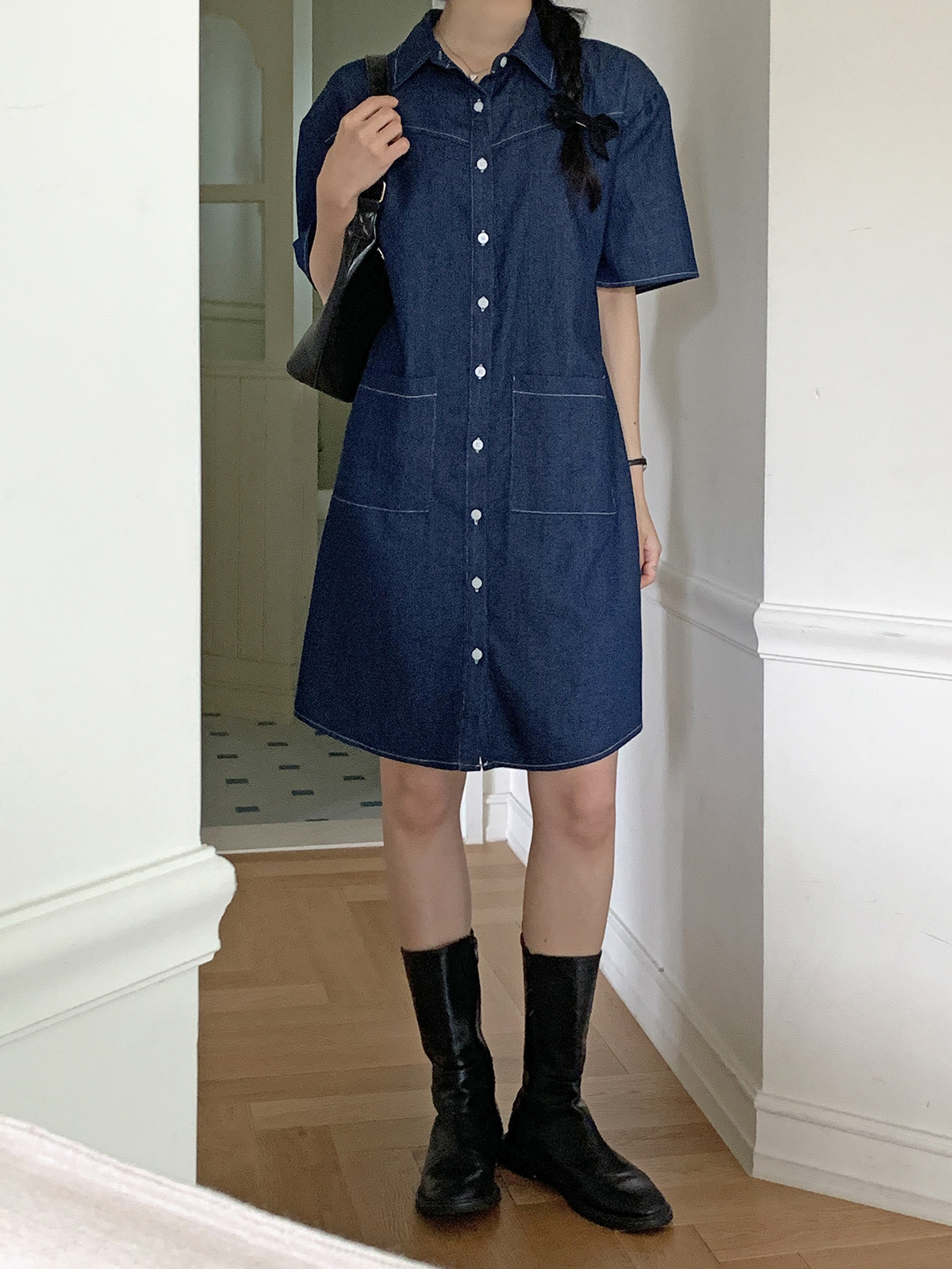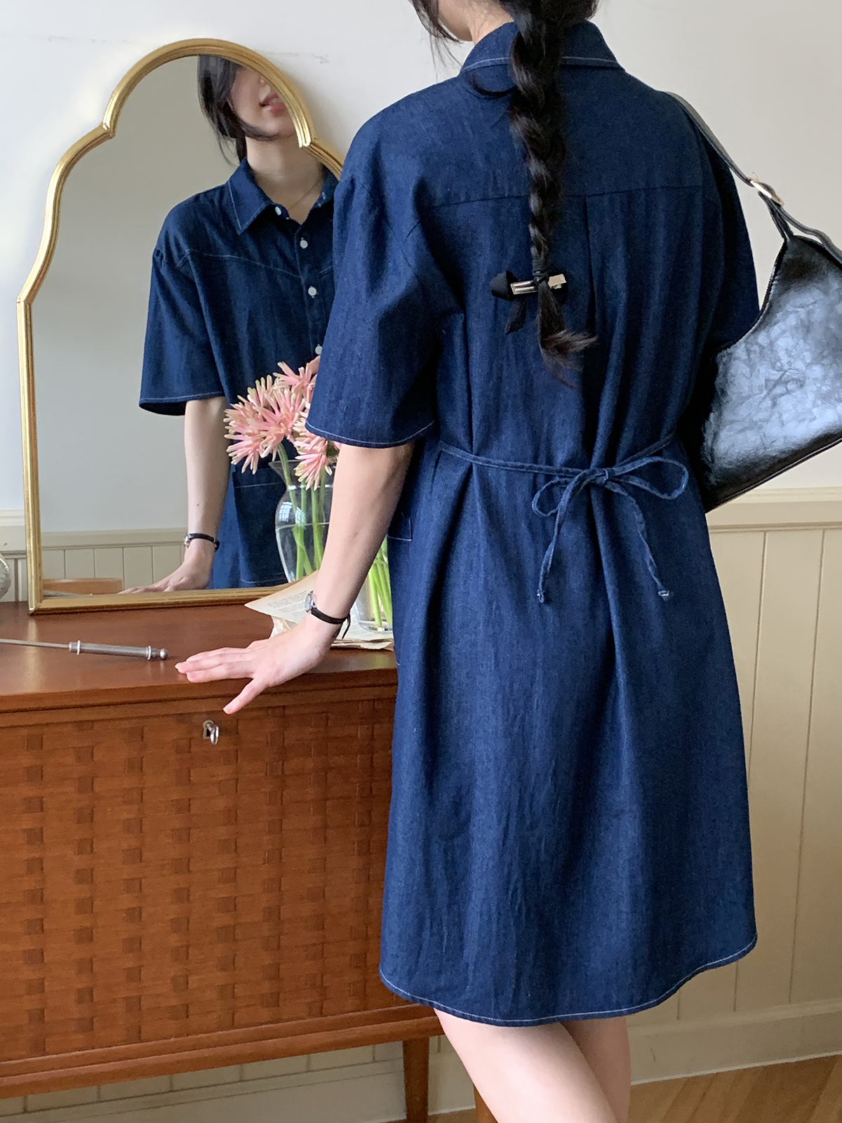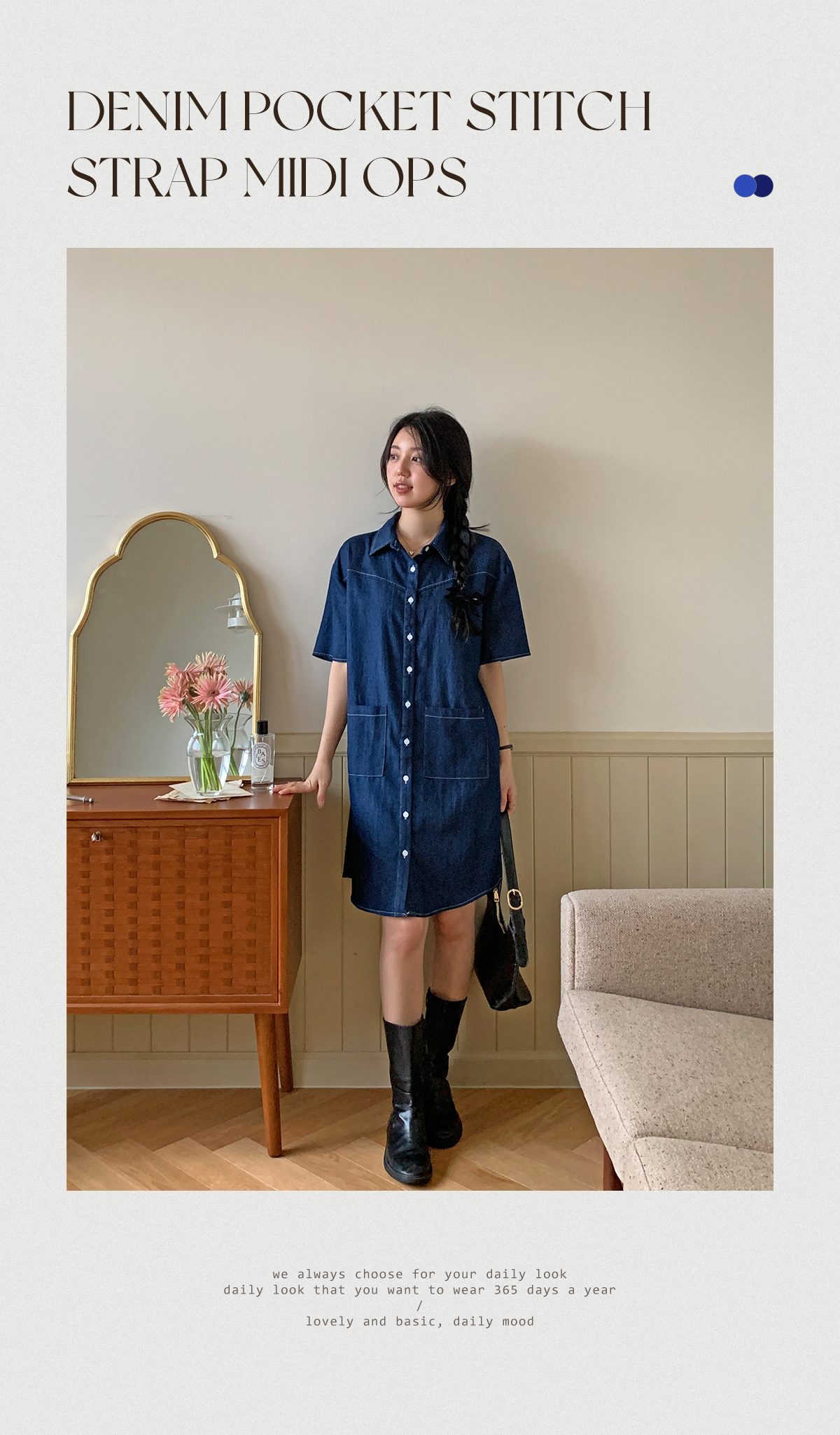 [ OPS9851K44-더페블 카라넥 데님 포켓 스티치 허리스트랩 미디원피스 ]