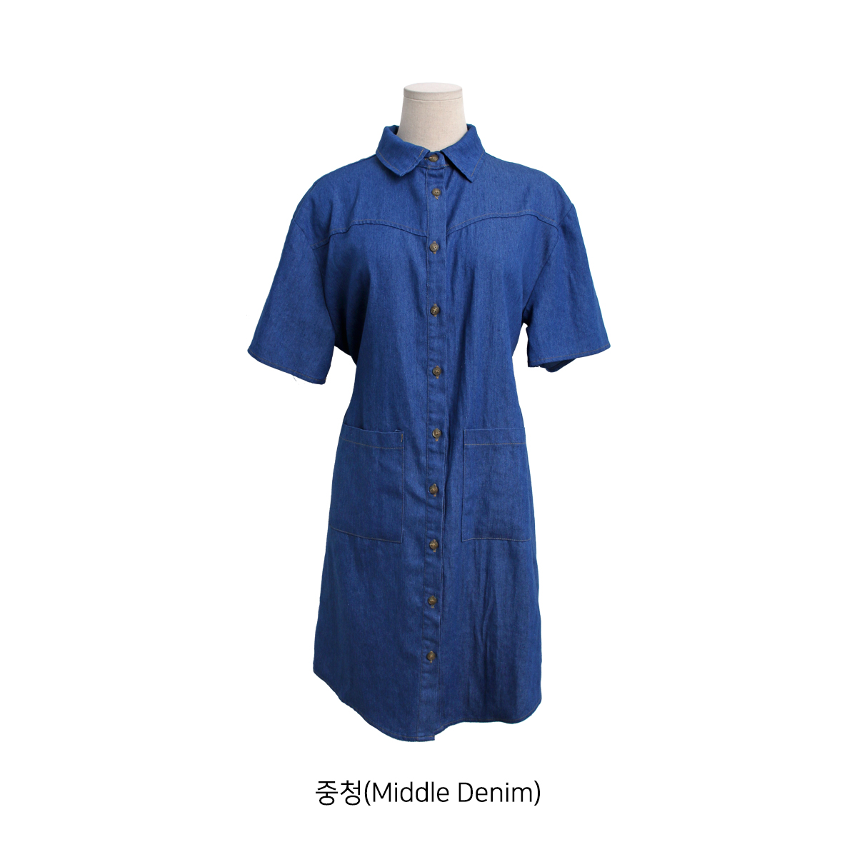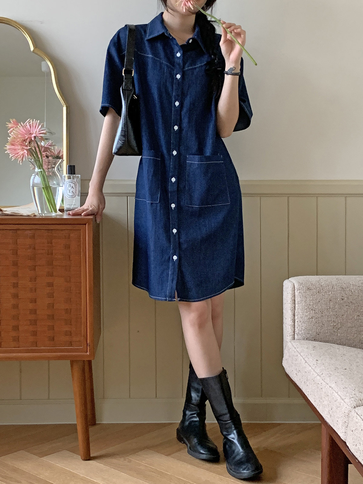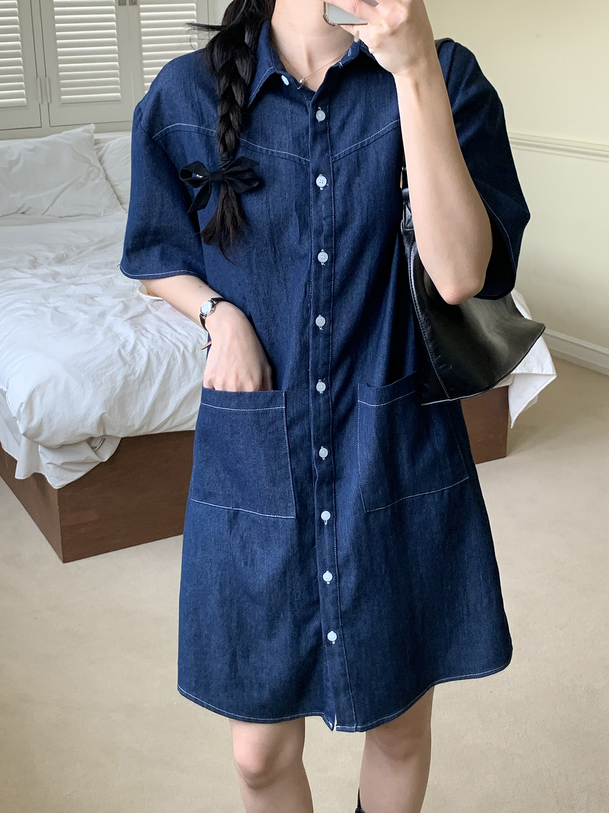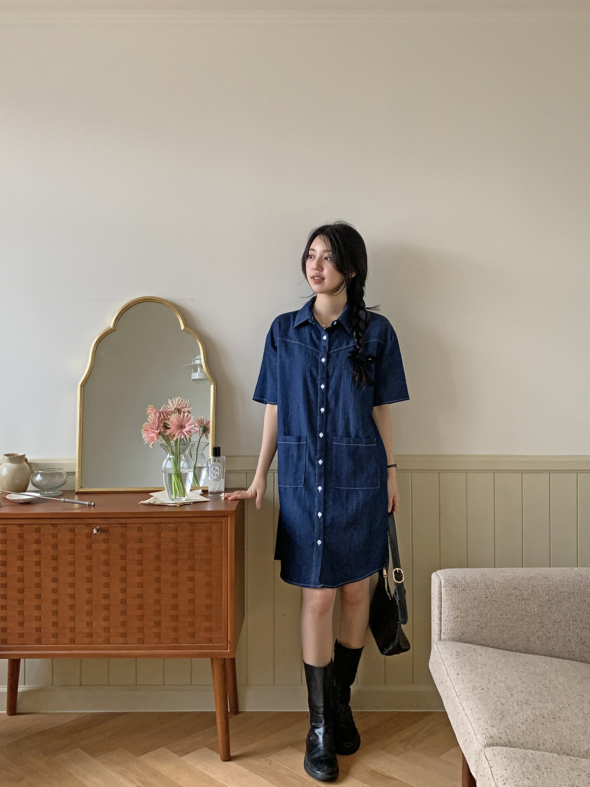 [ OPS9851K44-더페블 카라넥 데님 포켓 스티치 허리스트랩 미디원피스 ]