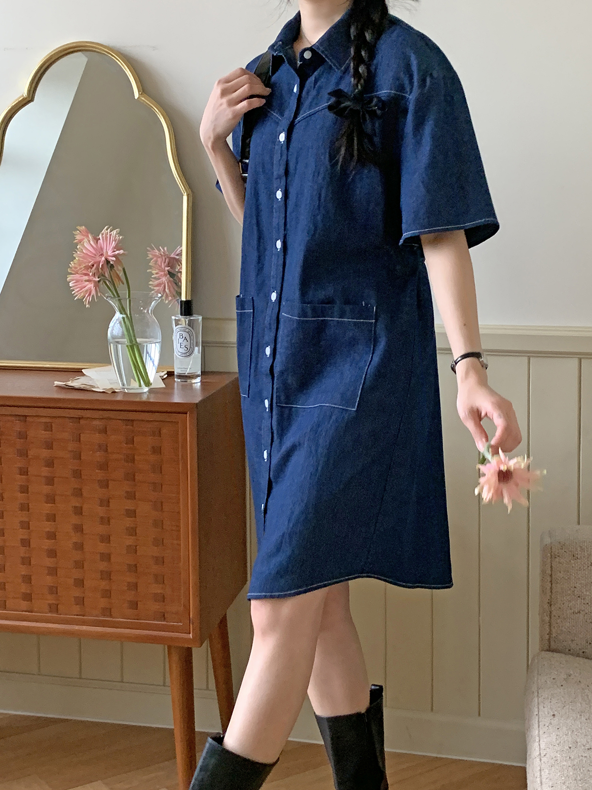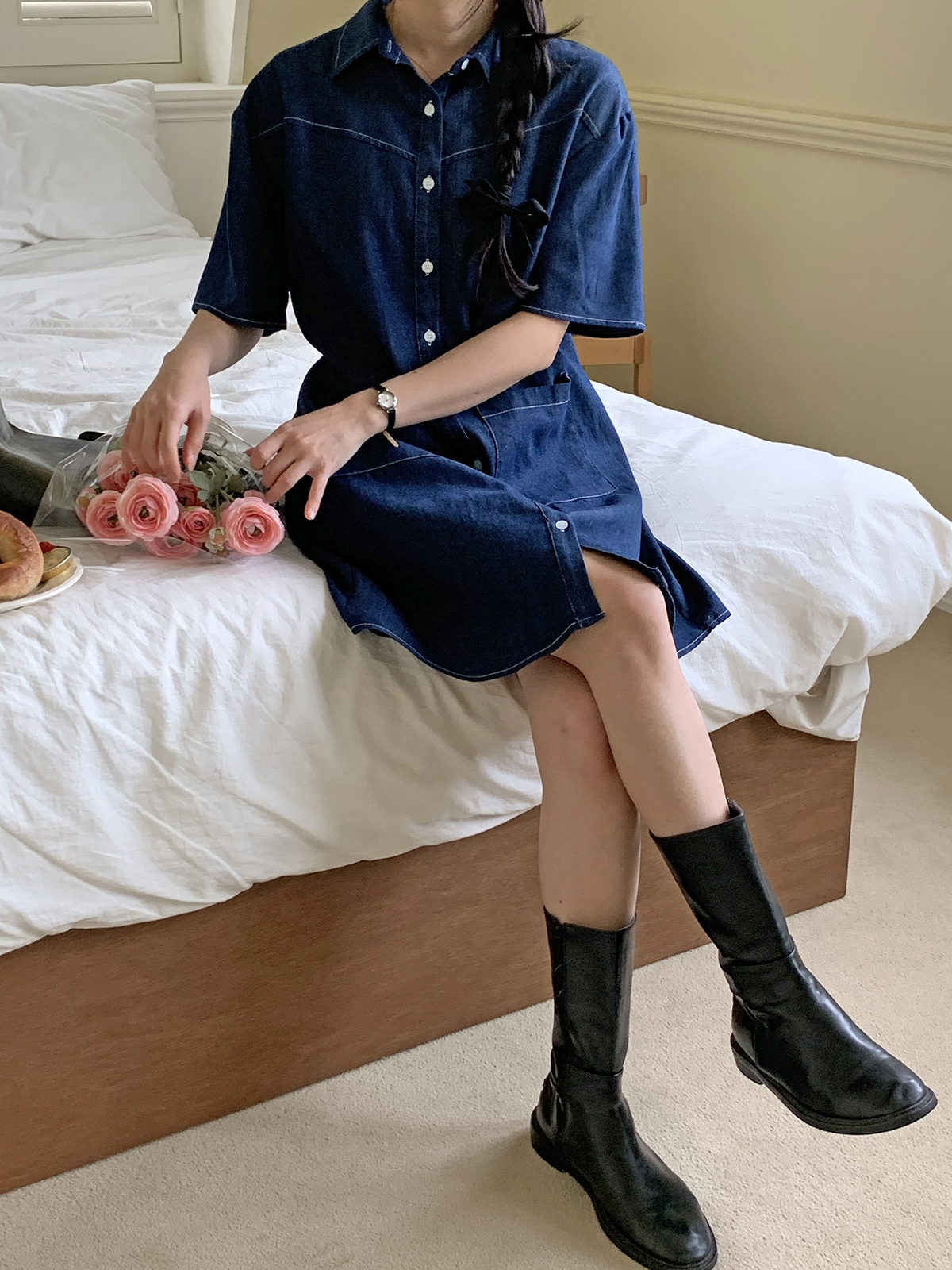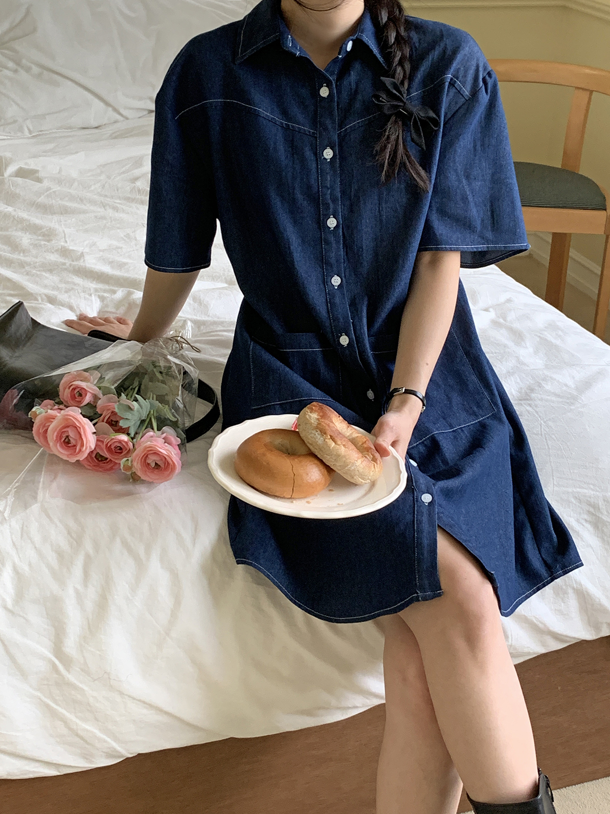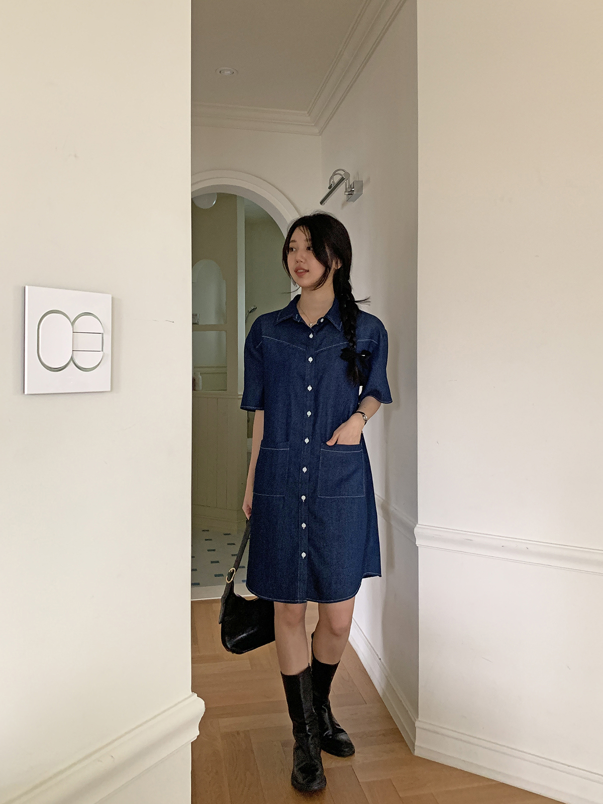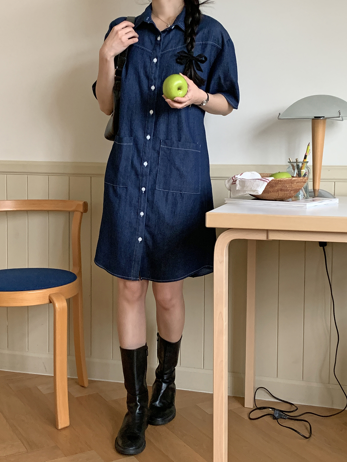 [ OPS9851K44-더페블 카라넥 데님 포켓 스티치 허리스트랩 미디원피스 ]