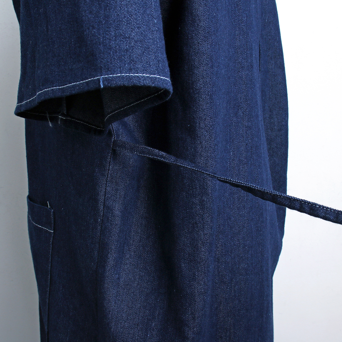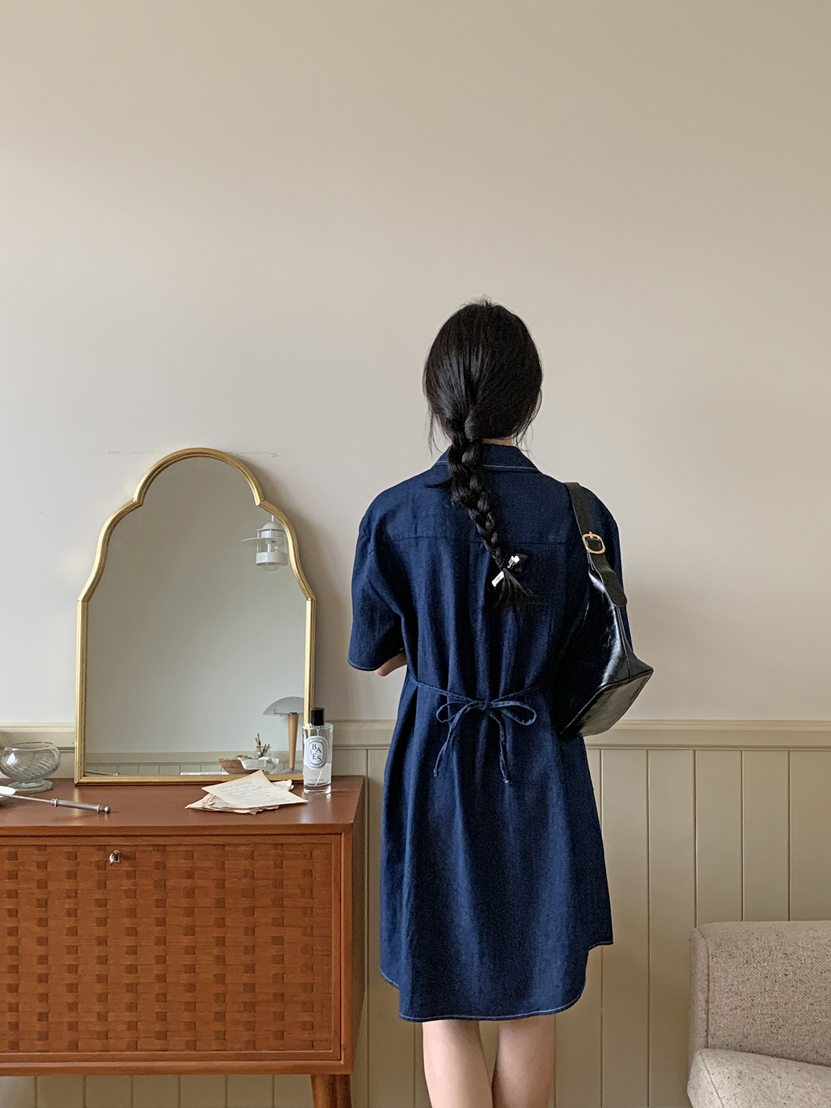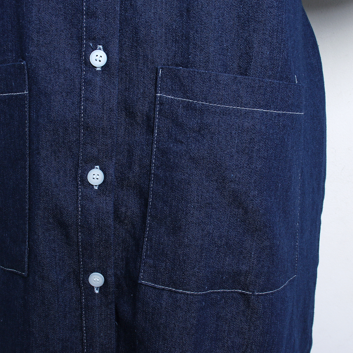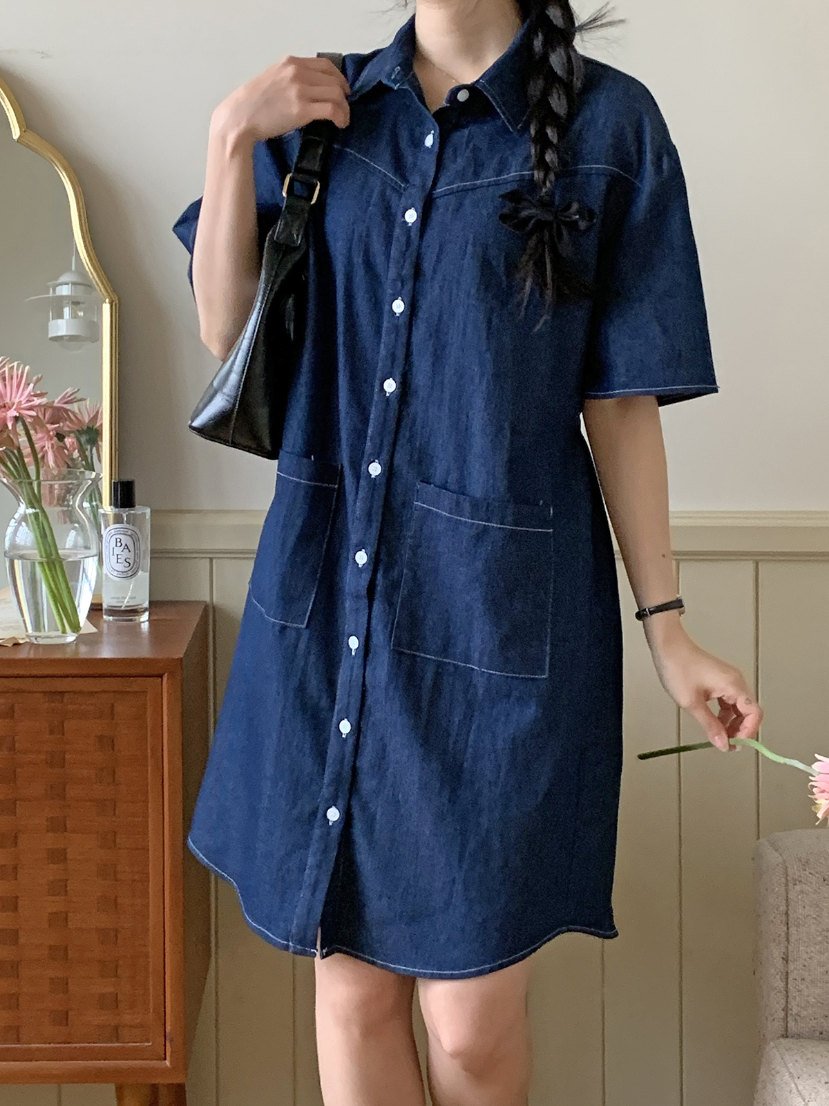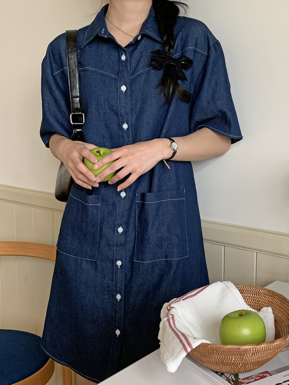 [ OPS9851K44-더페블 카라넥 데님 포켓 스티치 허리스트랩 미디원피스 ]