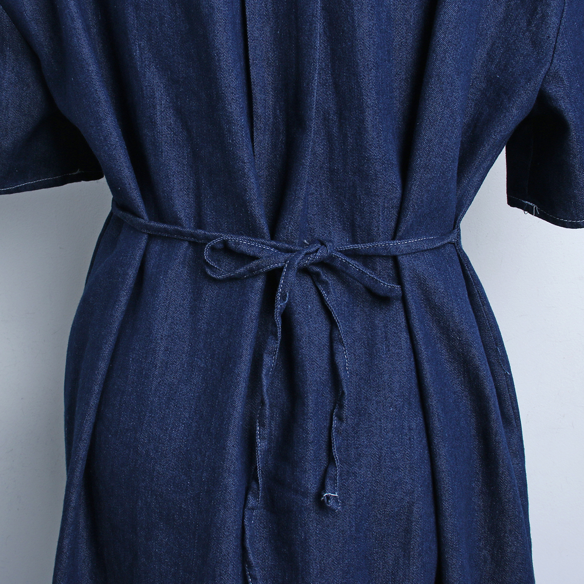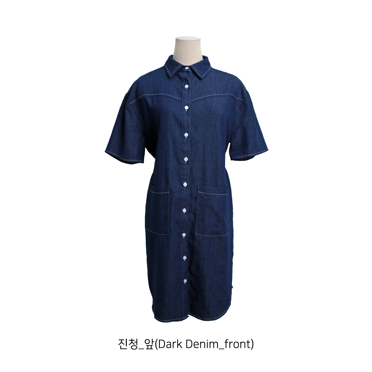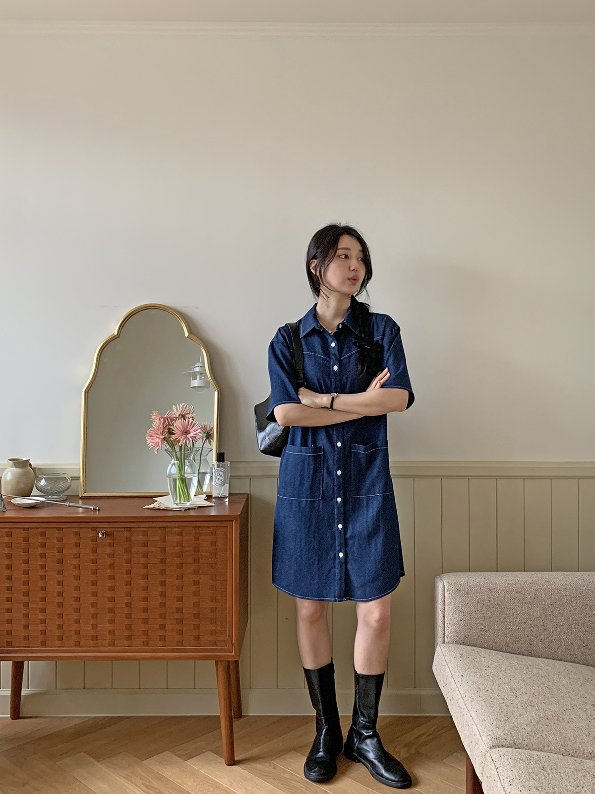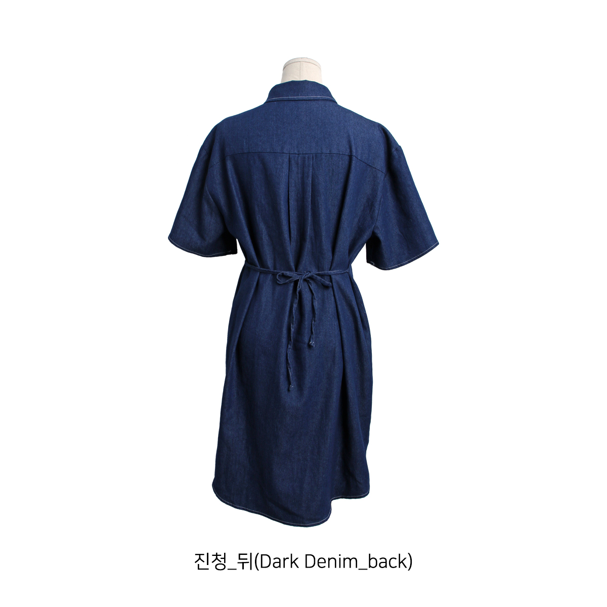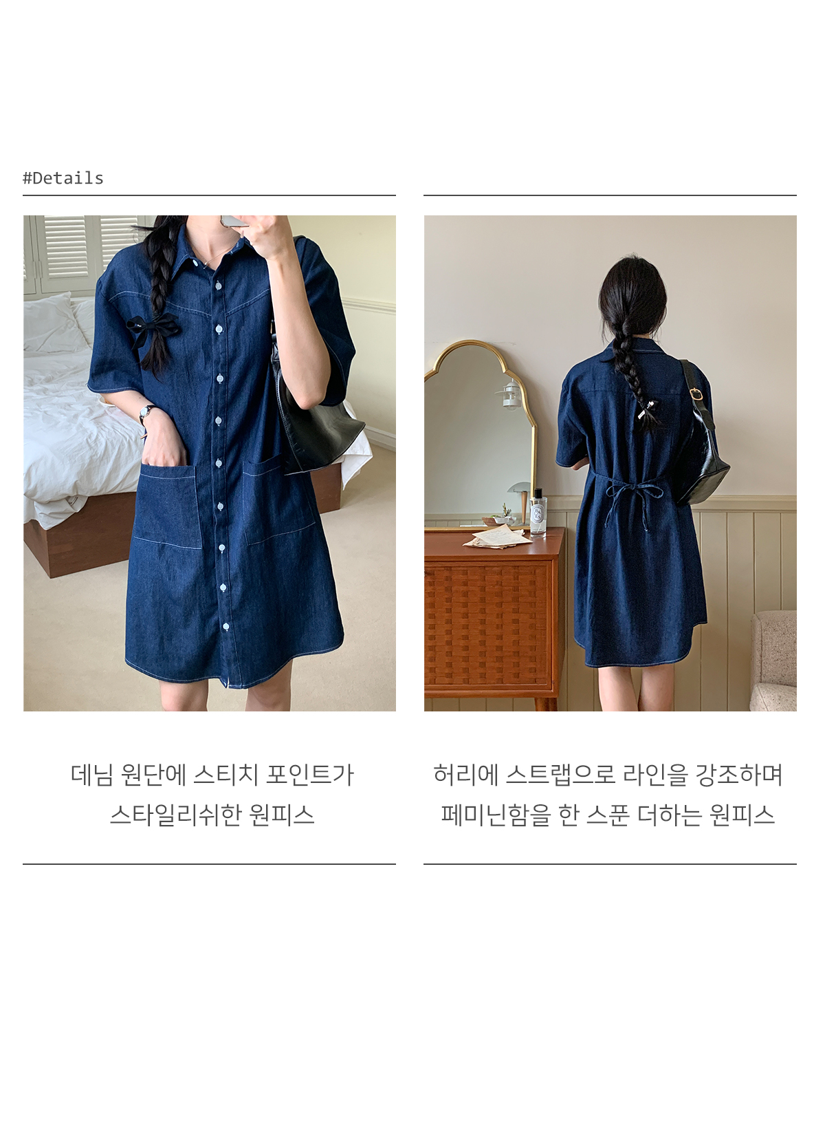 OPS9851K44-더페블 카라넥 데님 포켓 스티치 허리스트랩 미디원피스
