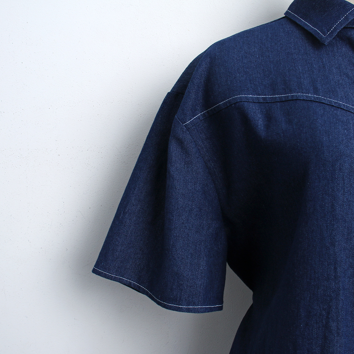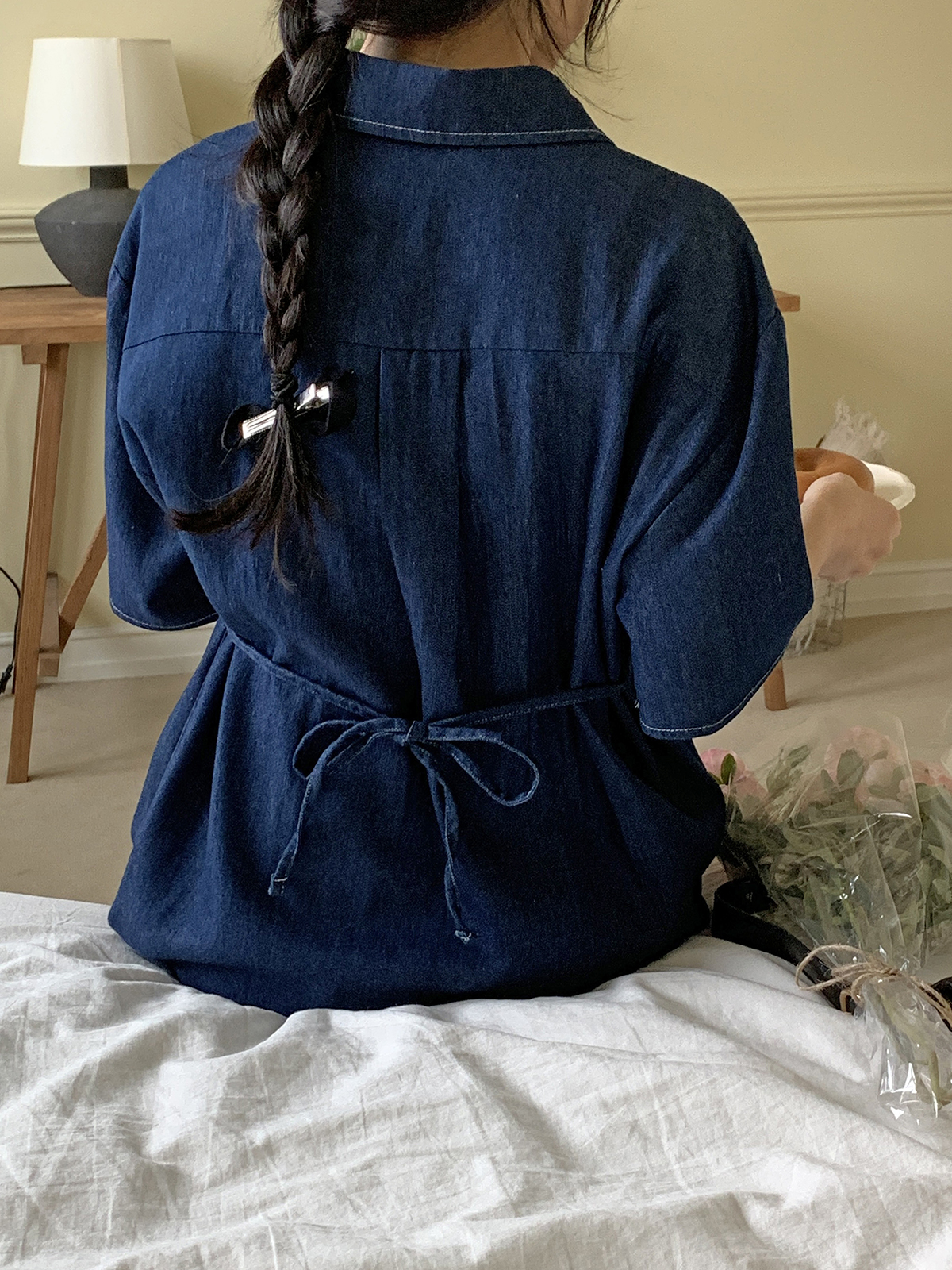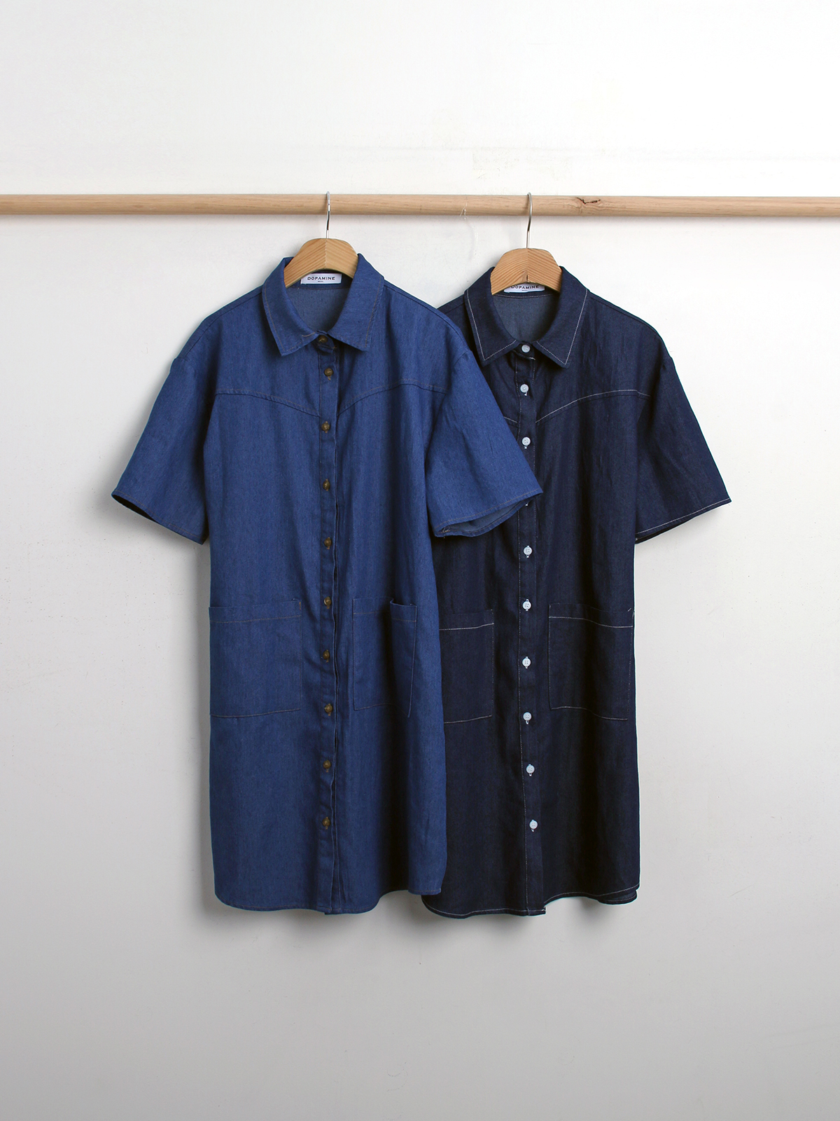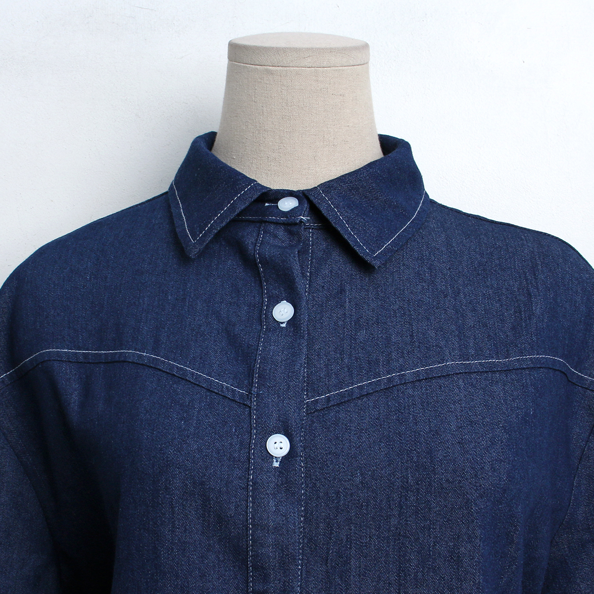 카라넥으로 넥라인을 터주어 페미닌하게 연출하며 데님 원단에 스티치 포인트가 스타일리쉬하고,