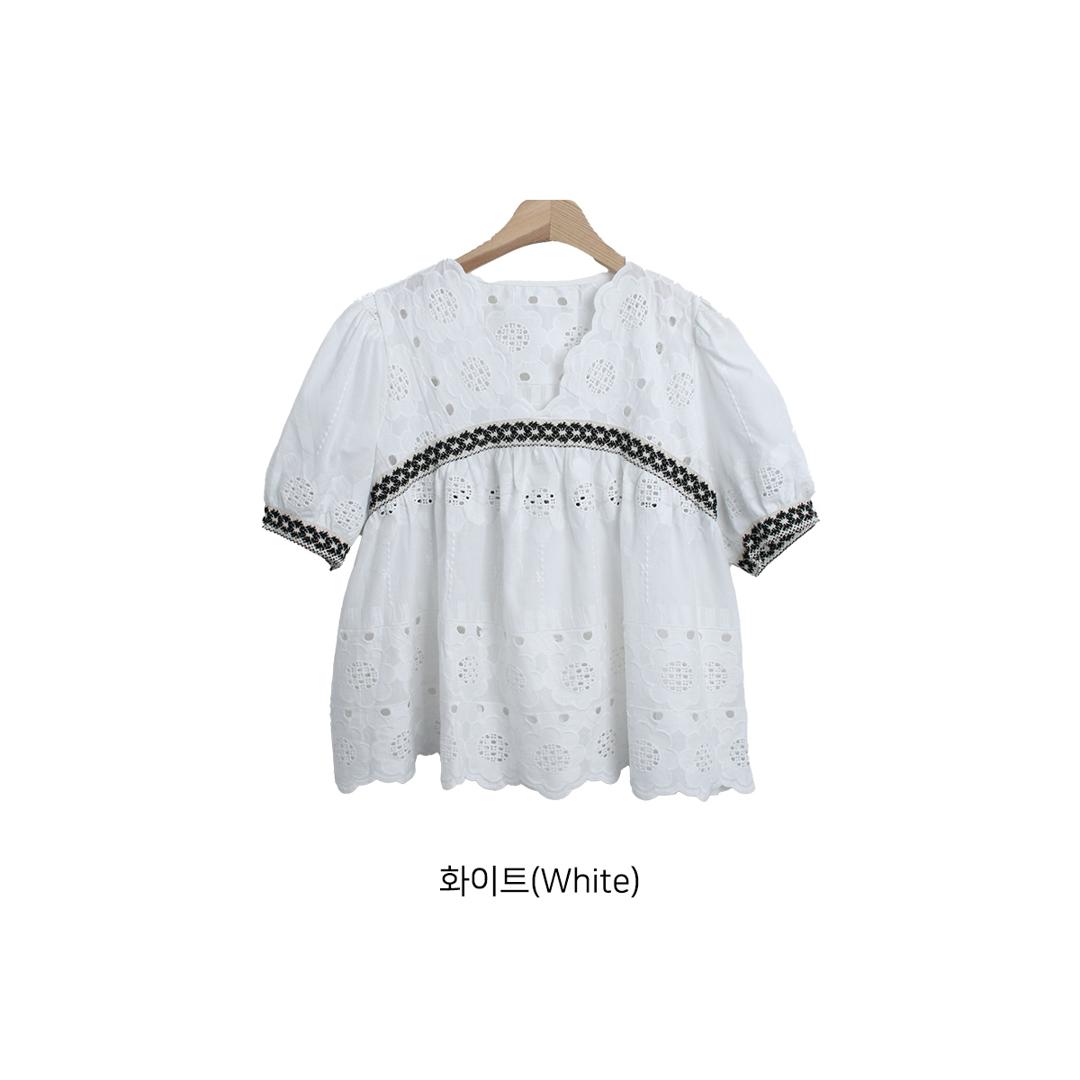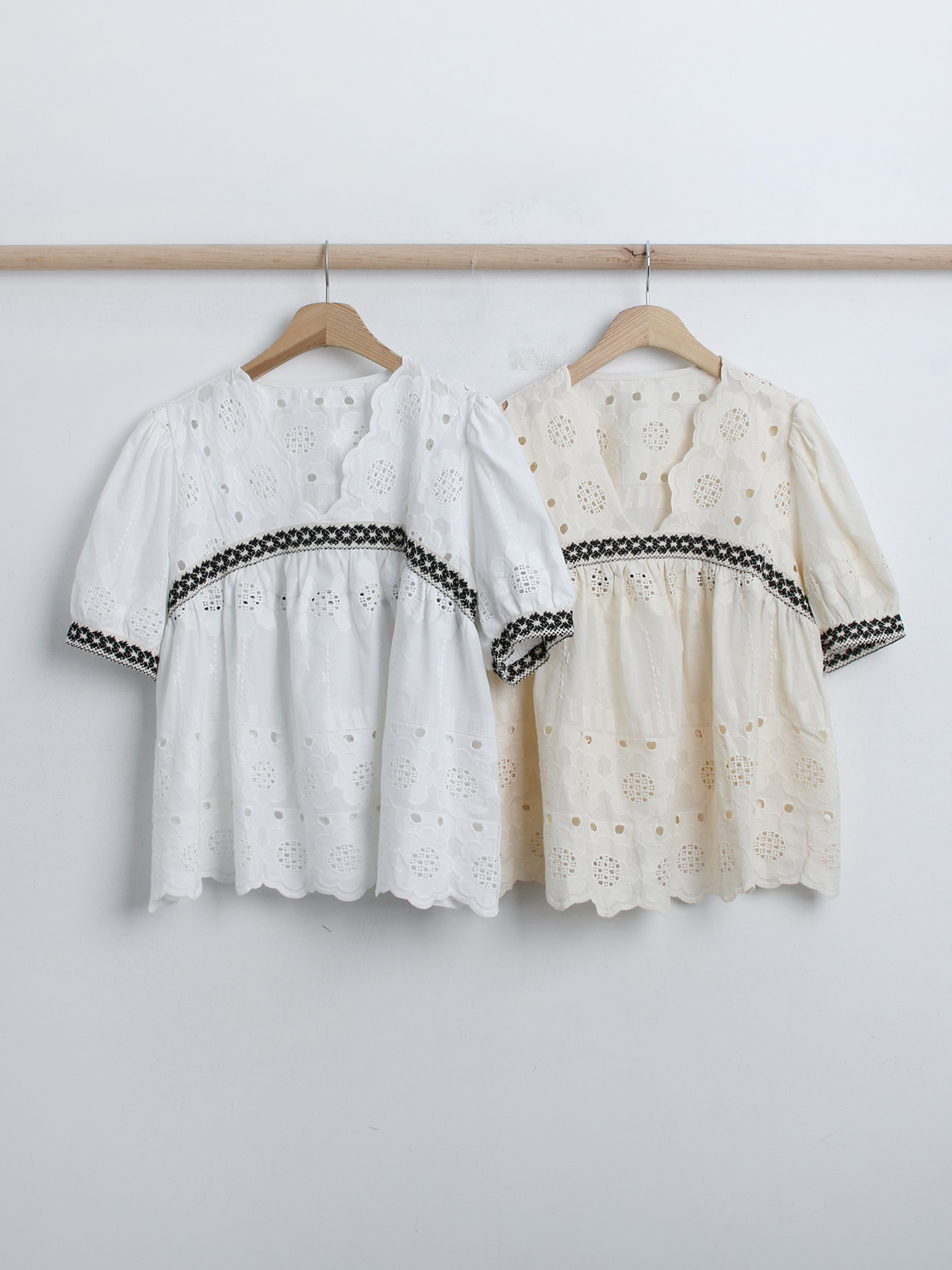 [ BL5622K45-티르렌 브이넥 펀칭 자수 프릴 반팔 블라우스 ]