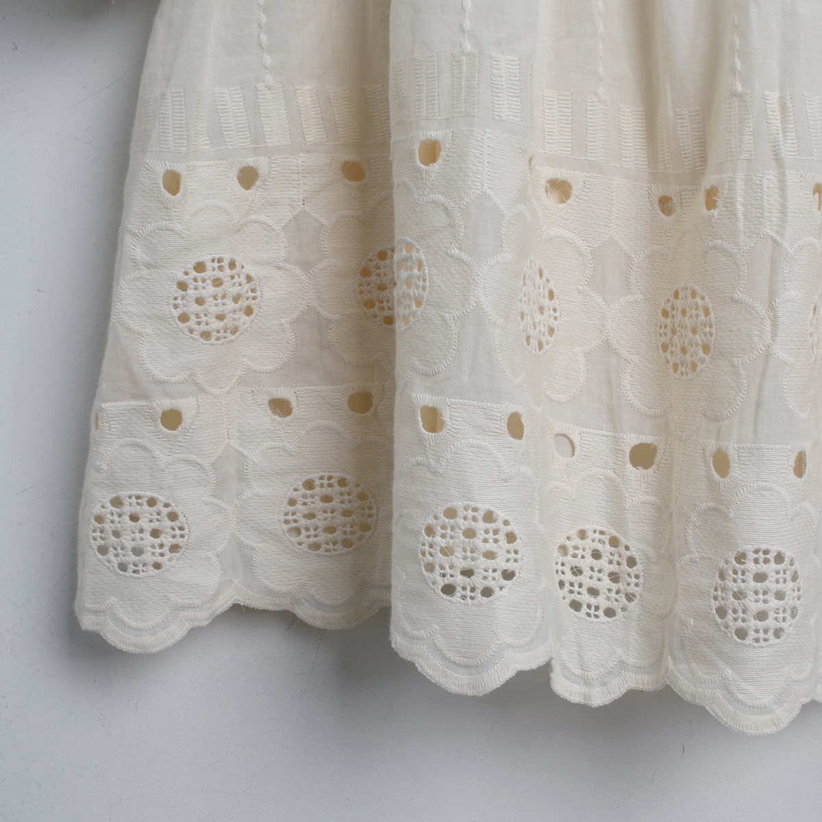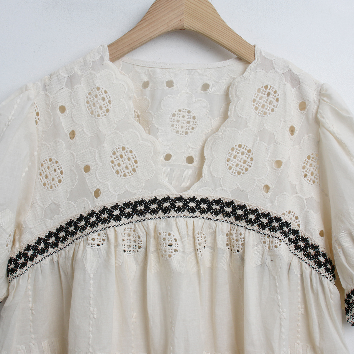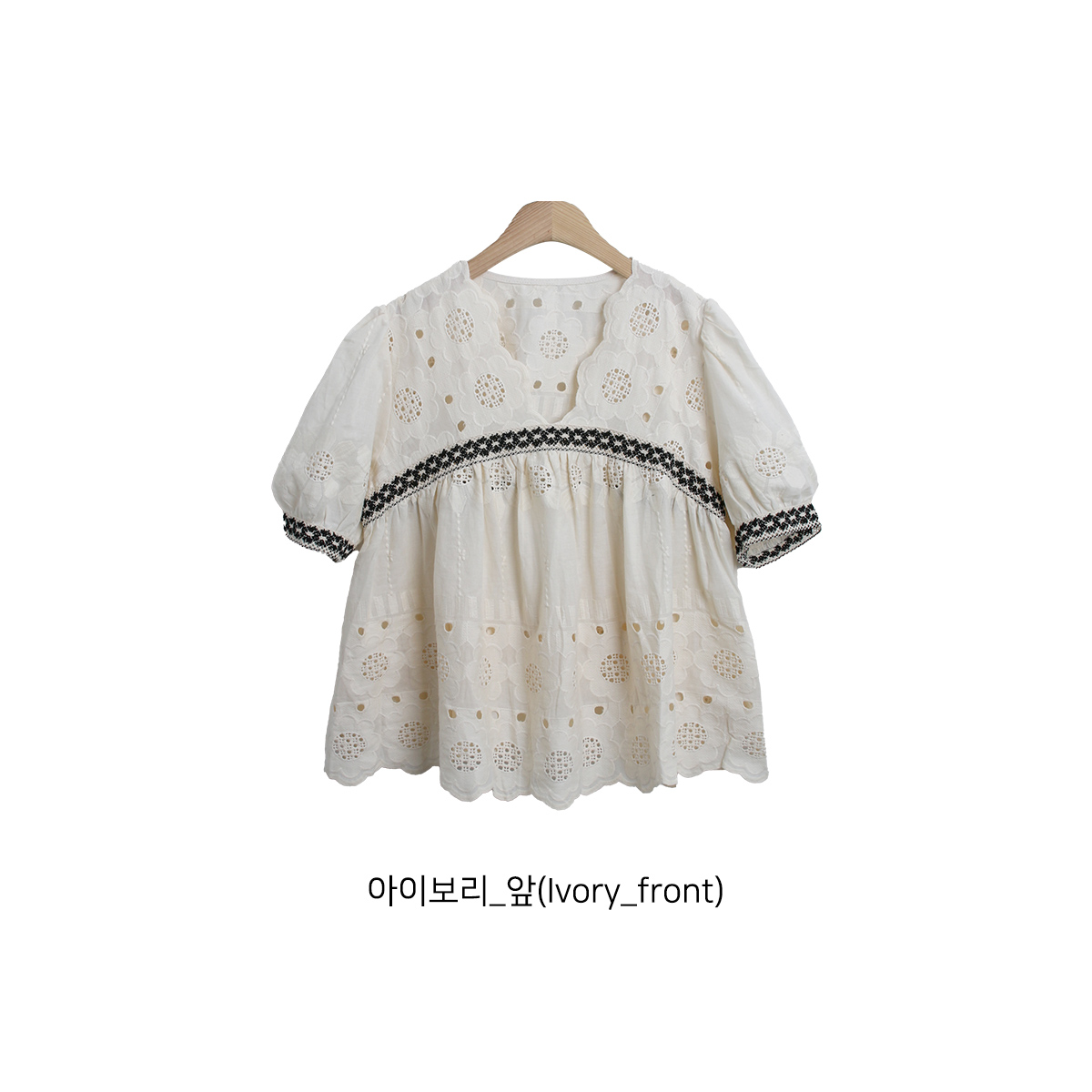 해바라기 패턴의 펀칭 자수 원단으로 러블리한 무드의 반팔 블라우스에요!