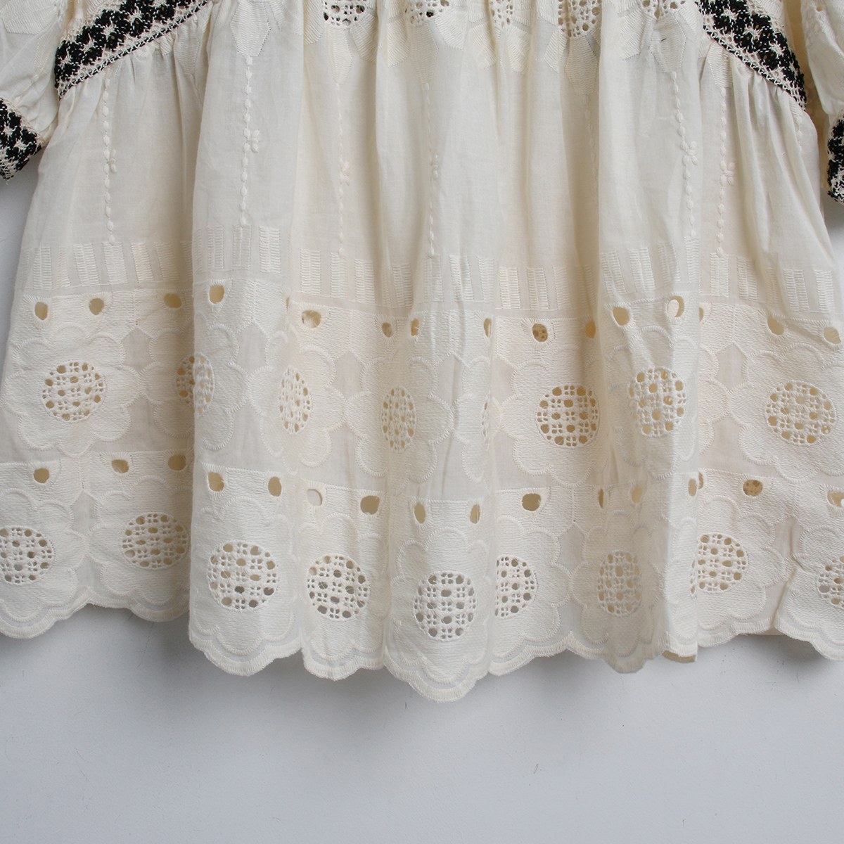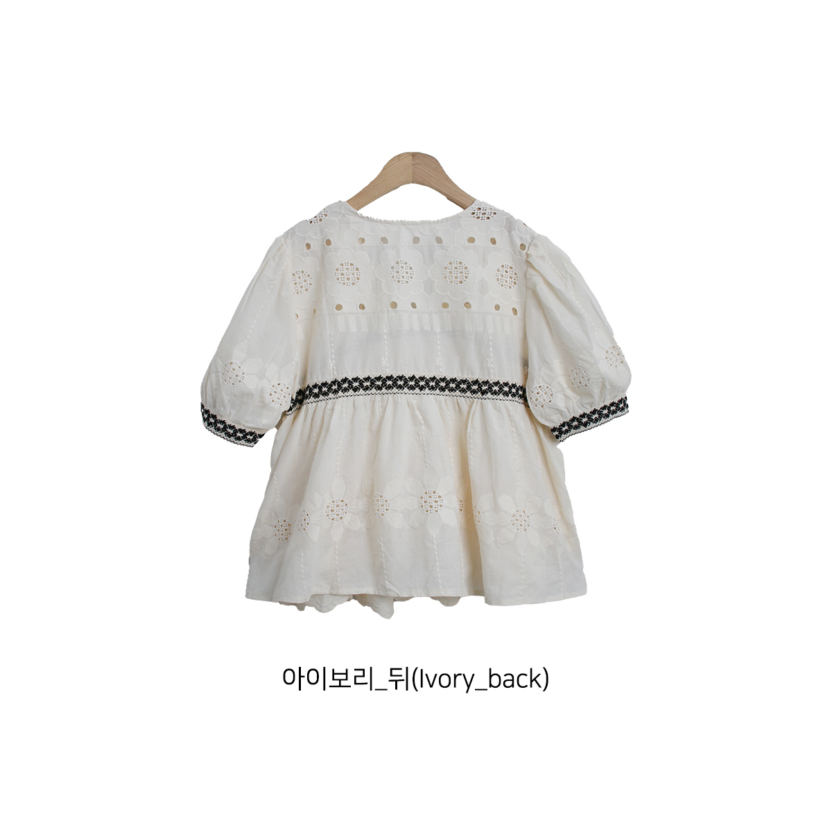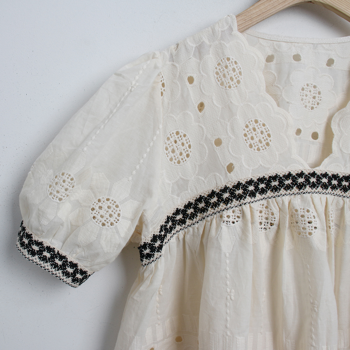 해바라기 패턴의 펀칭 자수 원단으로 러블리한 무드의 반팔 블라우스