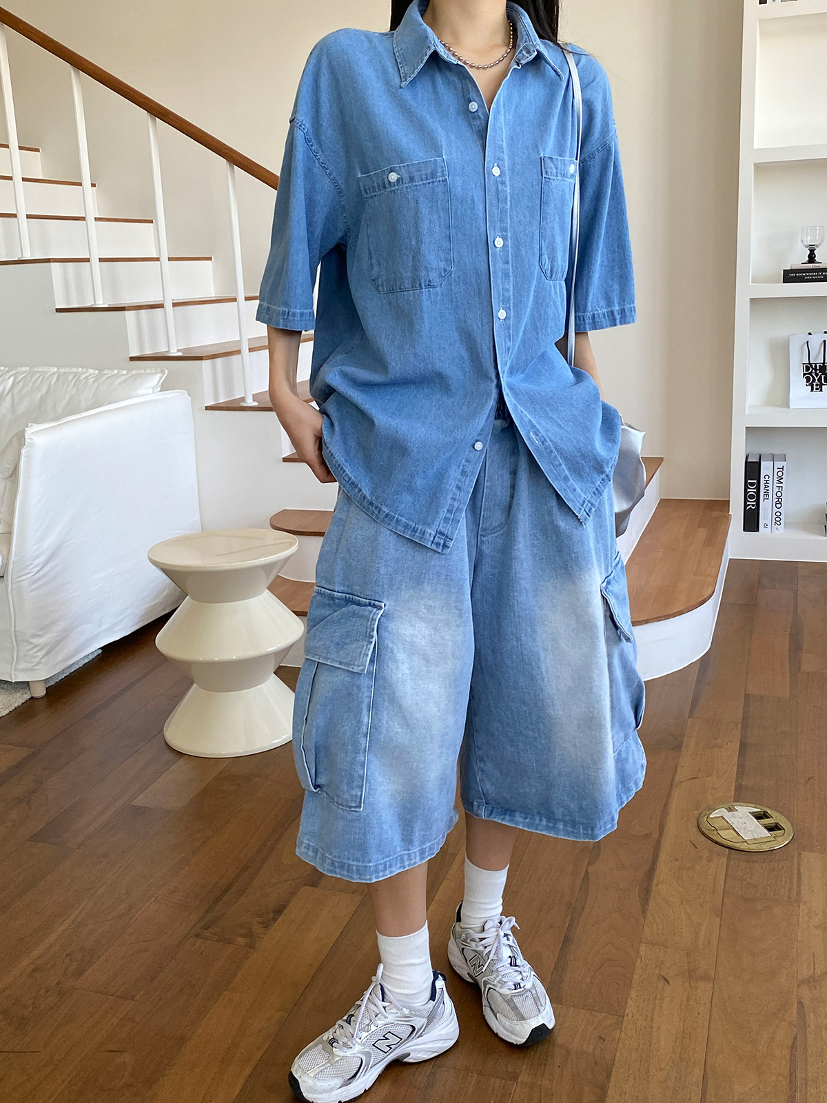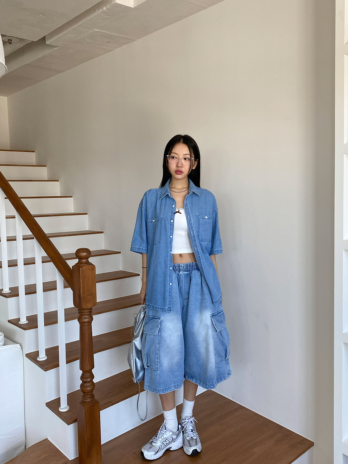 포켓 디테일이 포인트가 되는 심플한 데님 셔츠로 박시한 핏으로 스타일리쉬하게 룩을 연출하기에 좋으며 남녀공용으로 입을 수 있는 베이직한 데님 셔츠