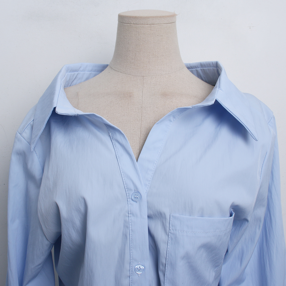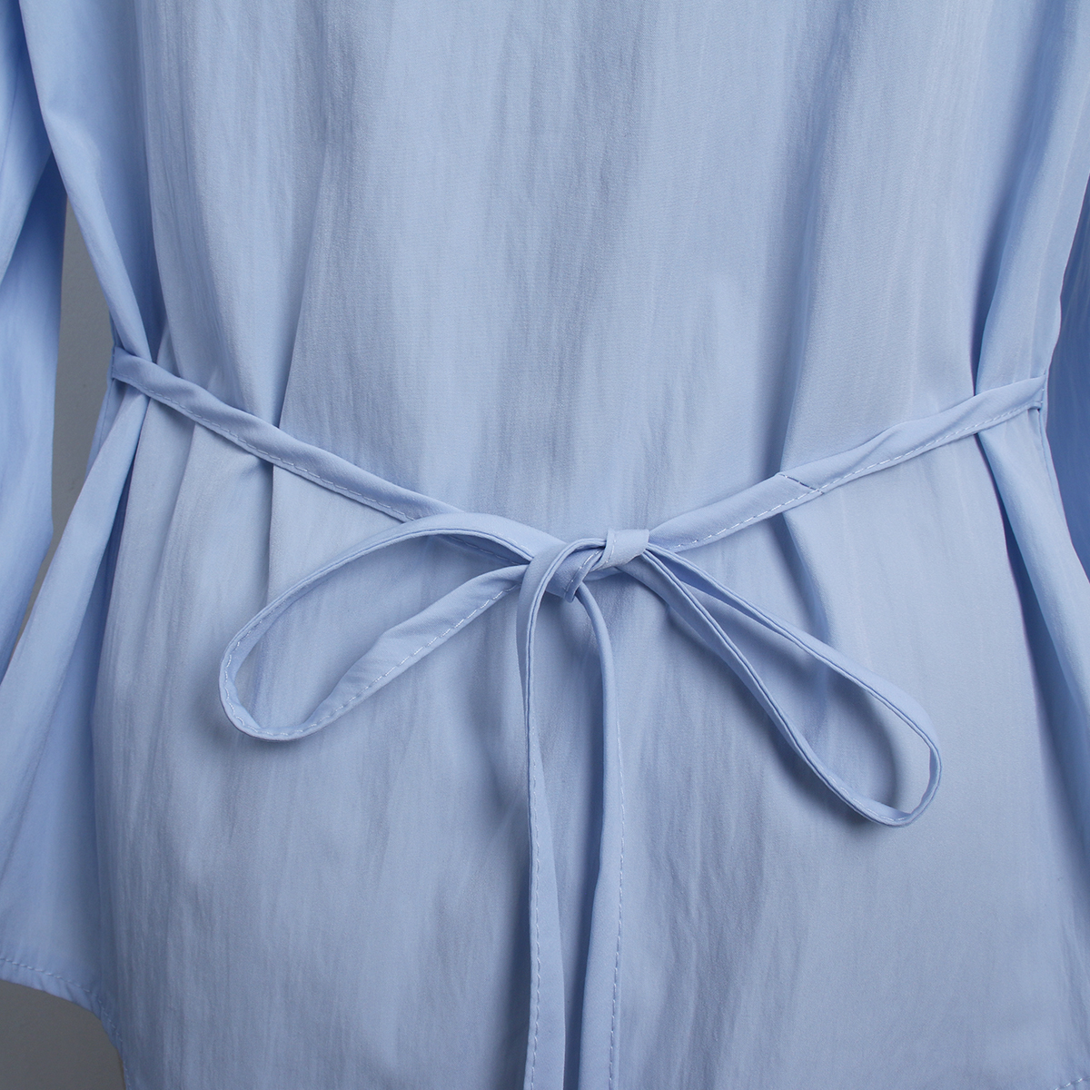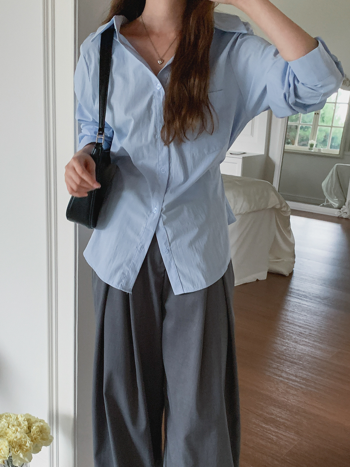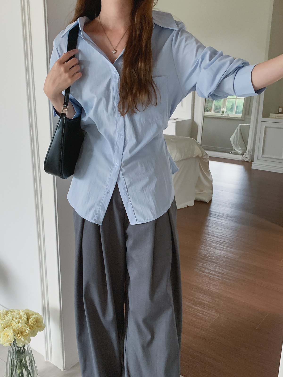 BL5702K48-올르니 오픈 카라넥 허리 스트랩 원포켓 블라우스