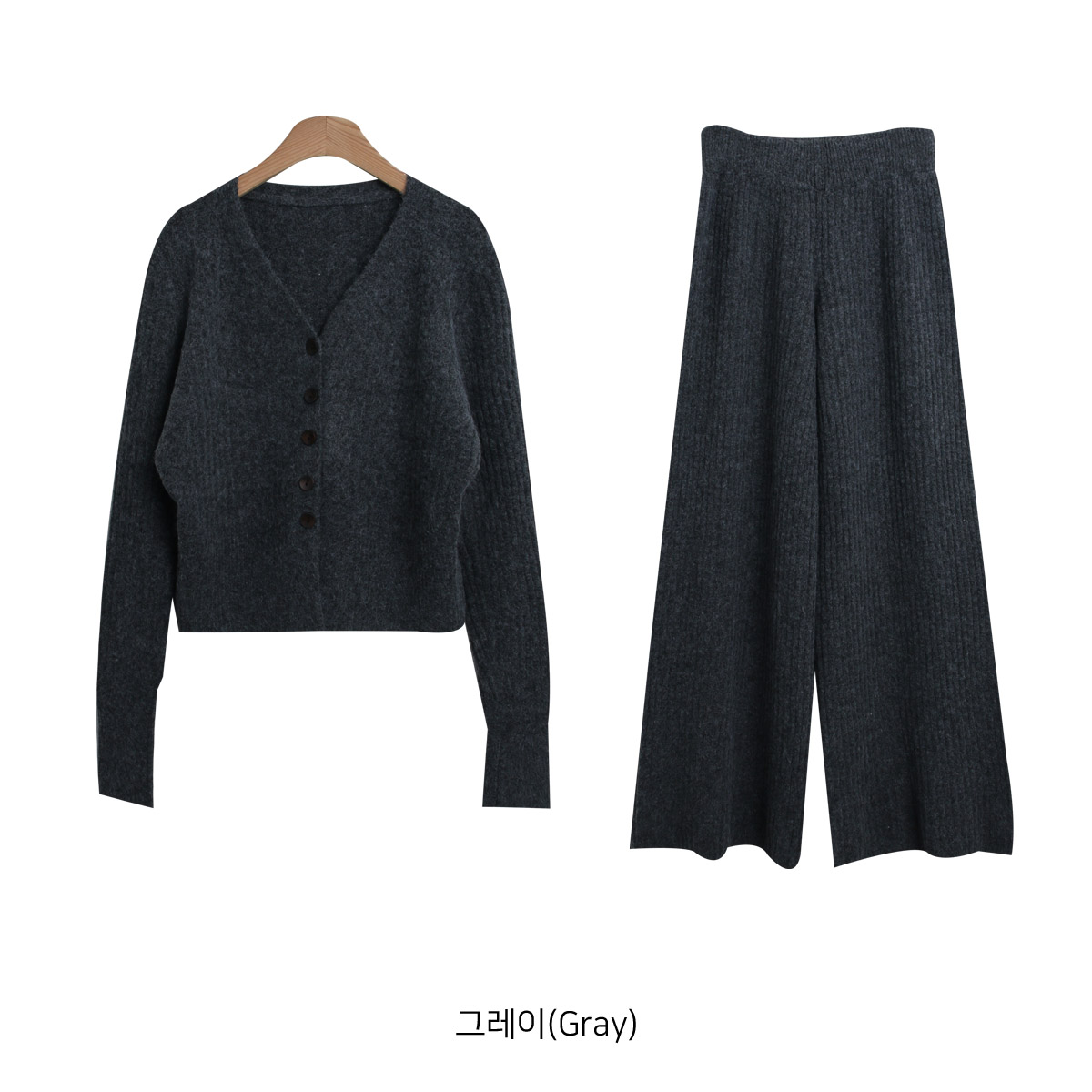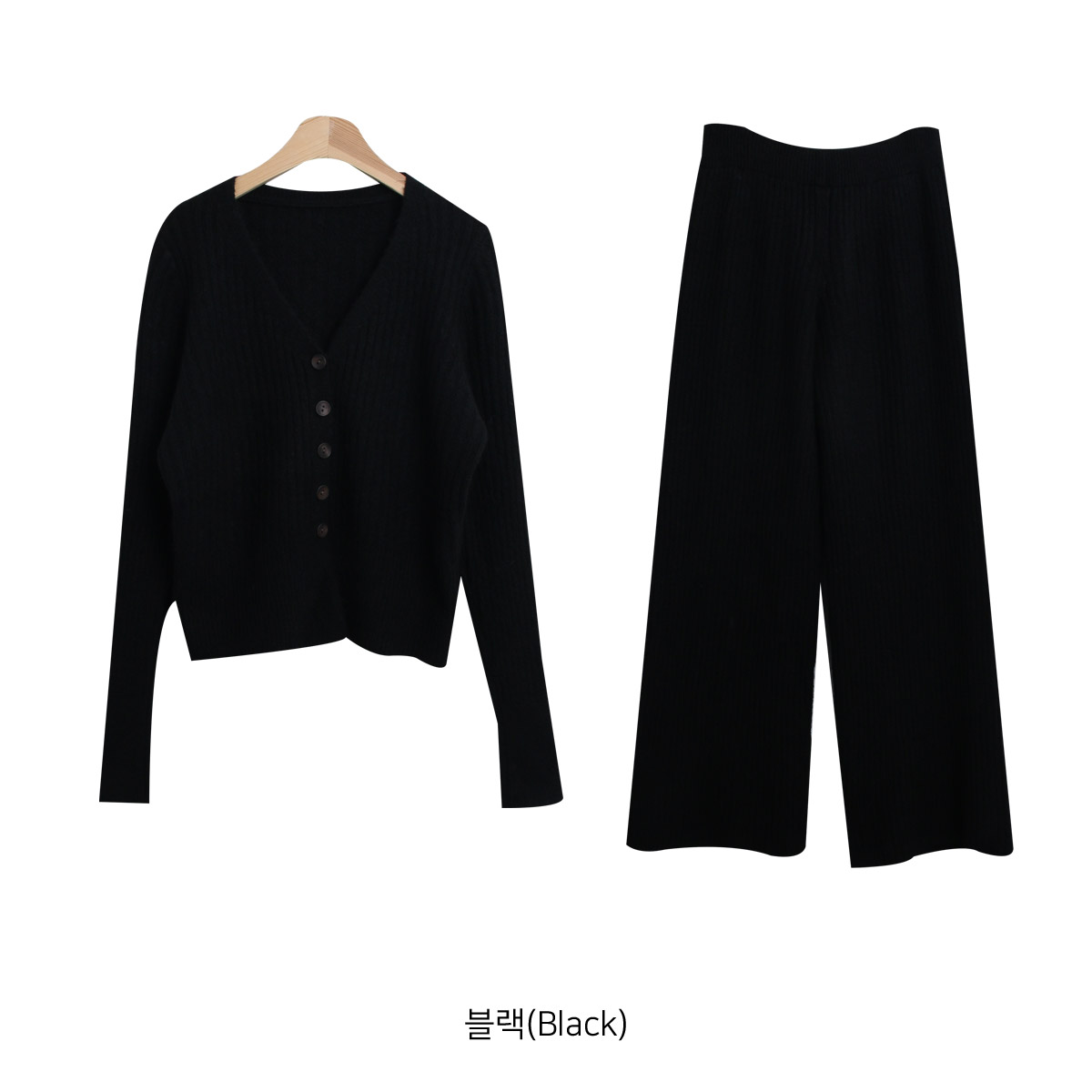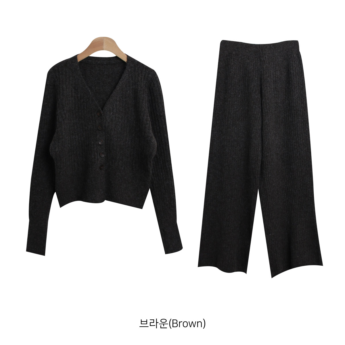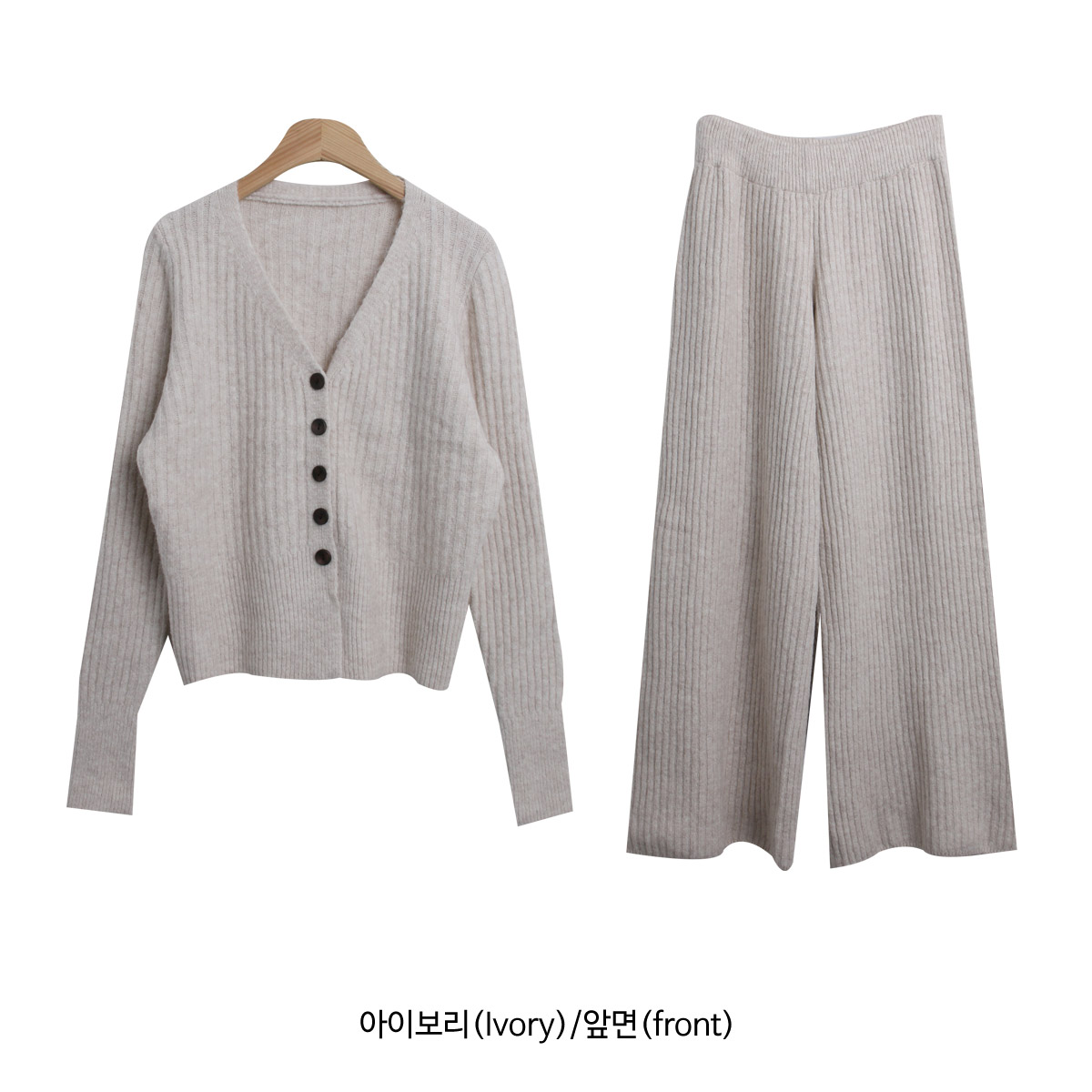 SET3605K49-버즈다 우드버튼 브이넥 니트 밴딩 팬츠 세트