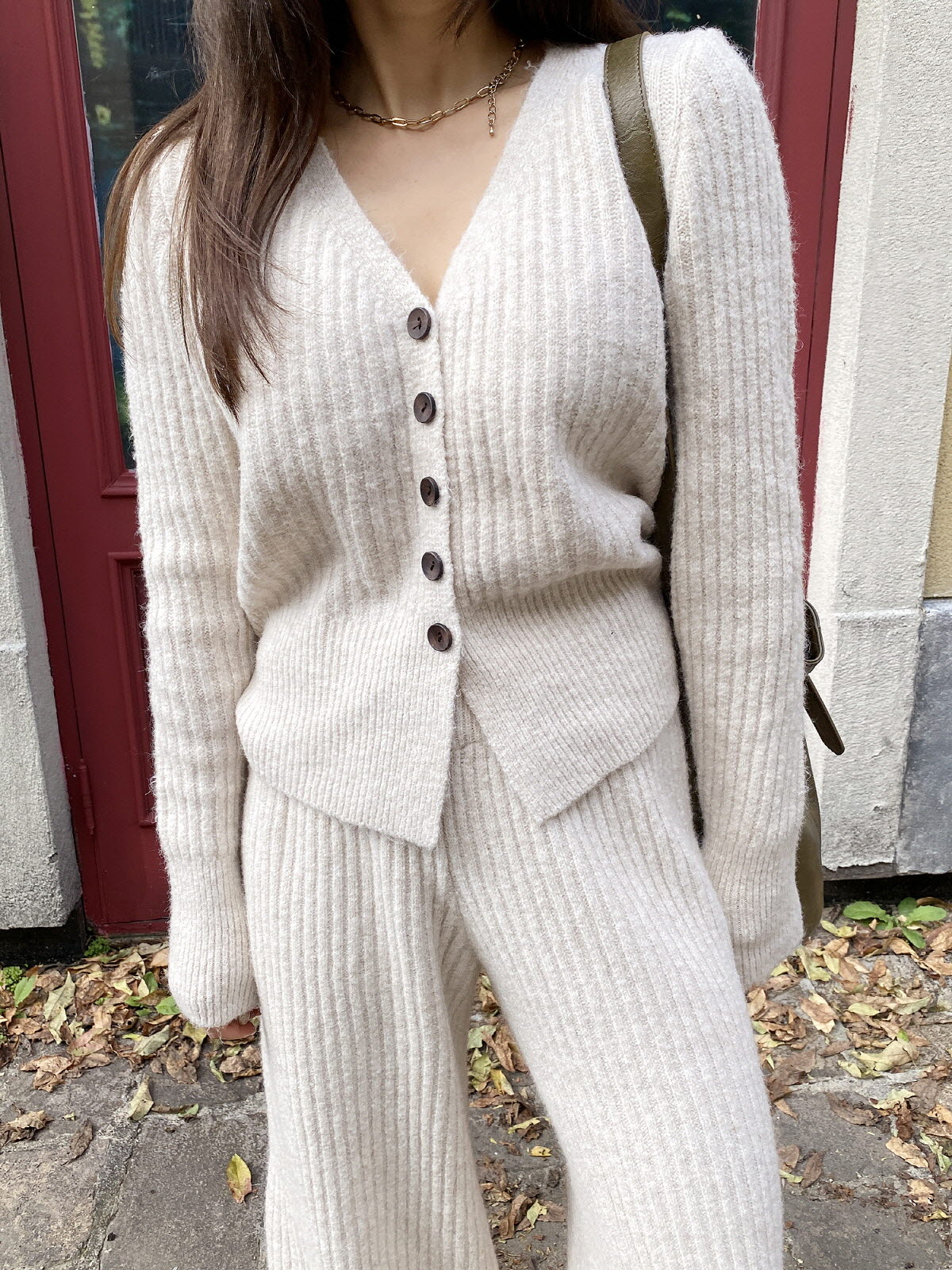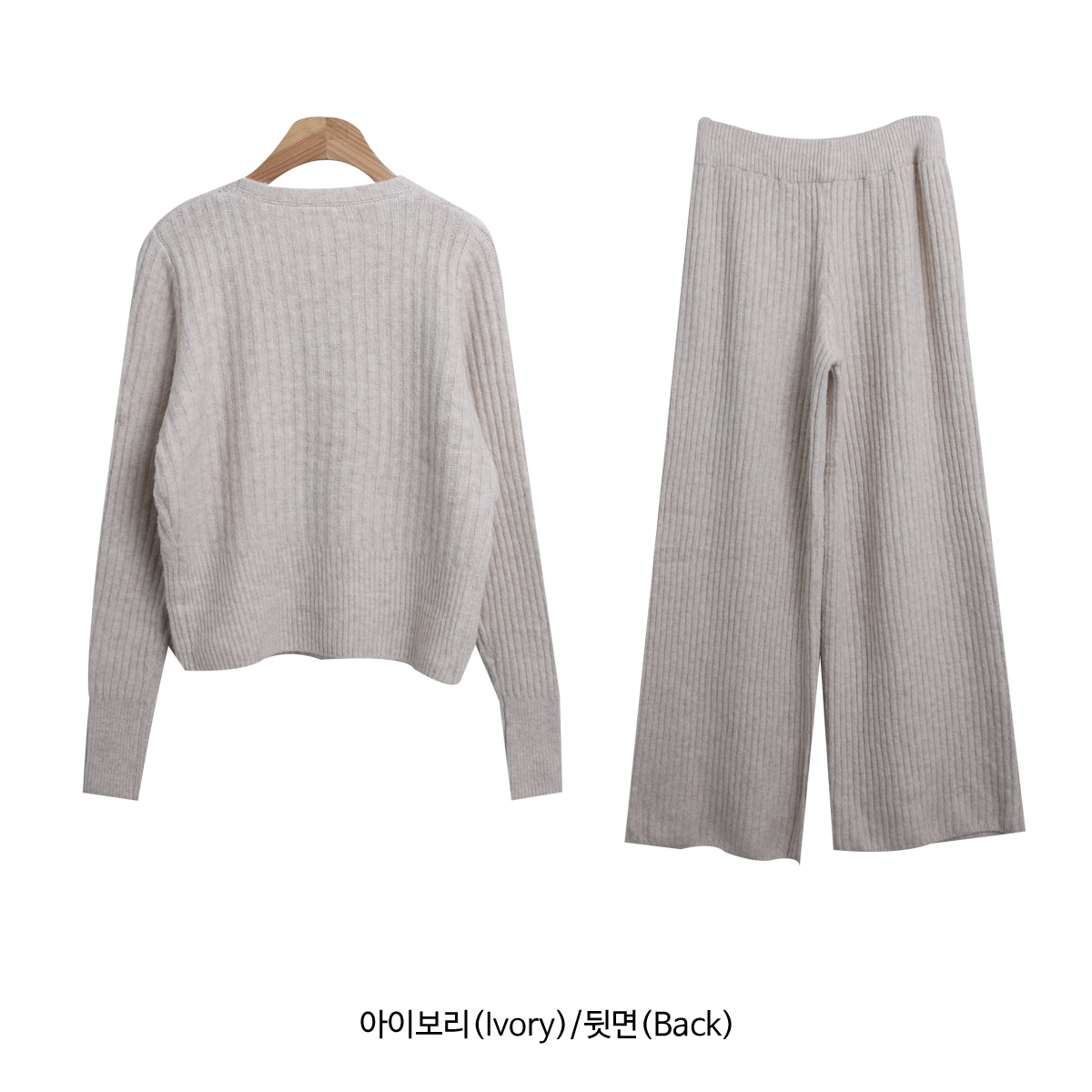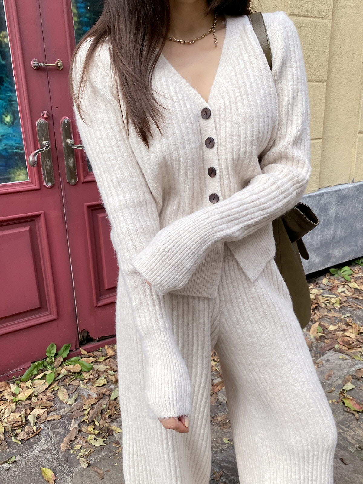 SET3605K49-버즈다 우드버튼 브이넥 니트 밴딩 팬츠 세트