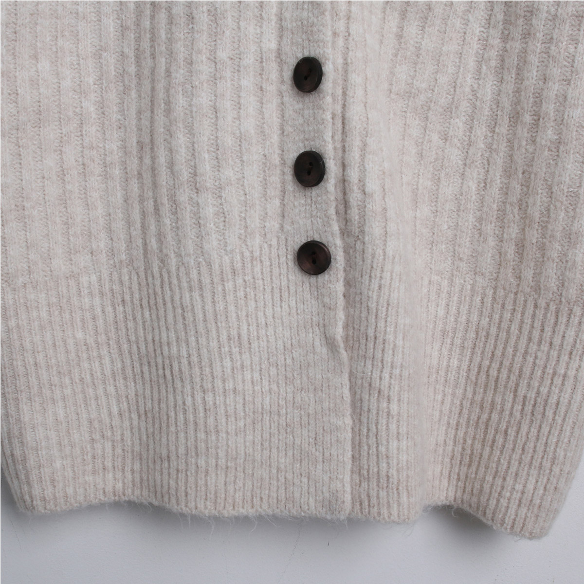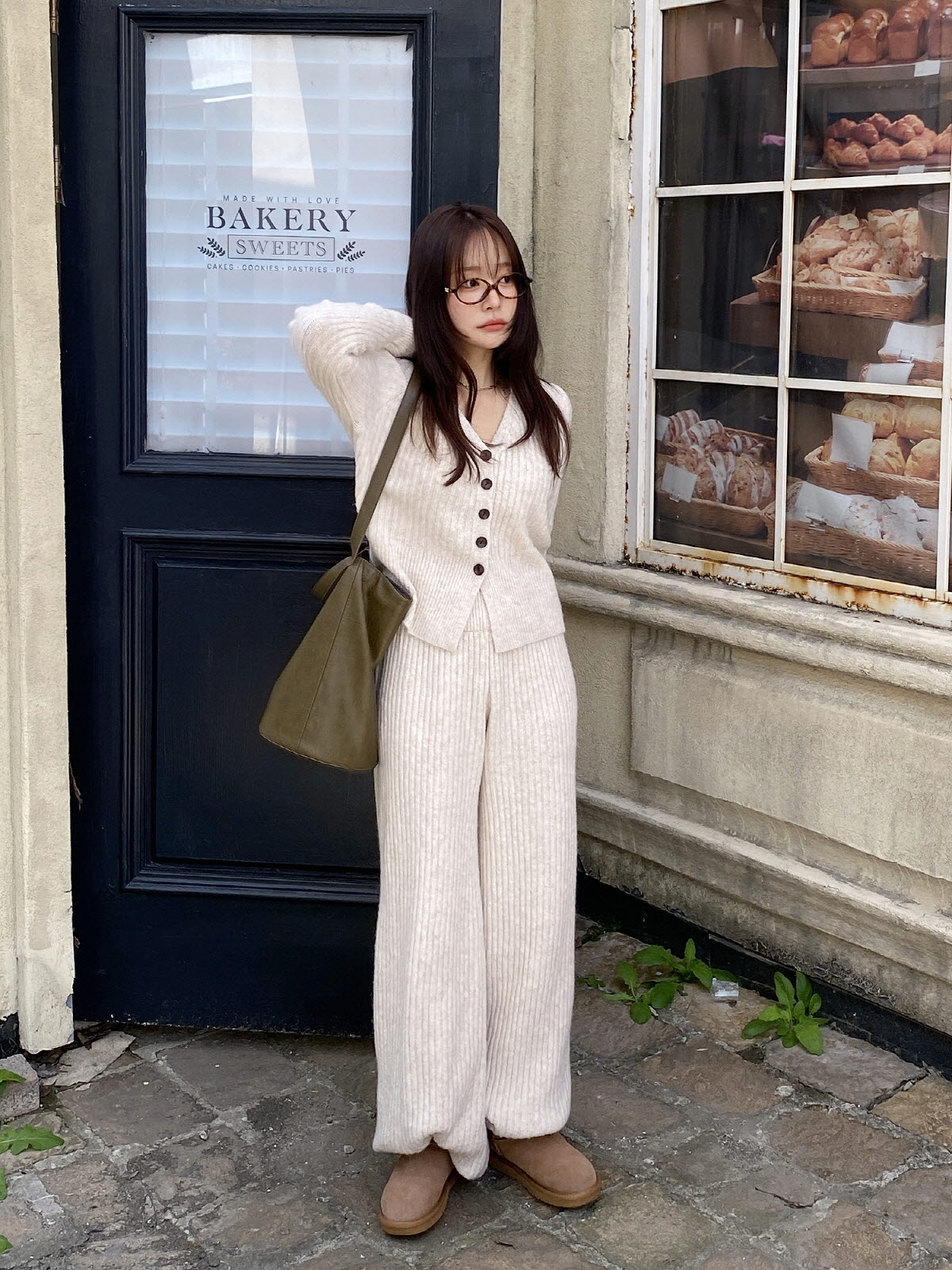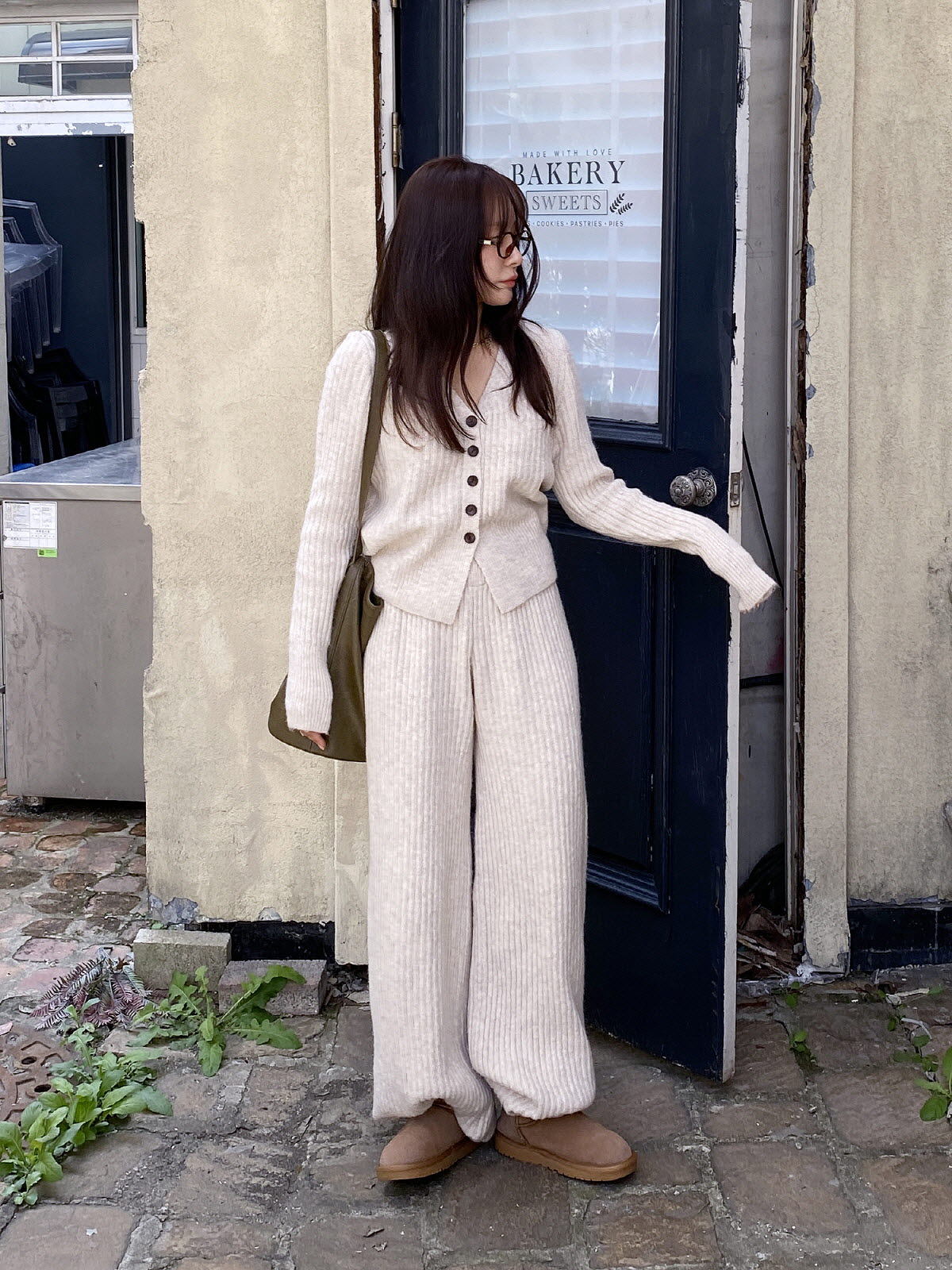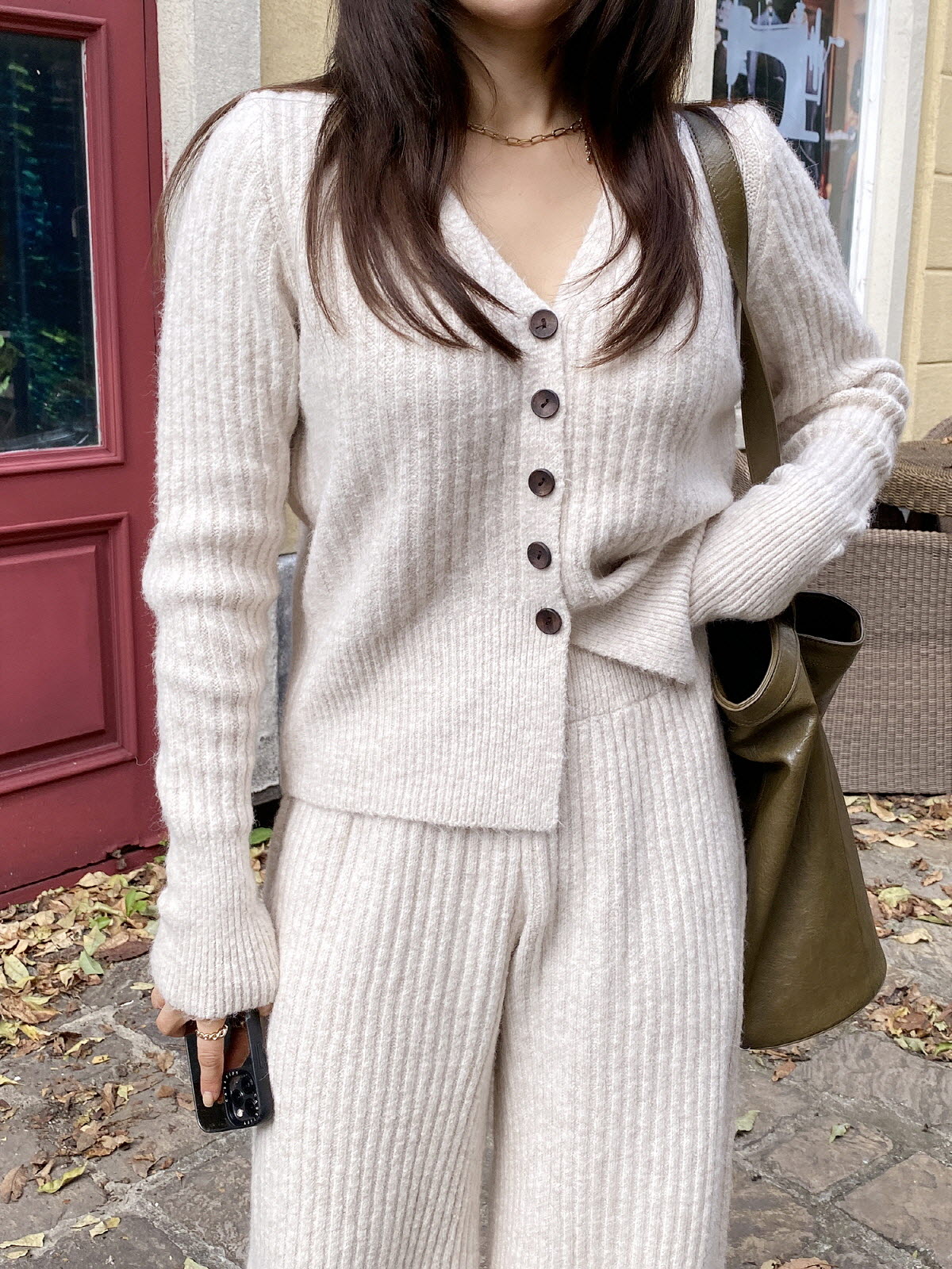 SET3605K49-버즈다 우드버튼 브이넥 니트 밴딩 팬츠 세트