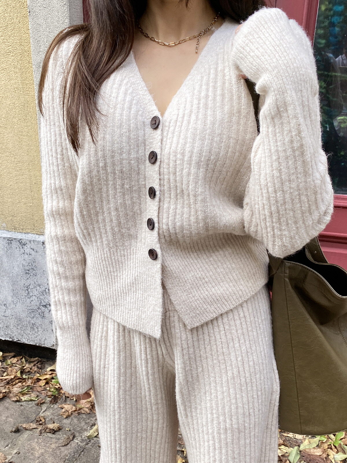 [ SET3605K49-버즈다 우드버튼 브이넥 니트 밴딩 팬츠 세트 ]
