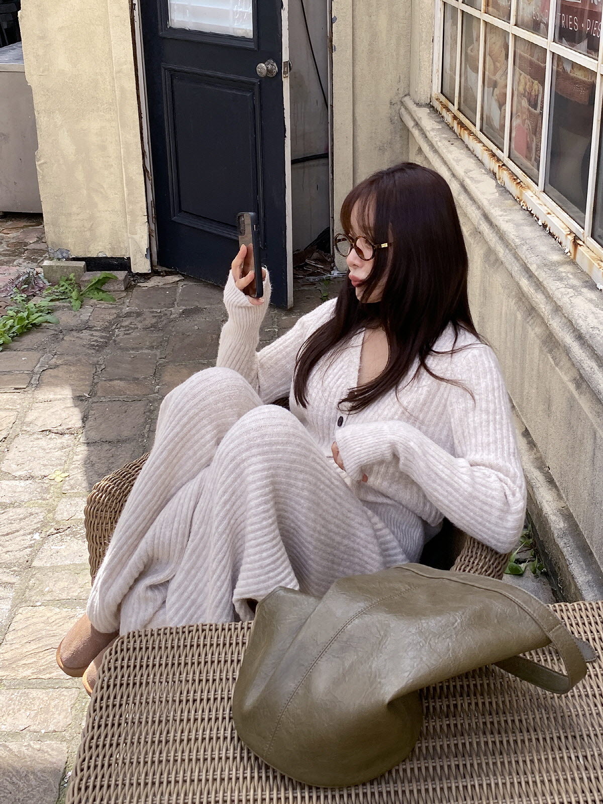 우드버튼 포인트의 브이넥니트 가디건과 밴딩팬츠 세트 상품으로 넉넉한 사이즈 감으로 사이즈 구애 없이 편안하게 입을수 있으며