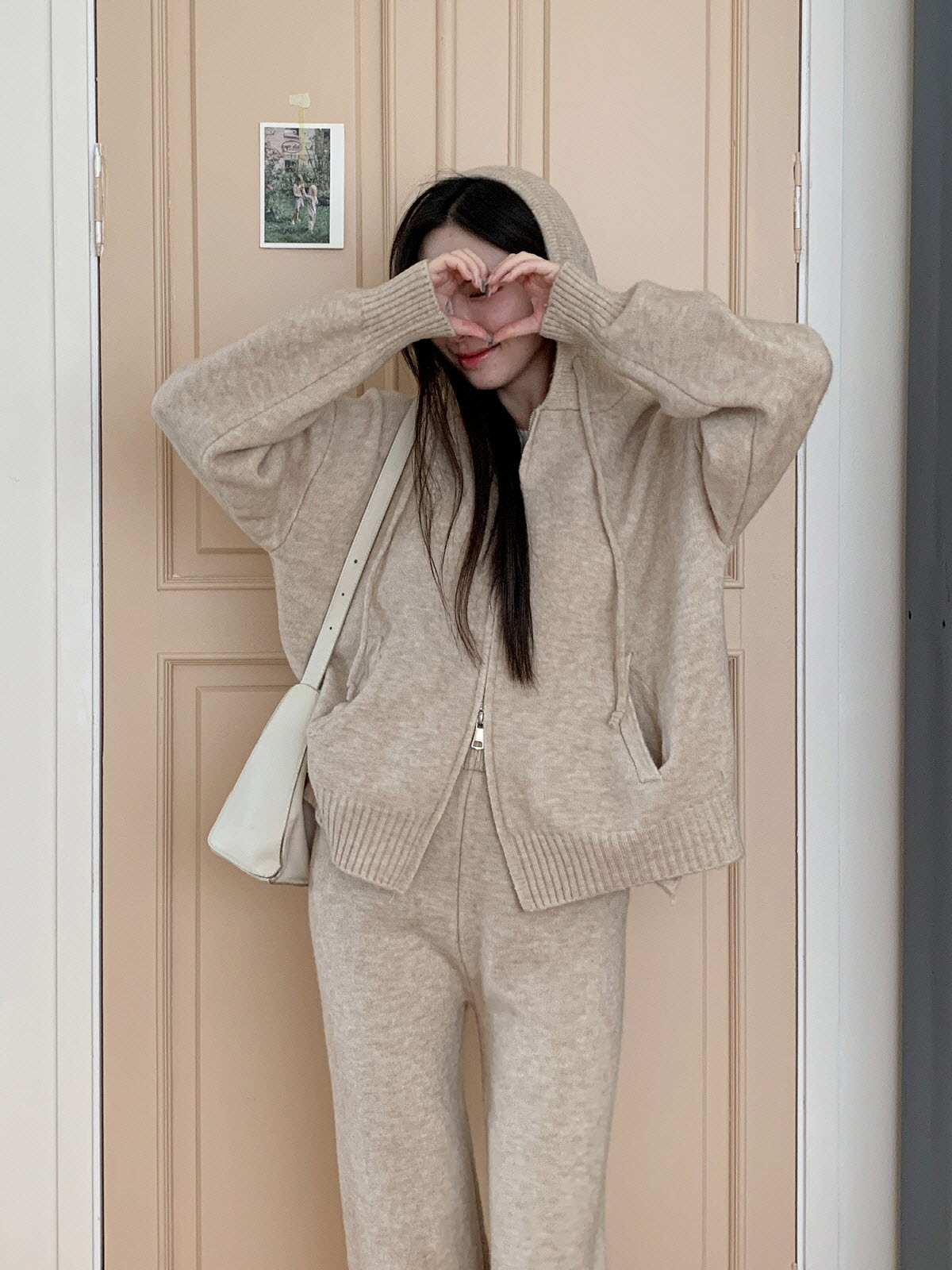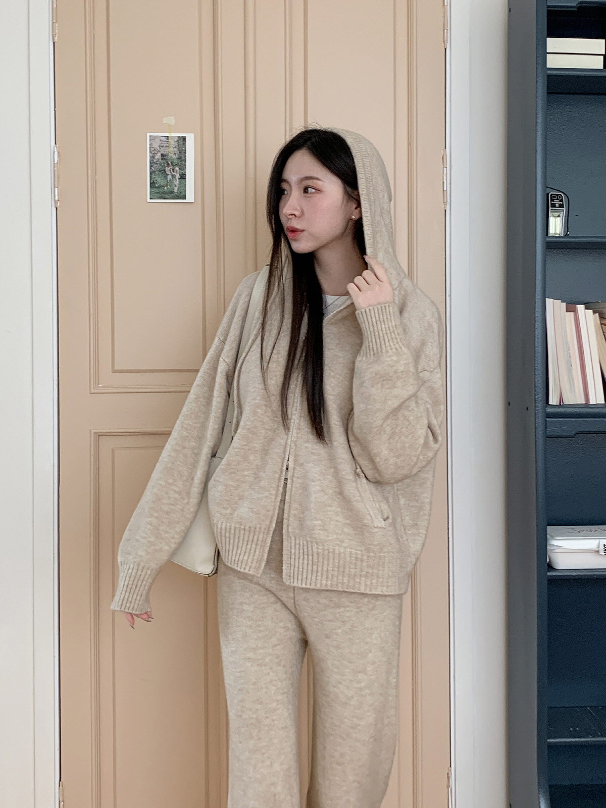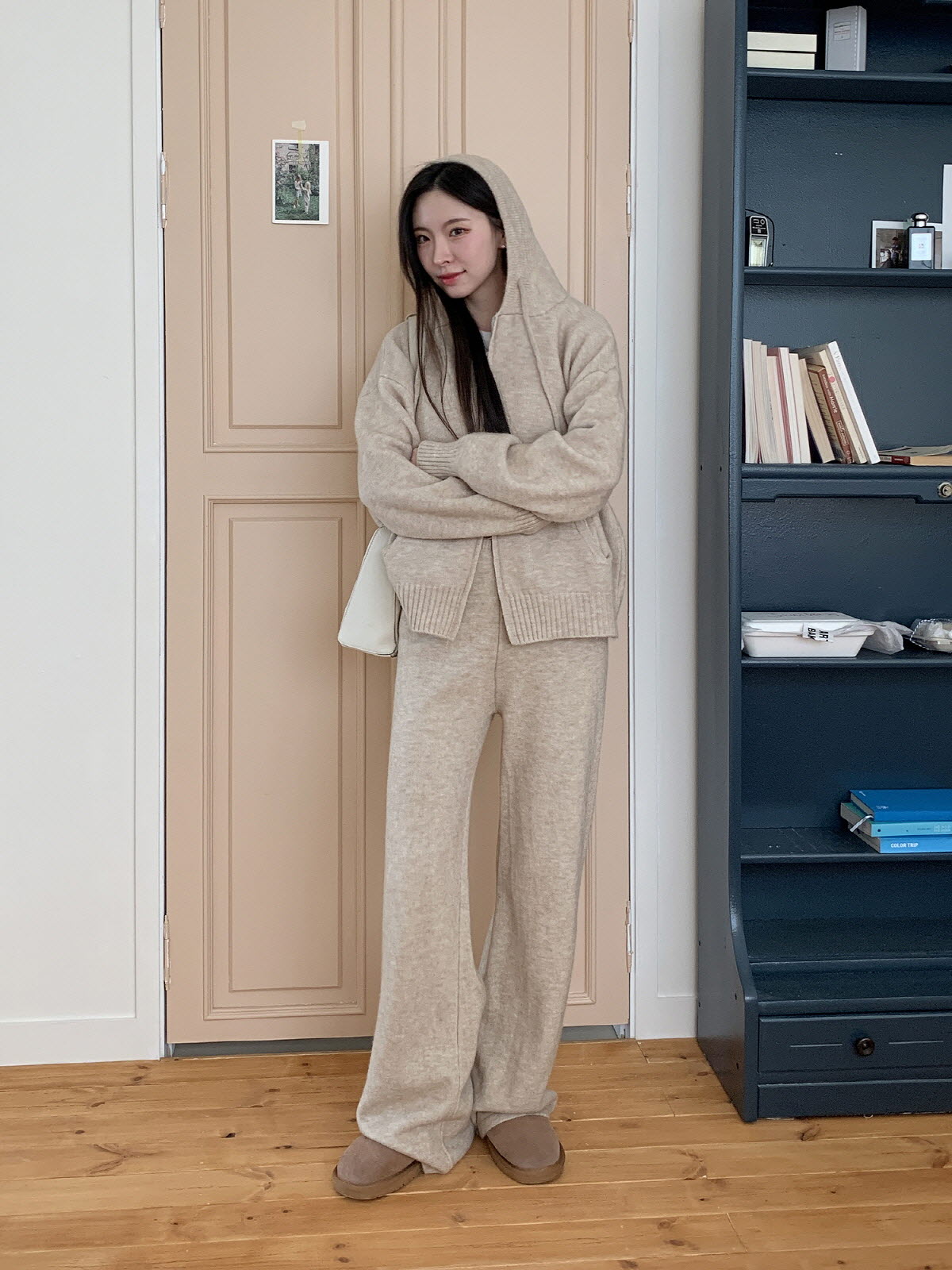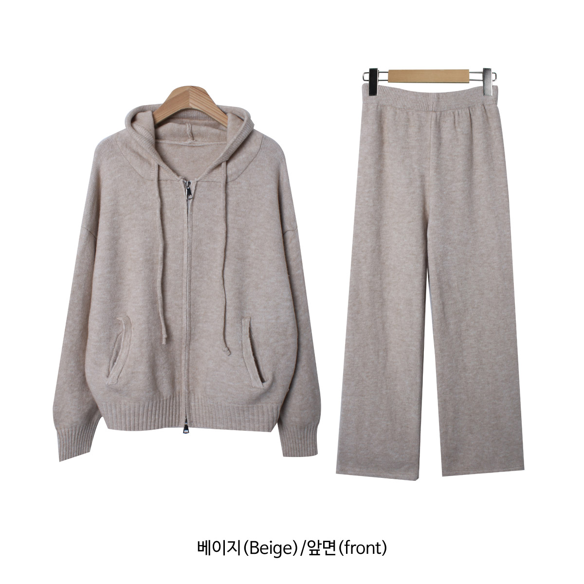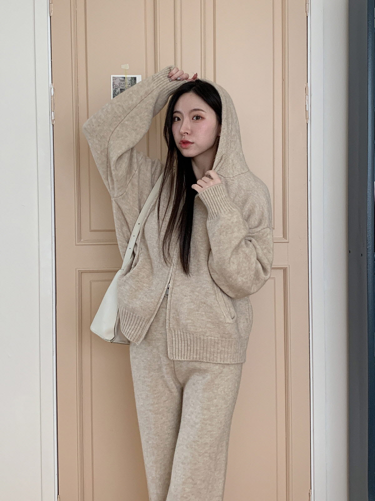 [ SET3632K4A-루투후 루즈 투웨이 니트 후드 집업 밴딩 팬츠 세트 ]