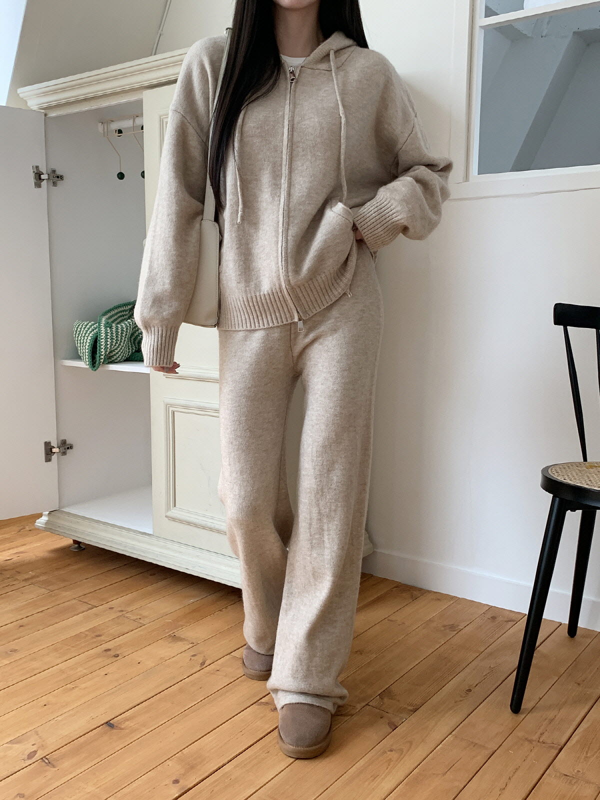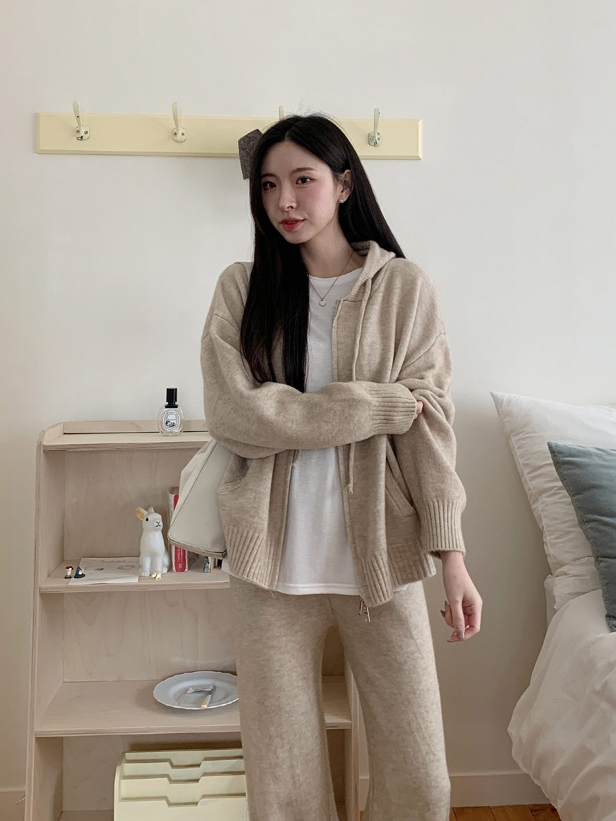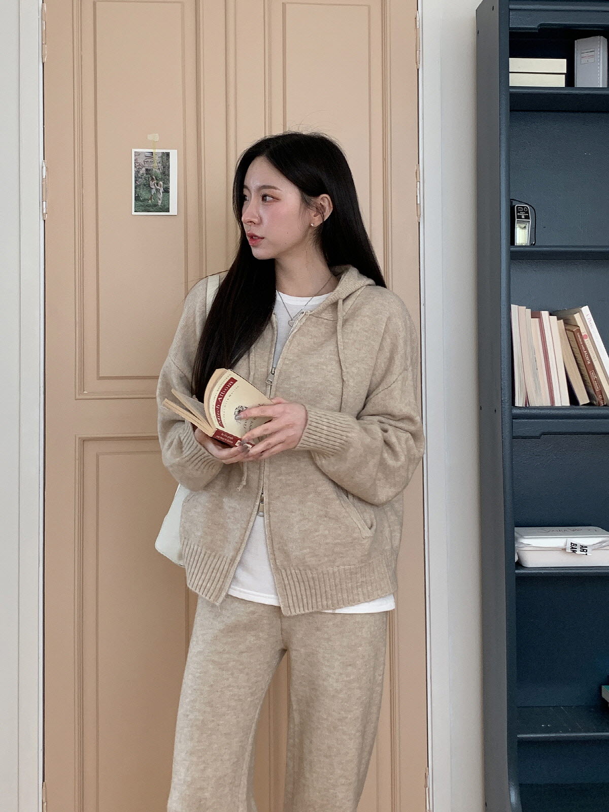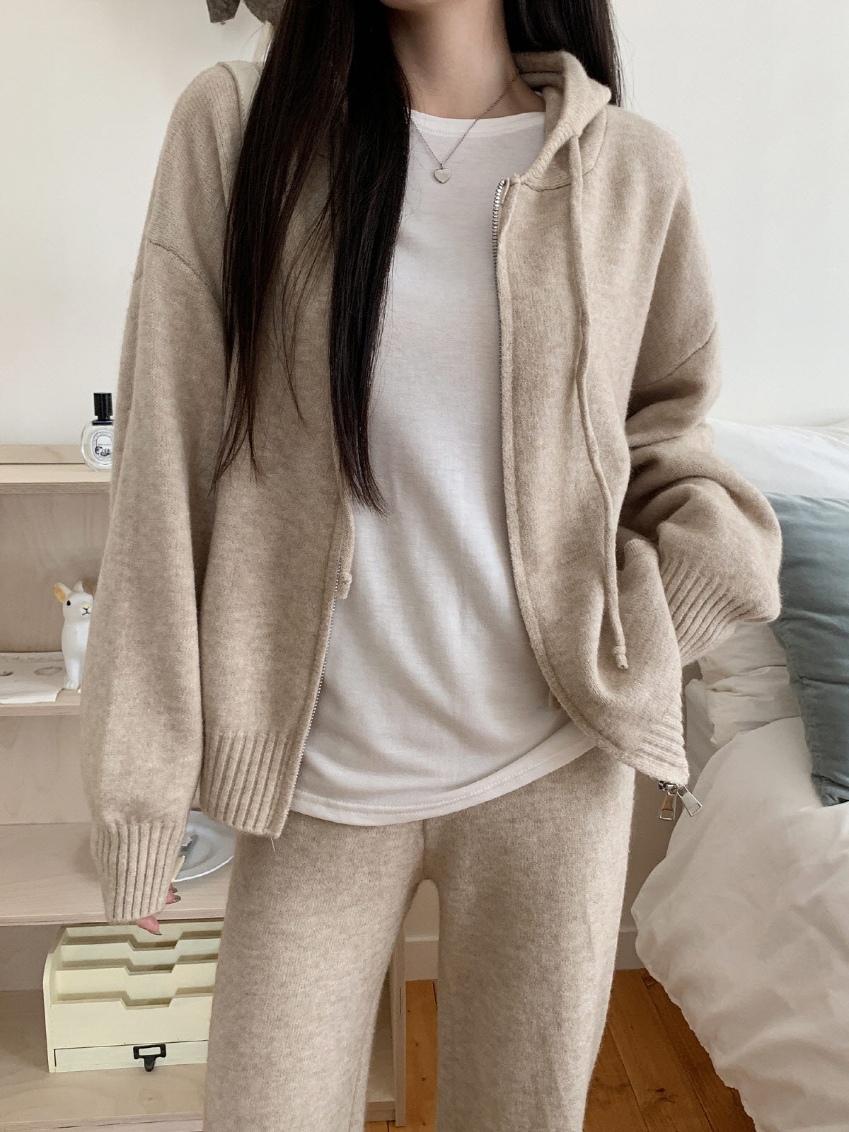 [ SET3632K4A-루투후 루즈 투웨이 니트 후드 집업 밴딩 팬츠 세트 ]