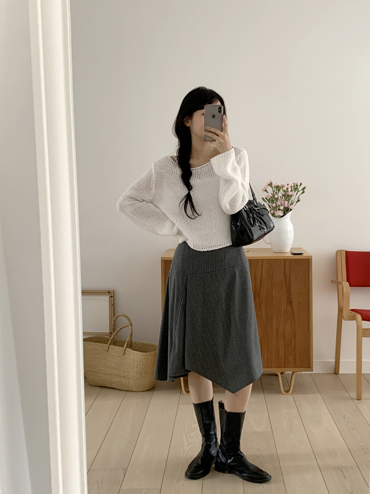 스트라이프에 트임과 언발 디테일로 포인트를 준 미디 스커트
