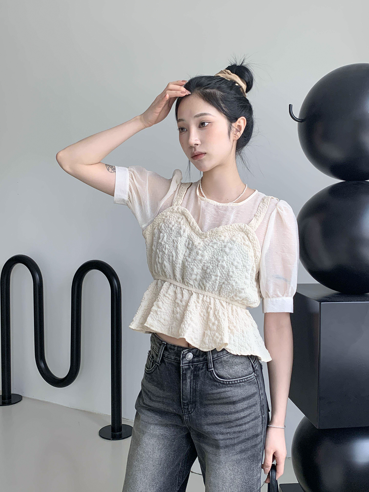 사랑스러운 무드의 셔링이 포인트로 들어가 있어 데이트 룩으로 너무 예쁜 반팔 블라우스 추천해드려요~!