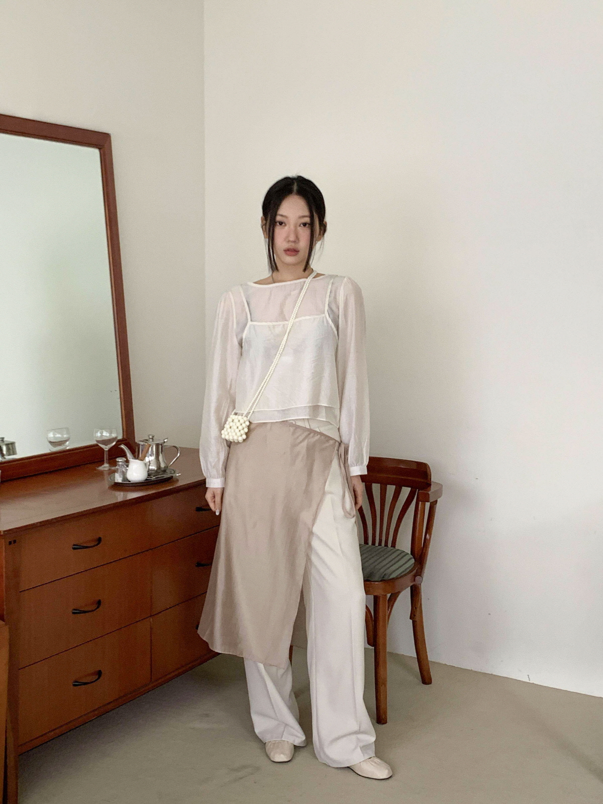 텐셀 소재와 시스루로 여리한 무드가 느껴지는 레이어드 미디 스커트