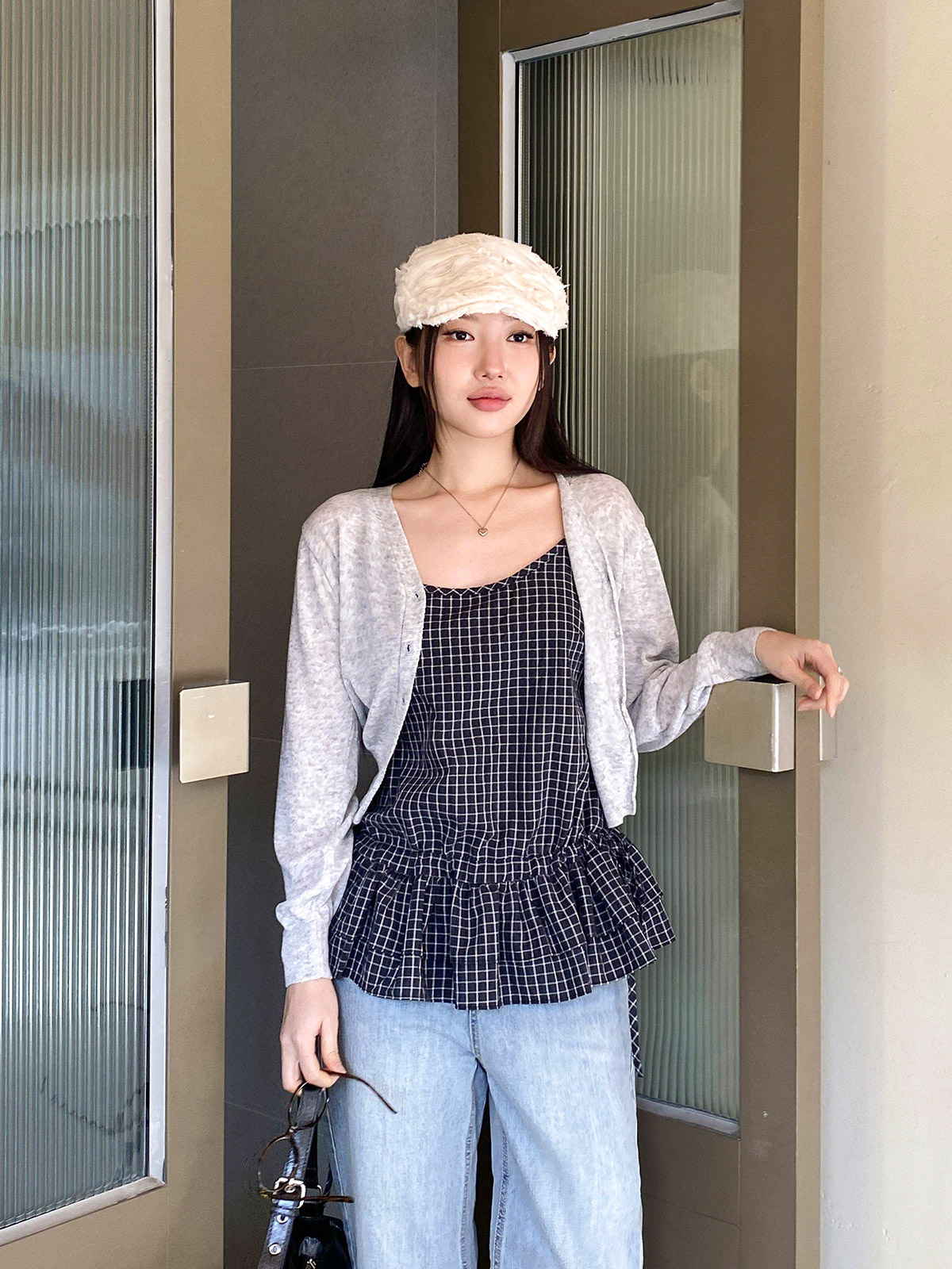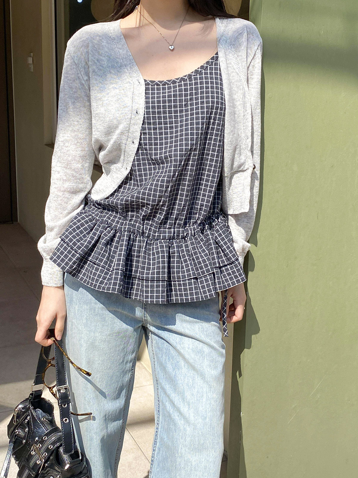 러블리한 무드의 리본 스트랩이 포인트인 체크 나시 뷔스티에 블라우스