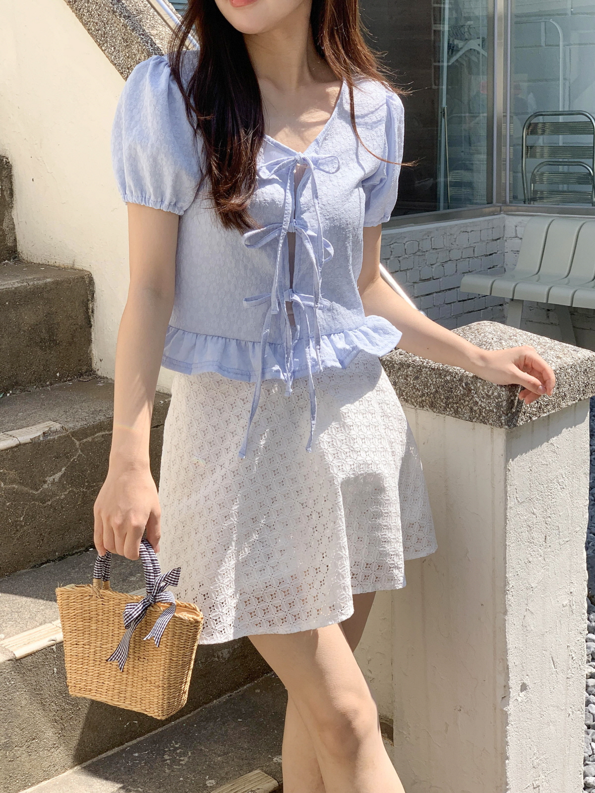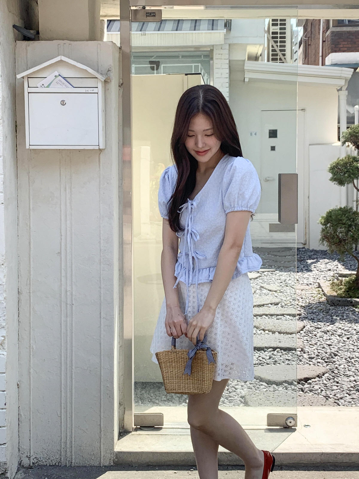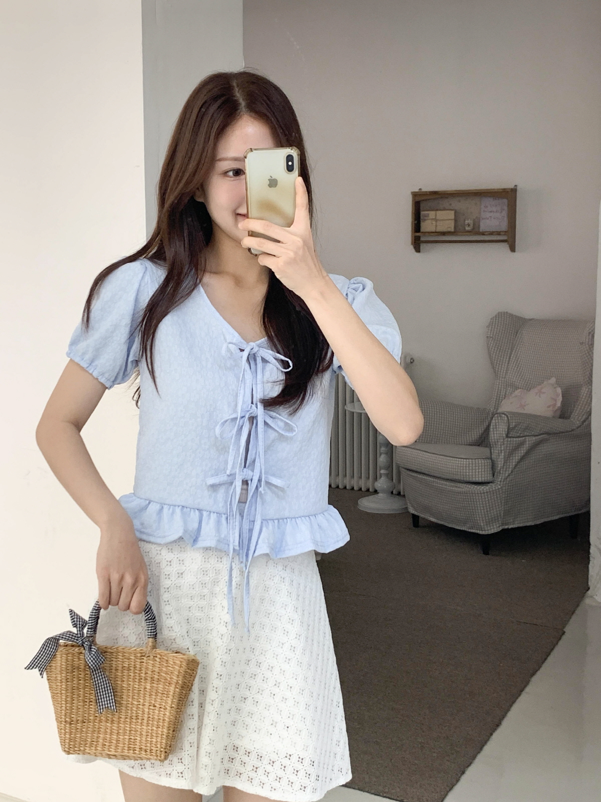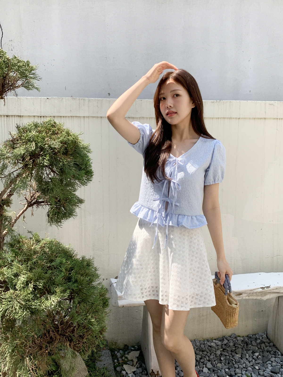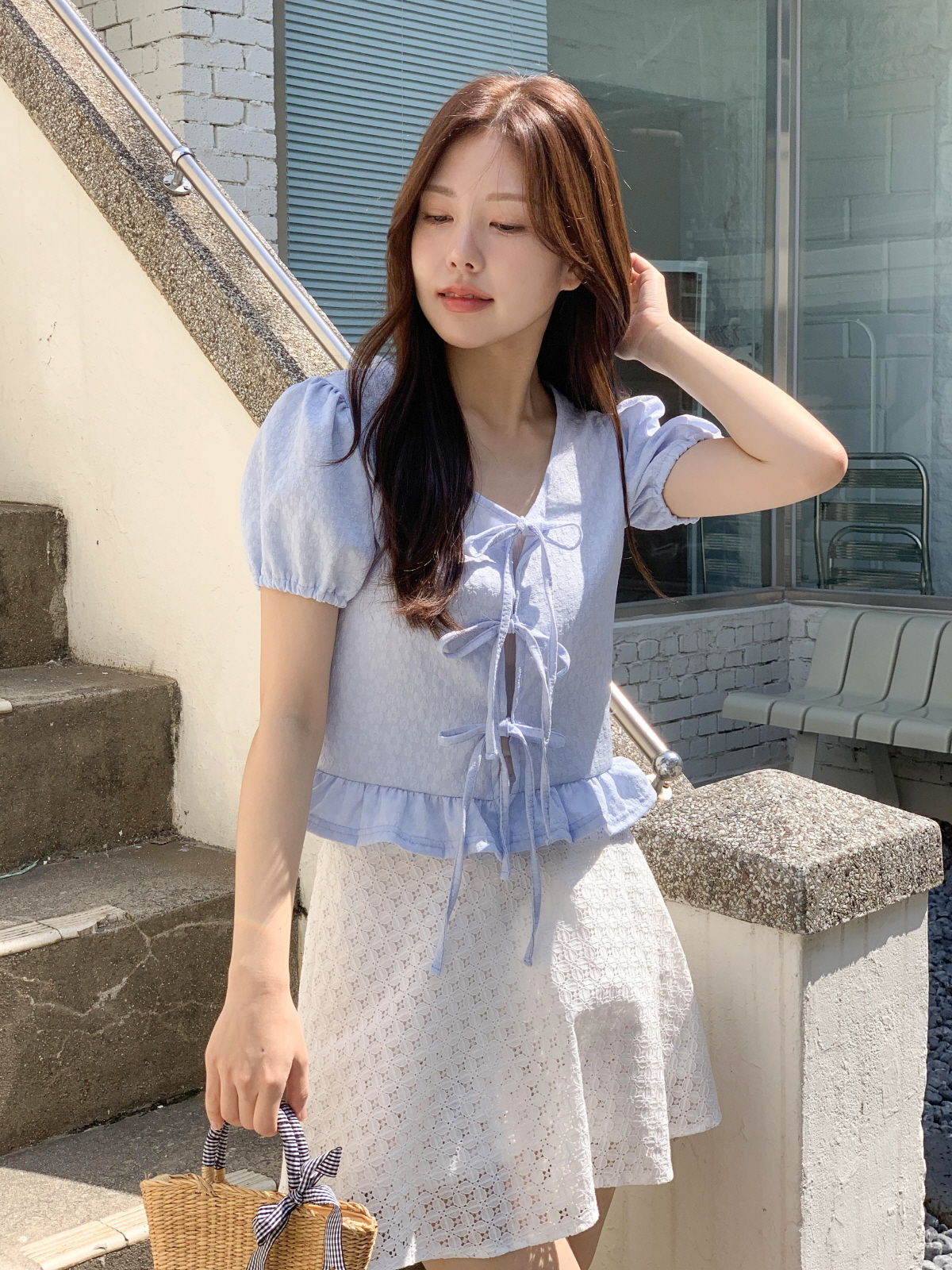 퍼프소매와 밑단 프릴 디테일로 러블리한 무드를 느낄 수 있는 반팔 블라우스 가디건