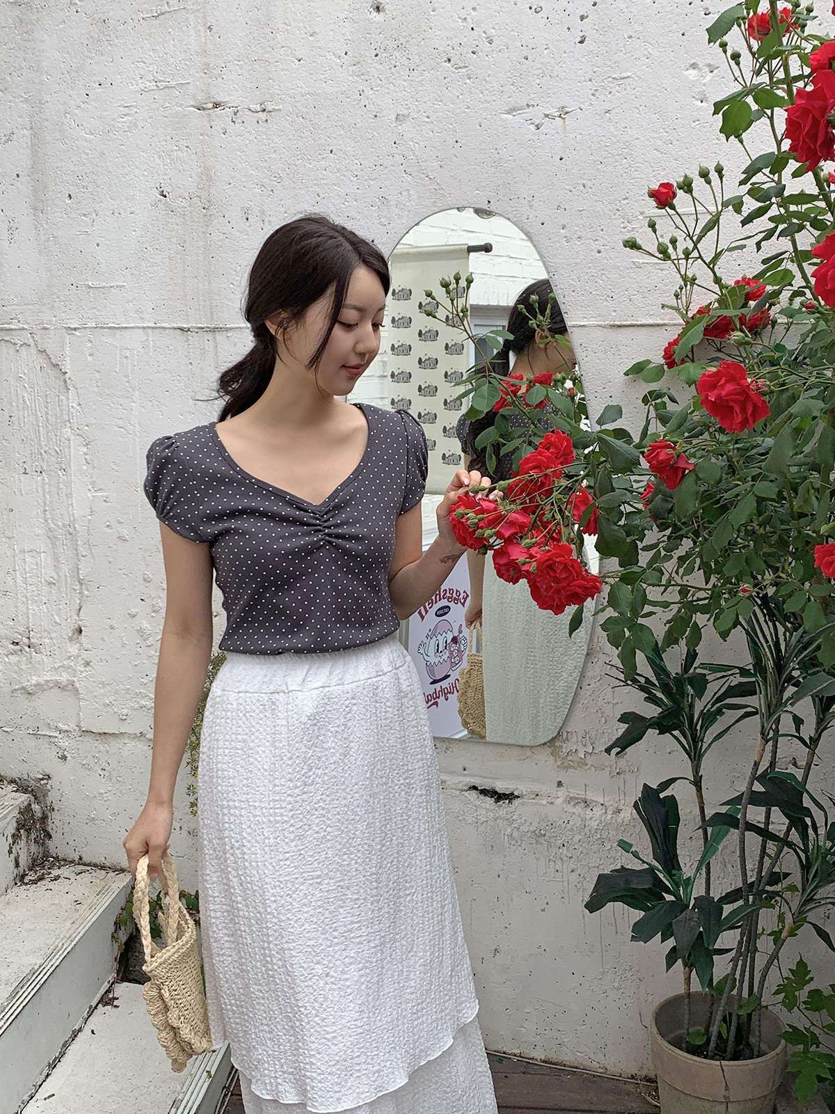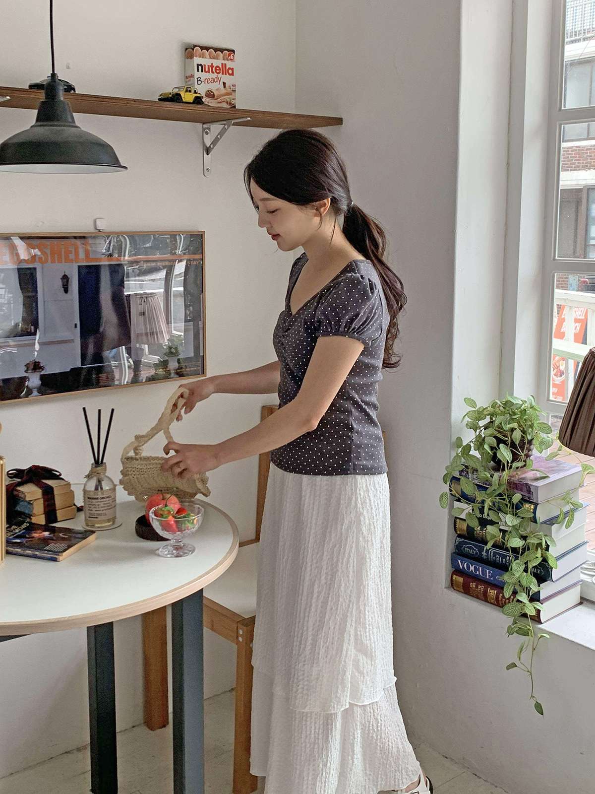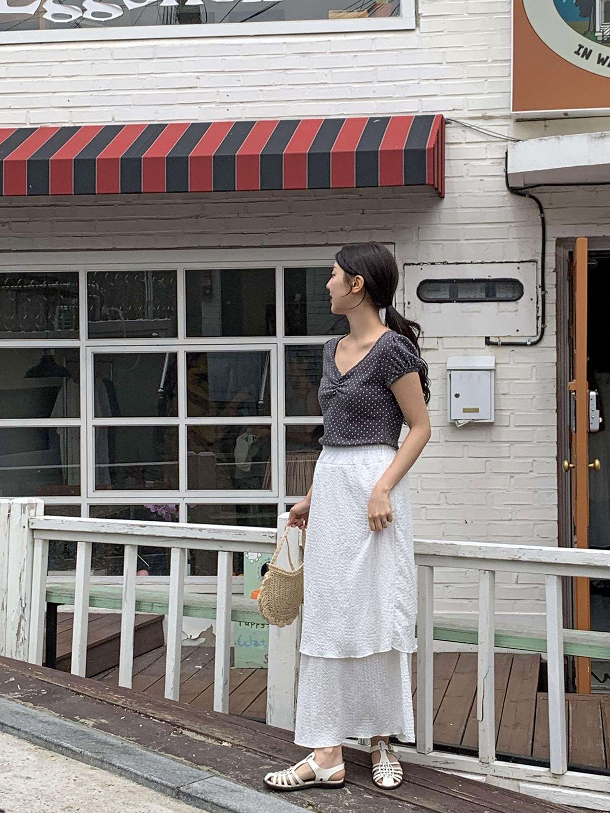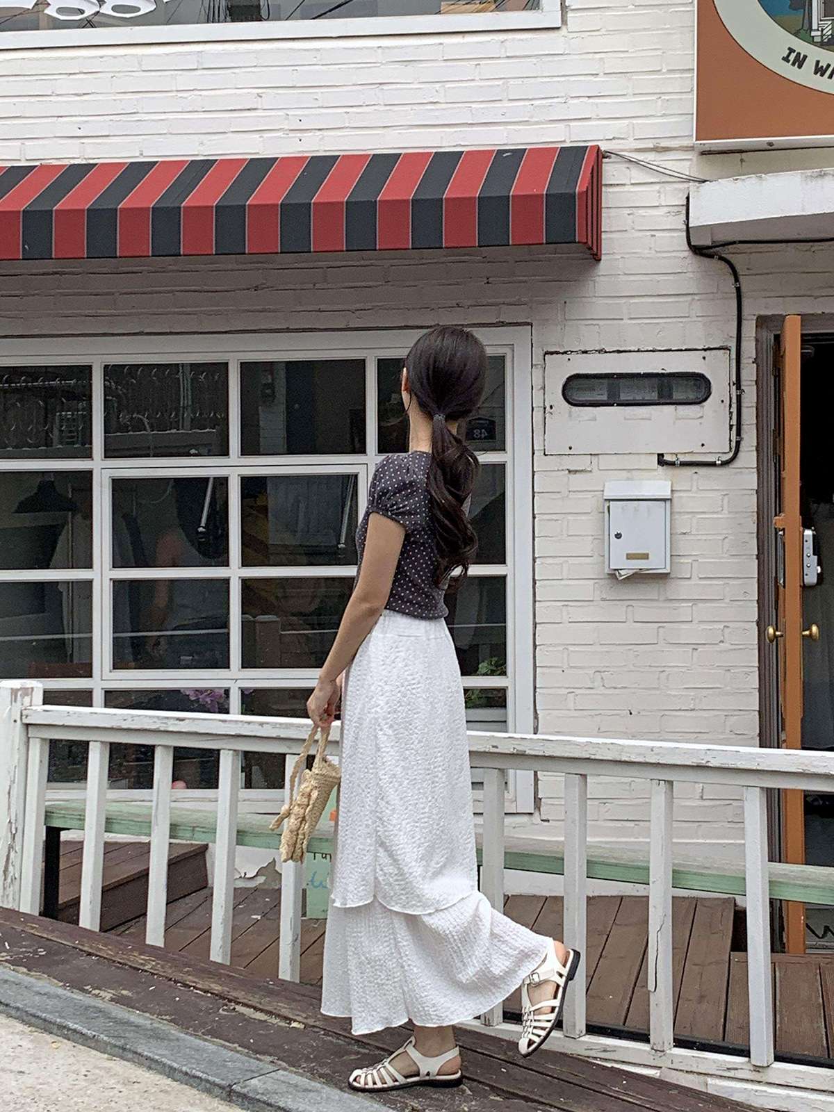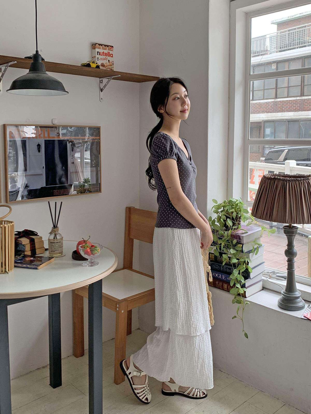 [ SK7227K55-츠리인 엠보 프릴 레이어드 캉캉 밴딩 롱 스커트 ]