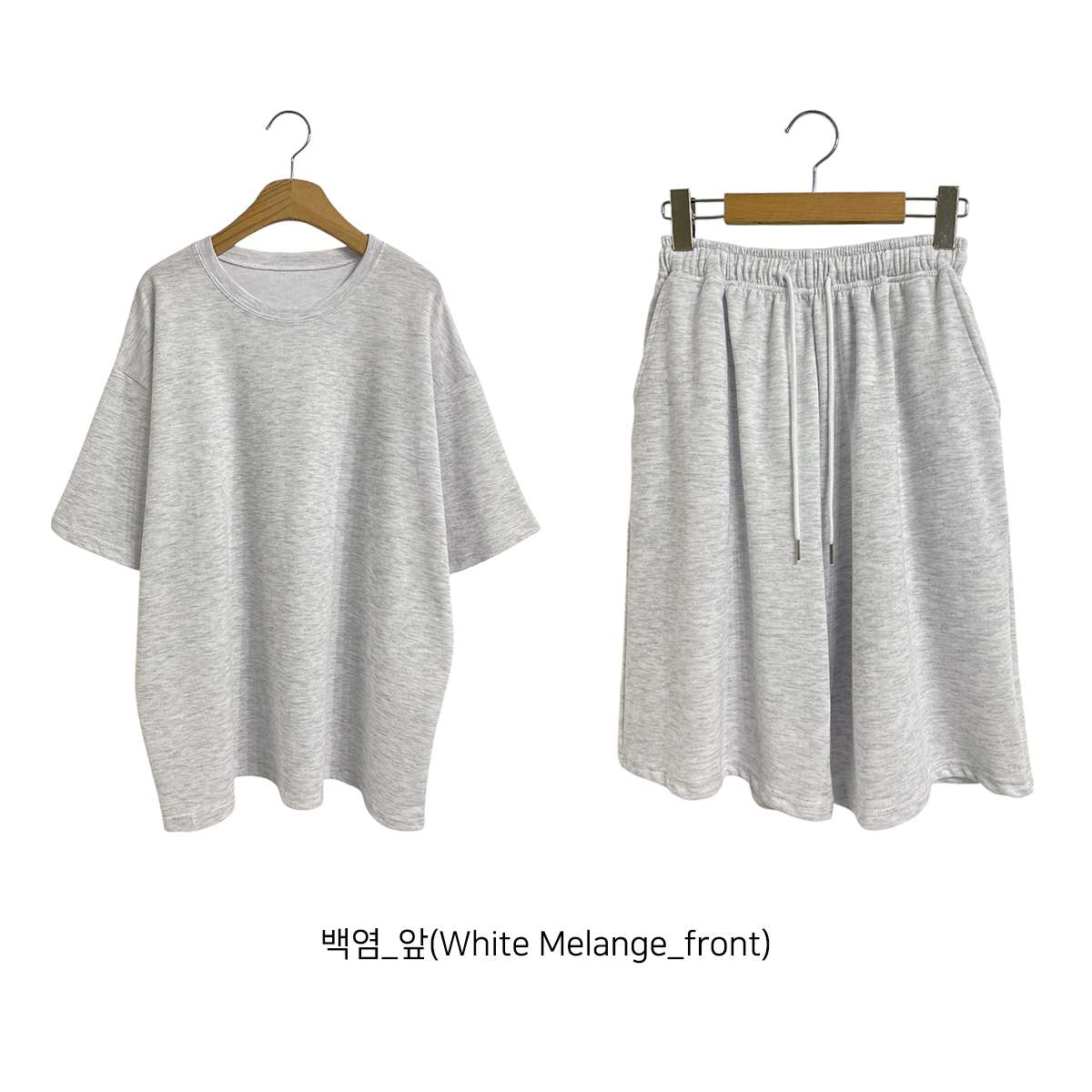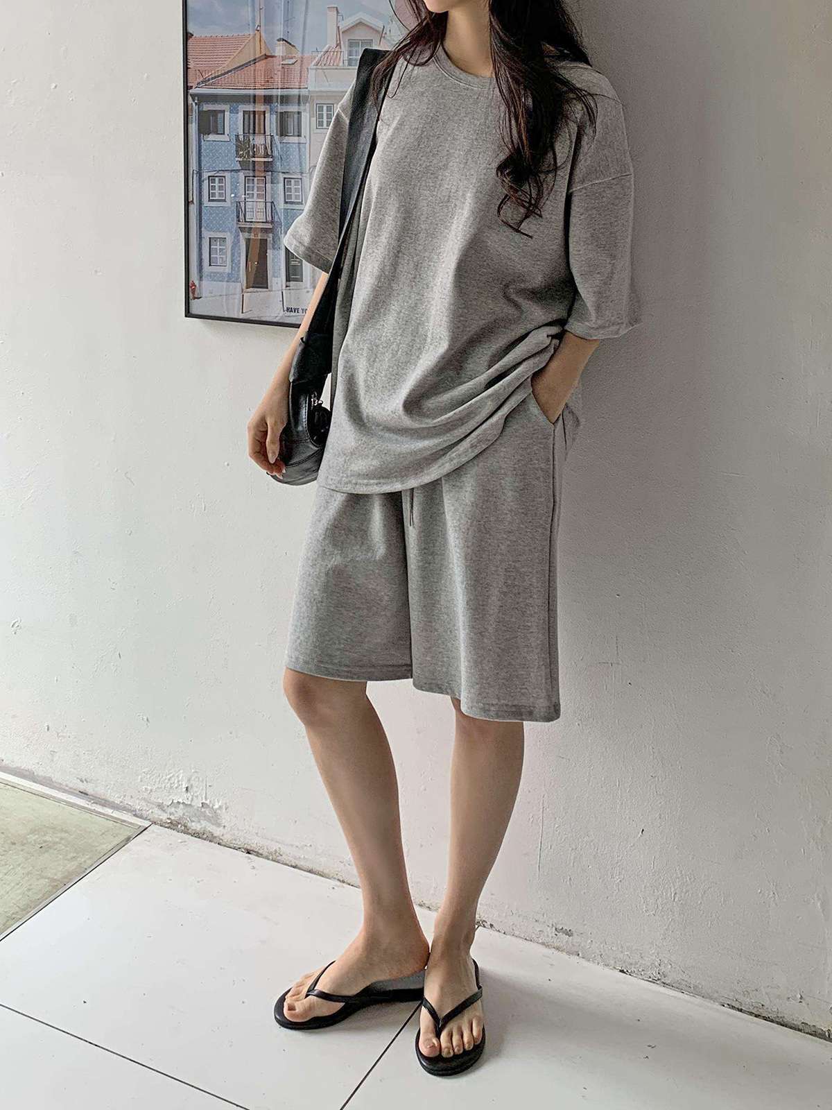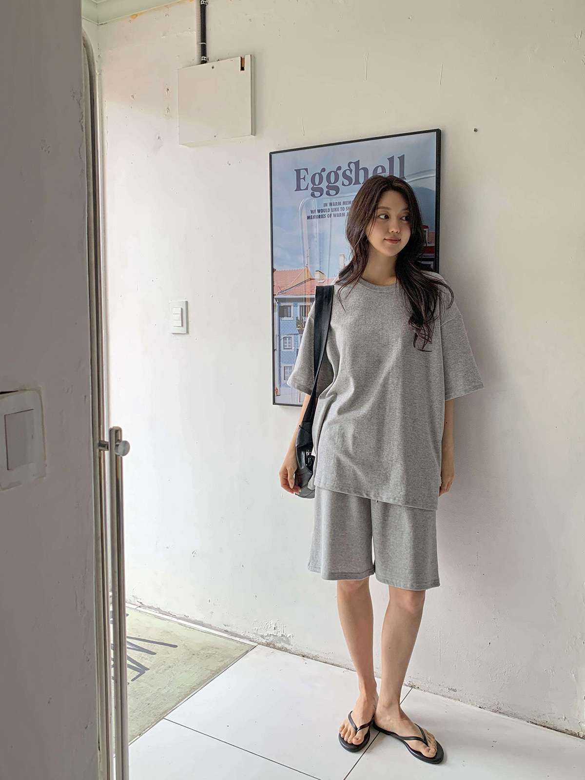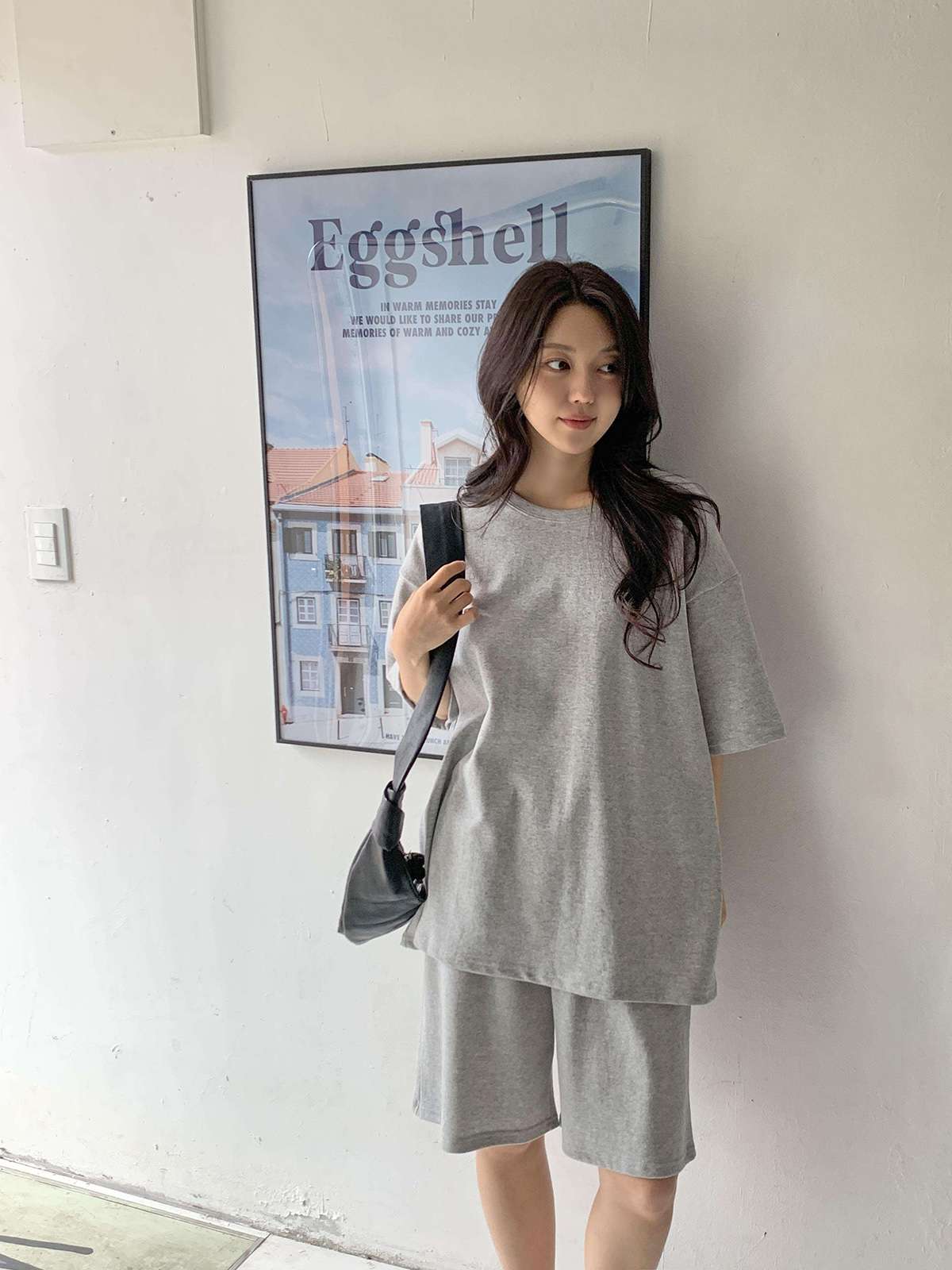 [ SET3735K55-피리인 코튼 오버핏 반팔티 밴딩 버뮤다 팬츠 세트 ]