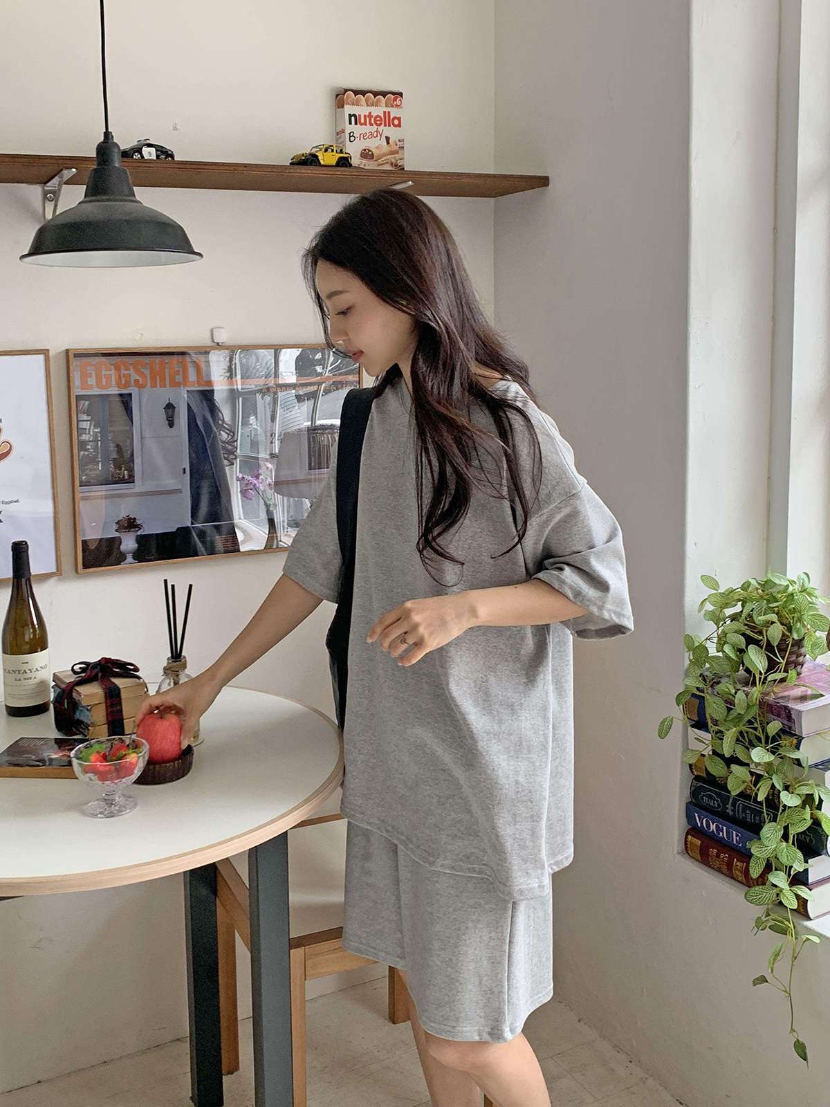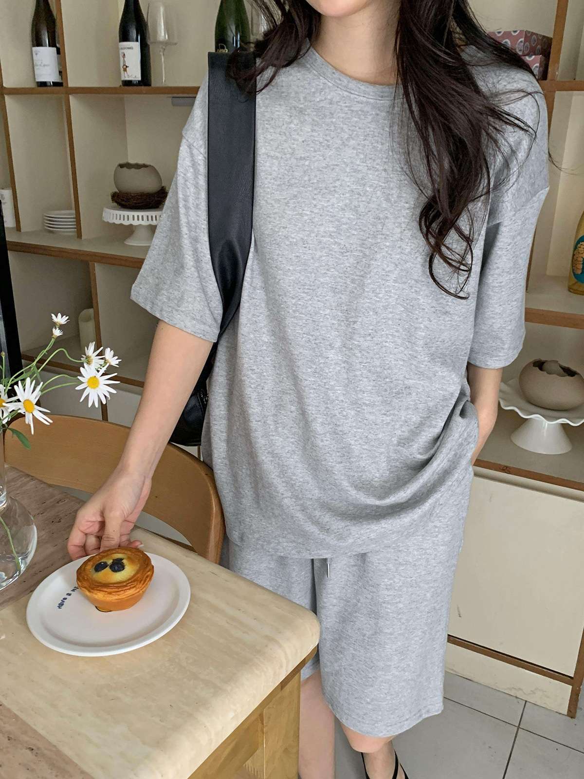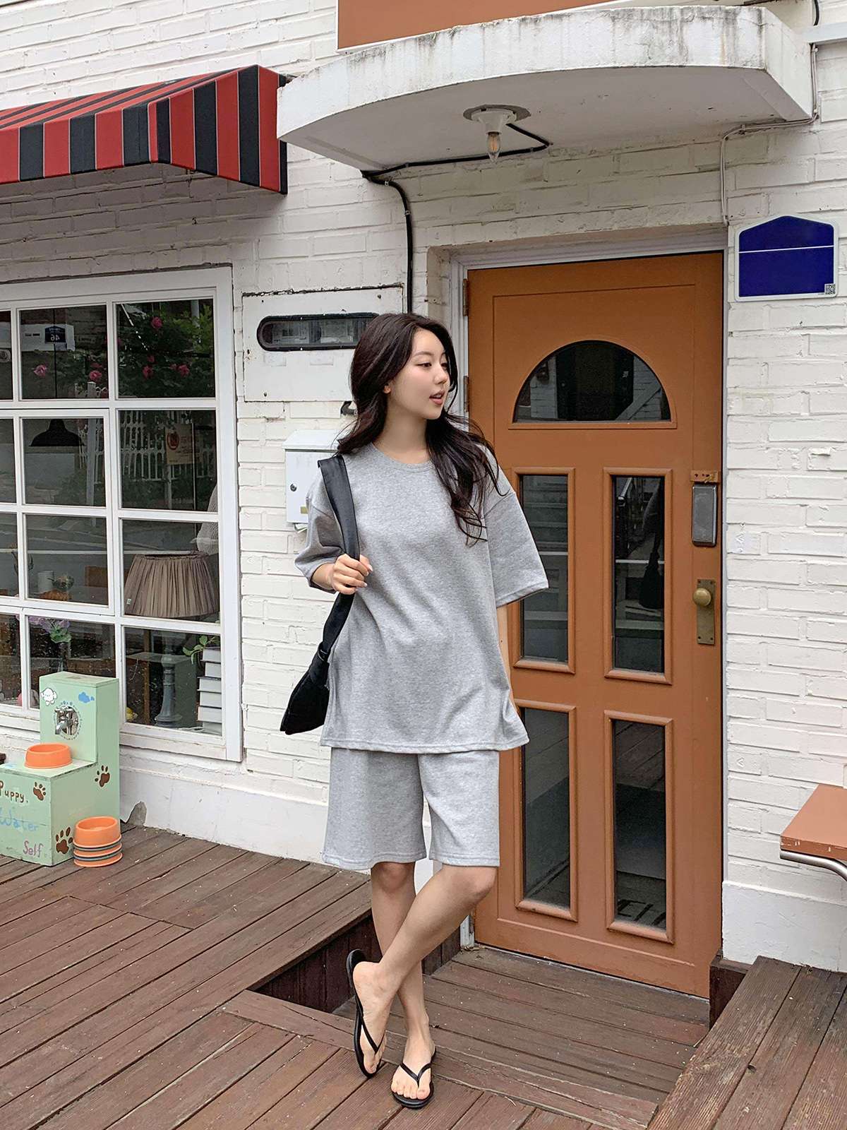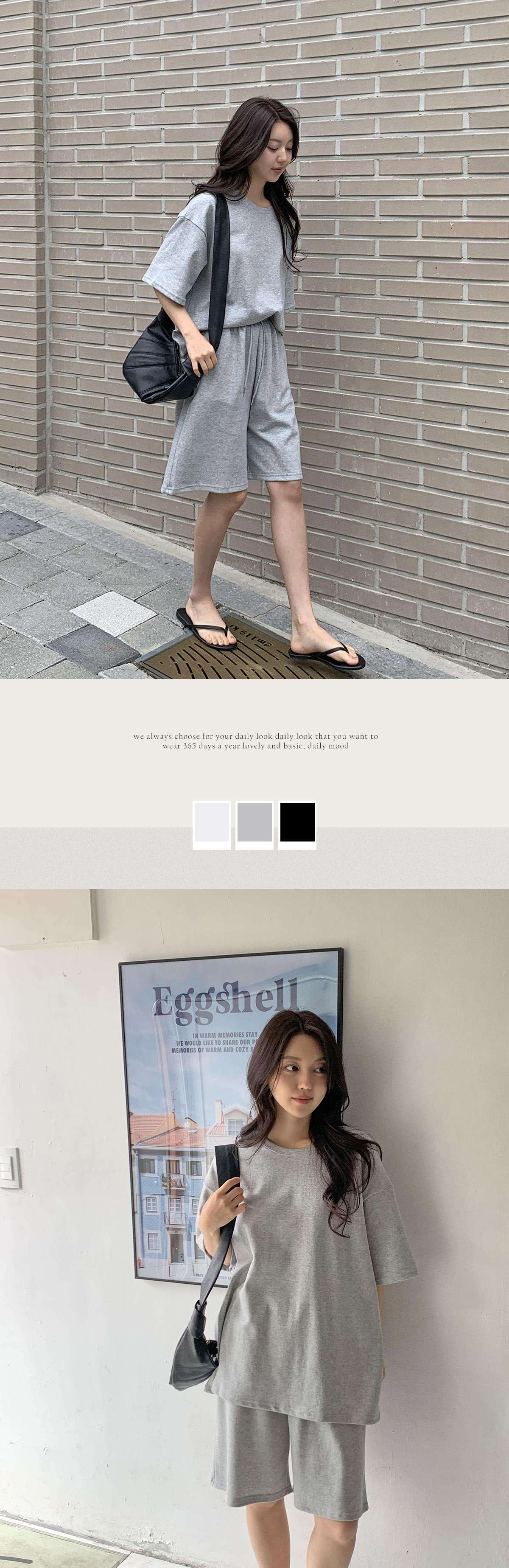 [ SET3735K55-피리인 코튼 오버핏 반팔티 밴딩 버뮤다 팬츠 세트 ]