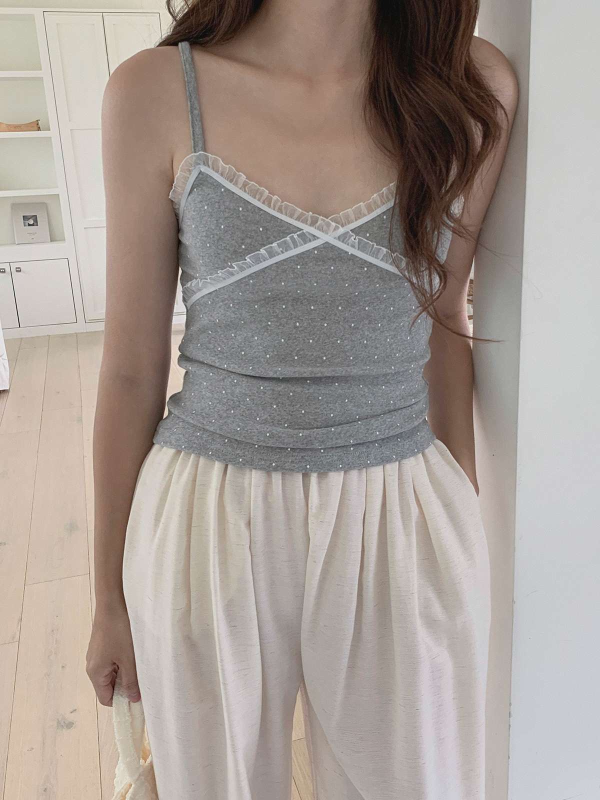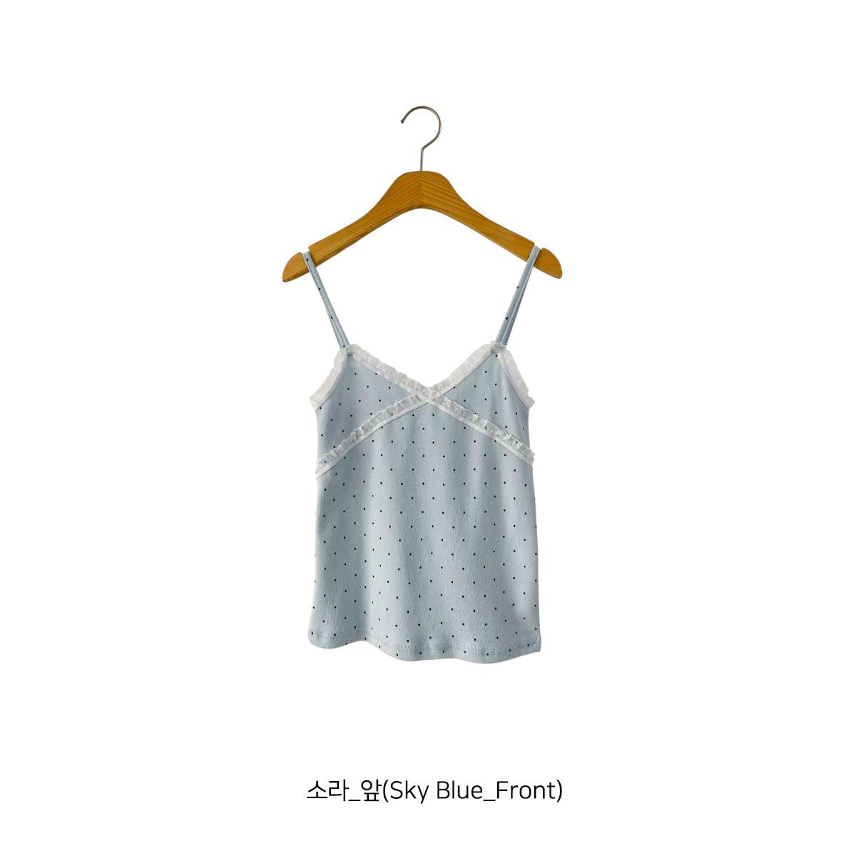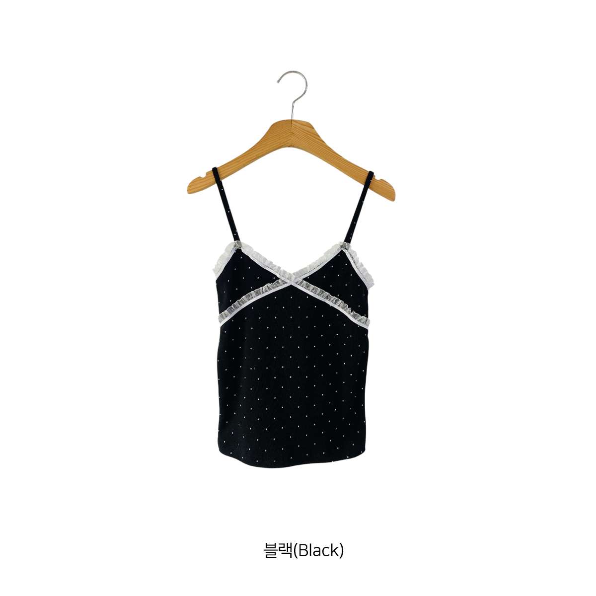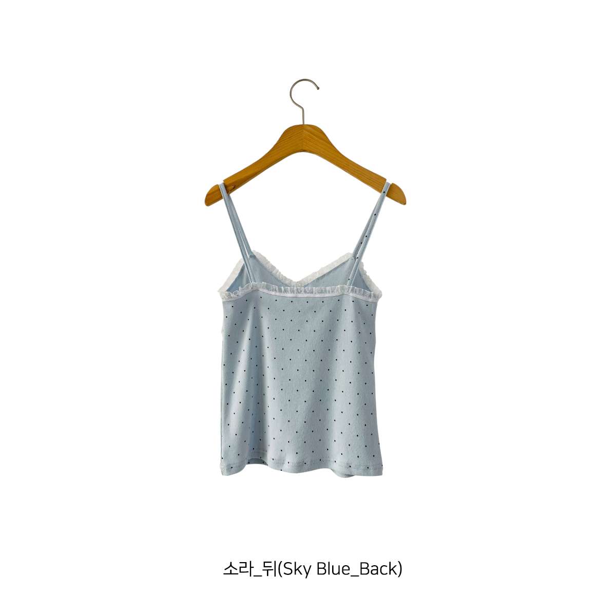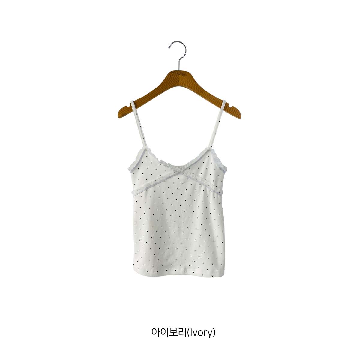 도트 패턴에 레이스 디테일로 러블리한 무드의 끈나시