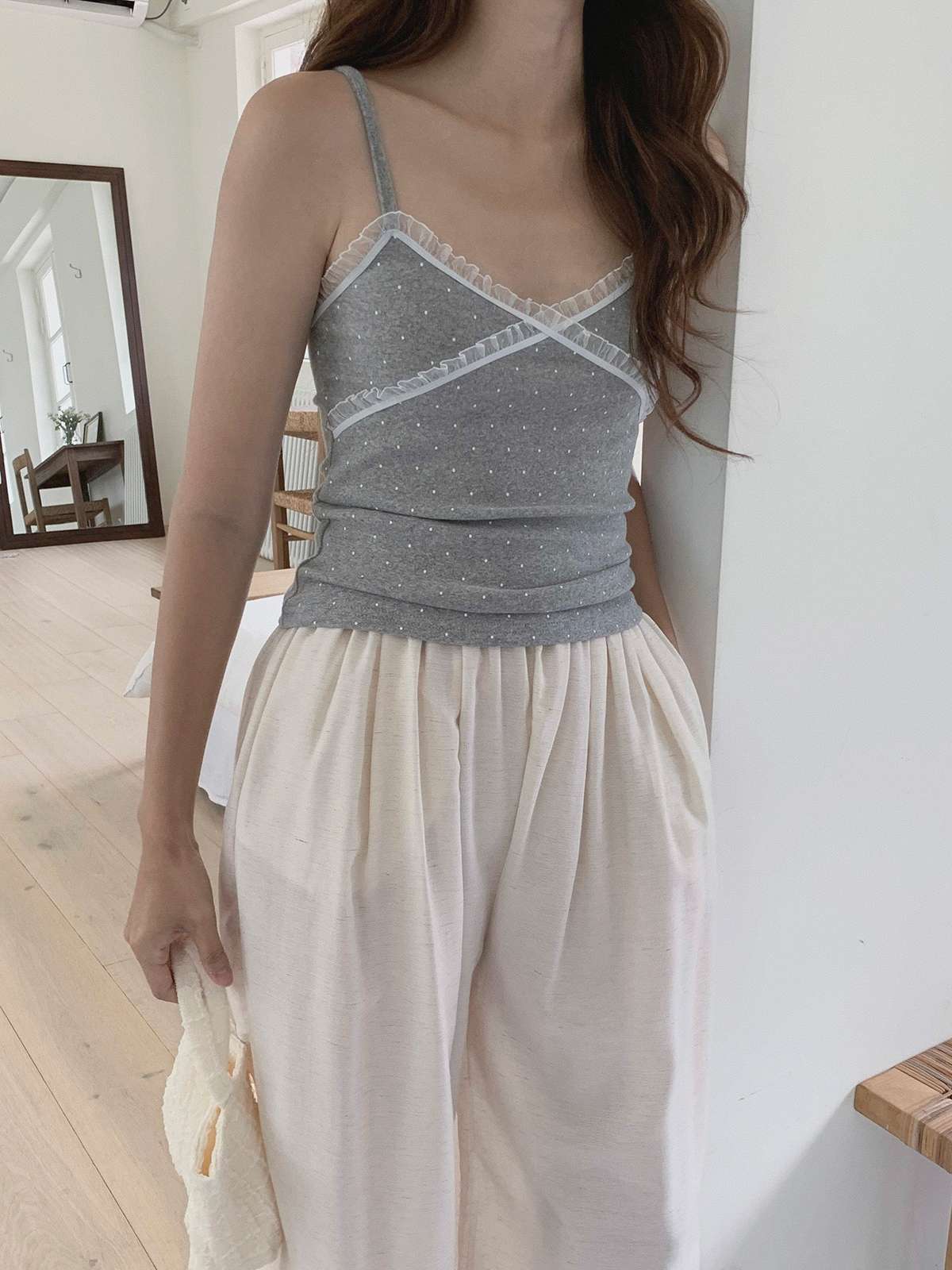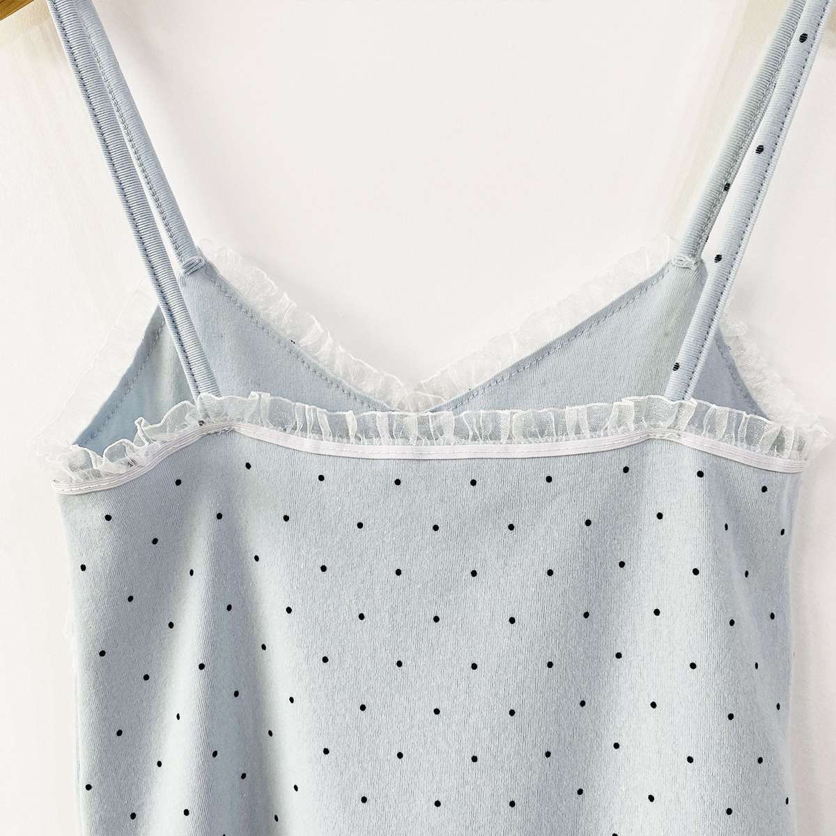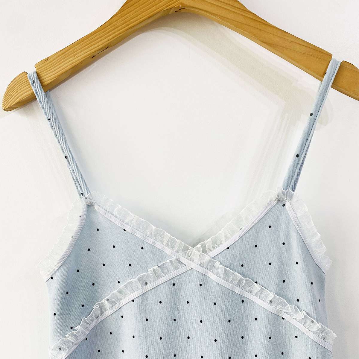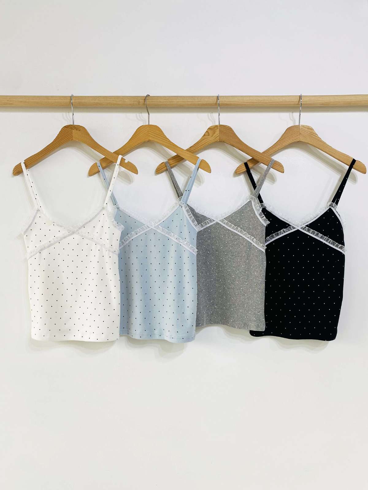 도트 패턴에 레이스 디테일로 러블리한 무드의 끈나시