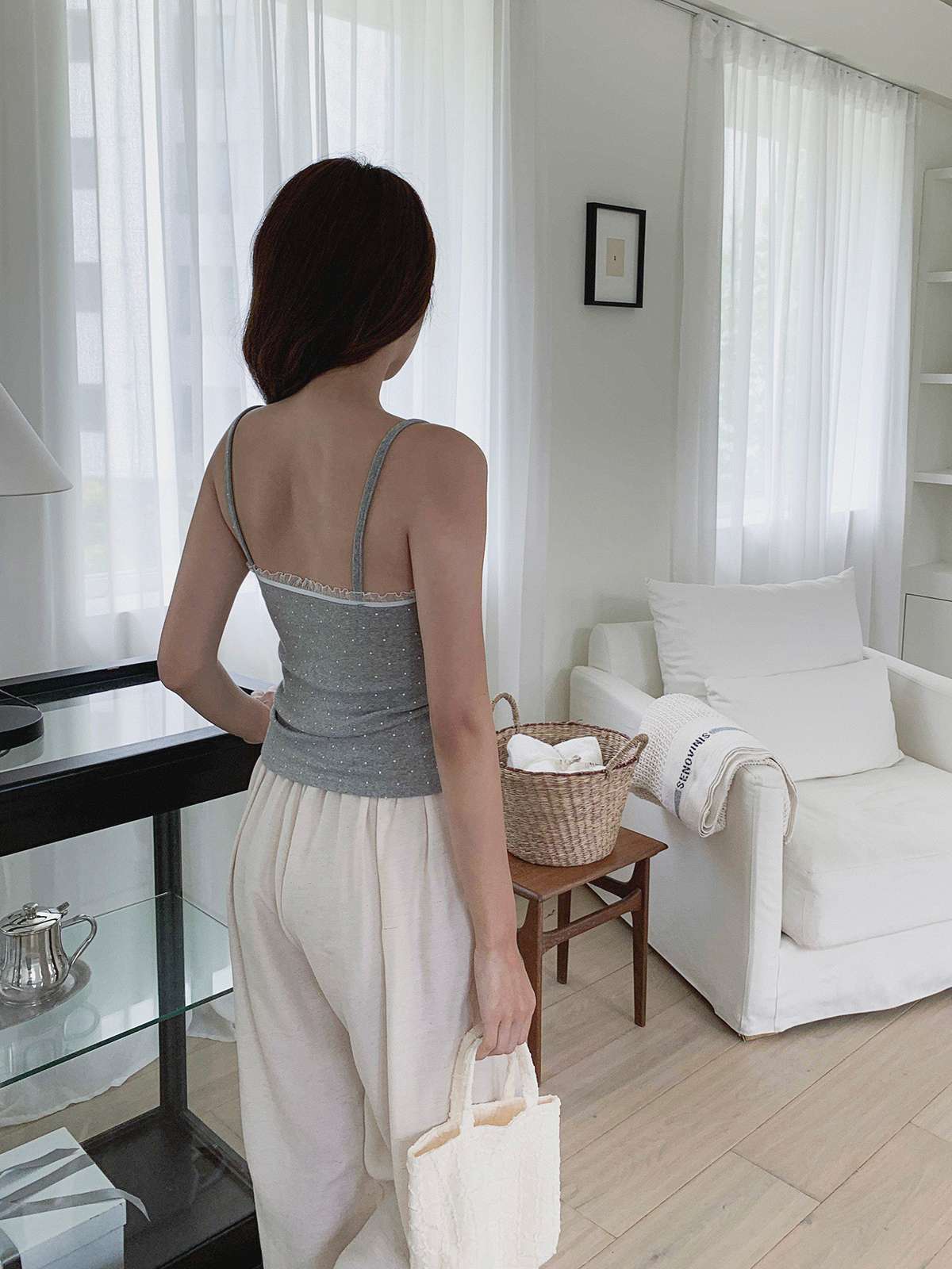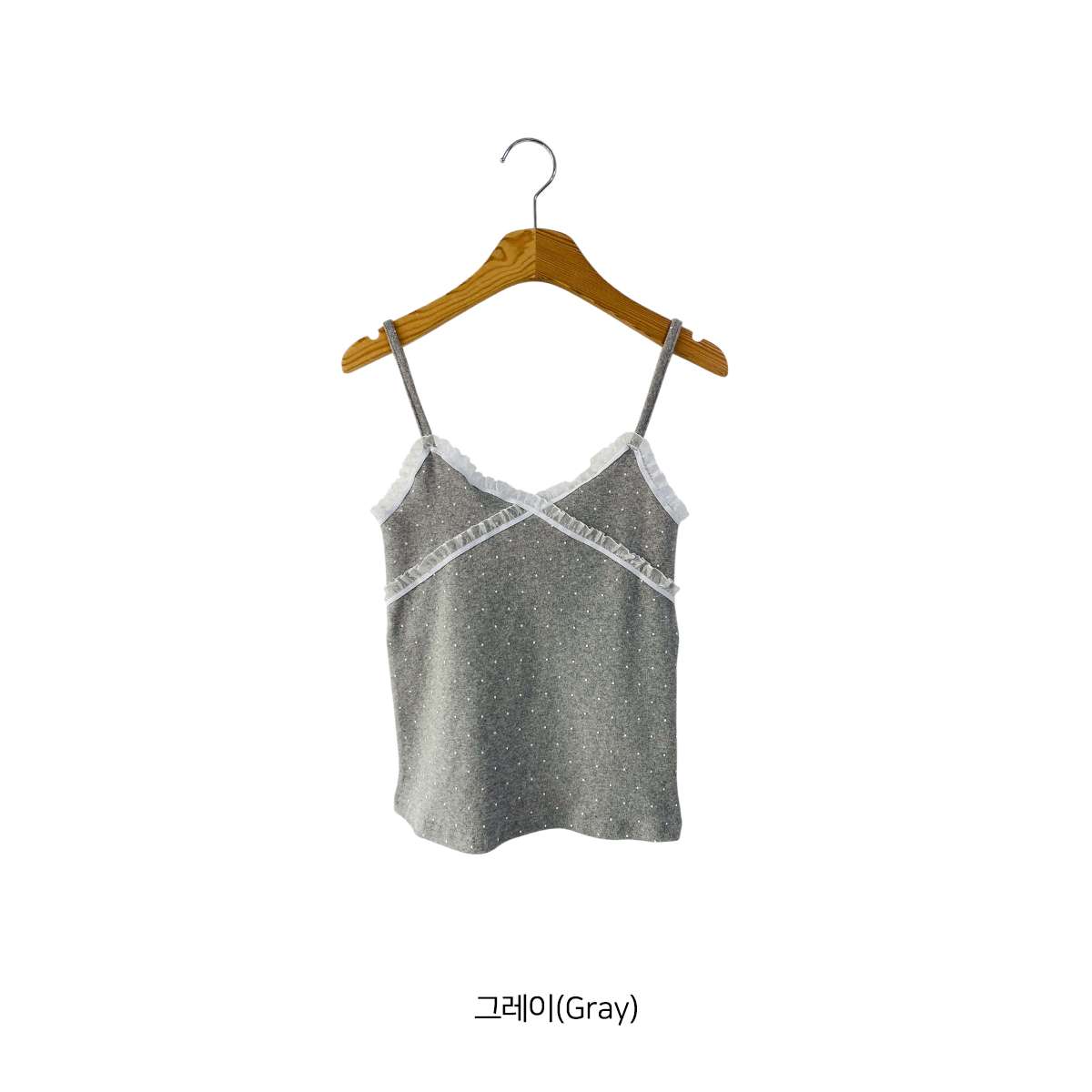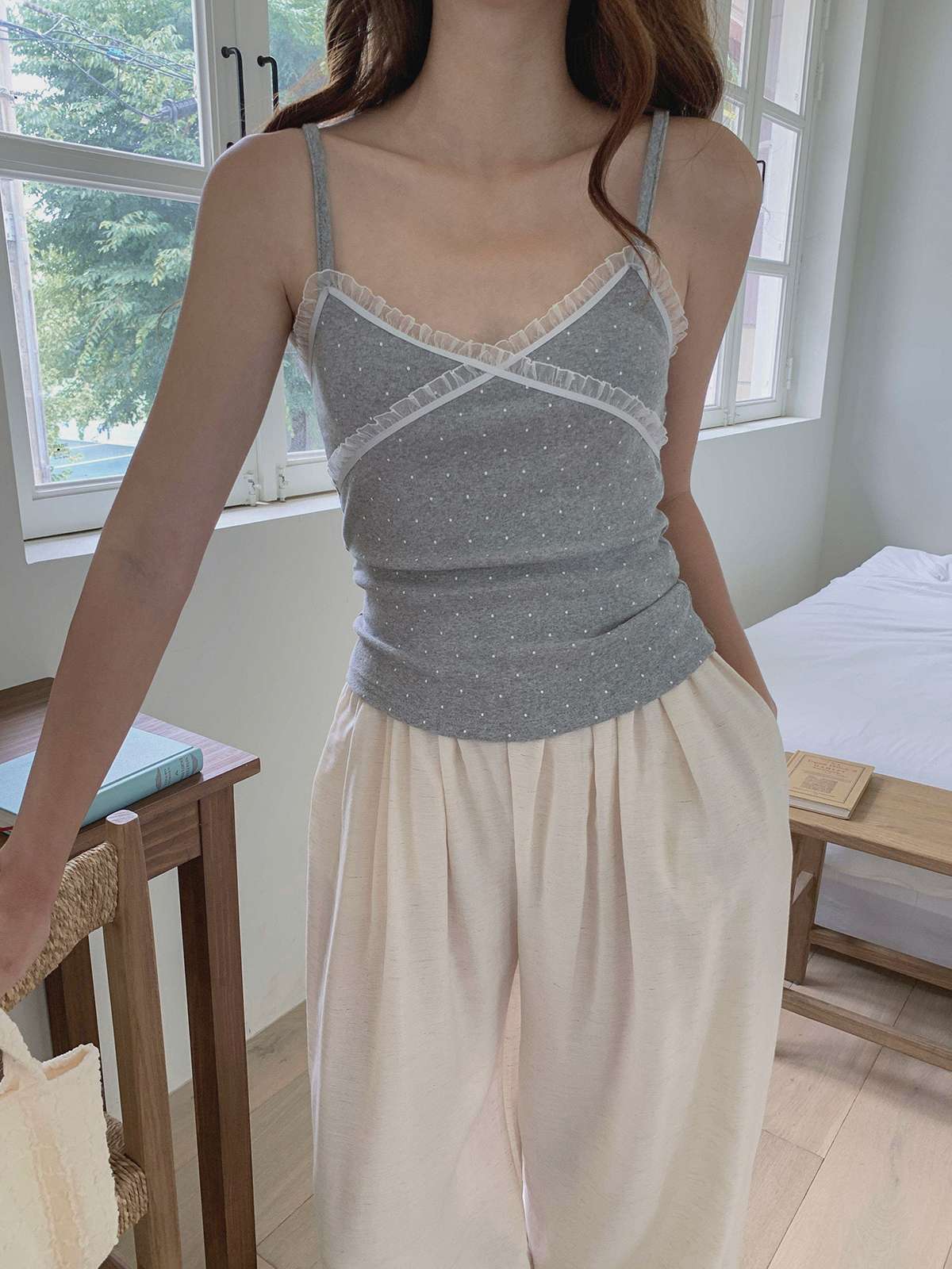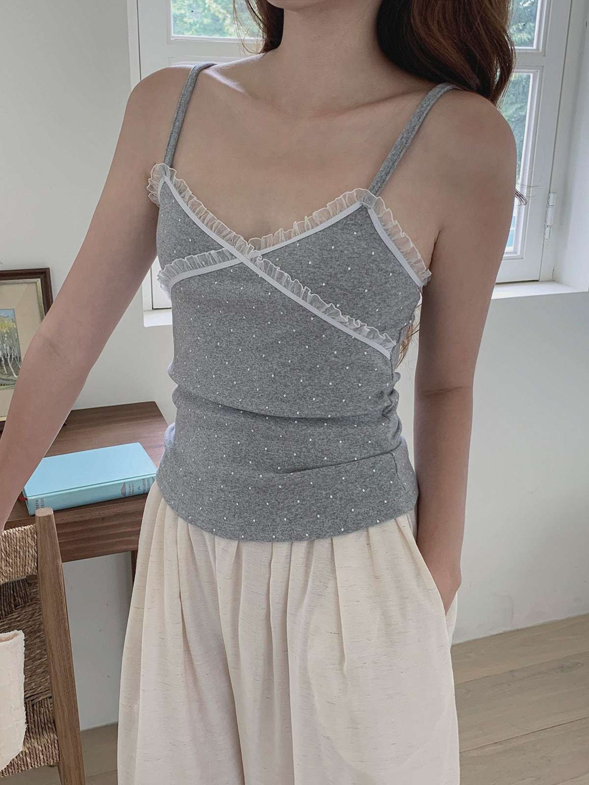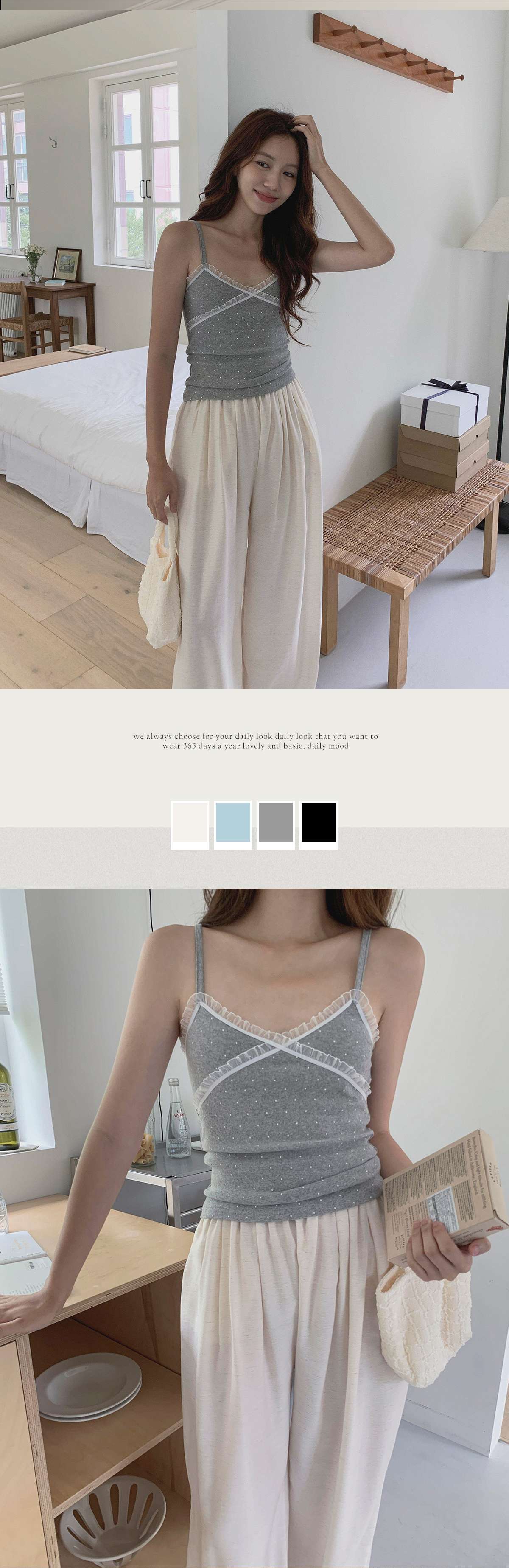 도트 패턴에 레이스 디테일로 러블리한 무드의 끈나시