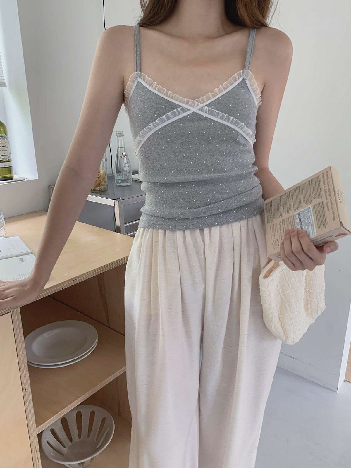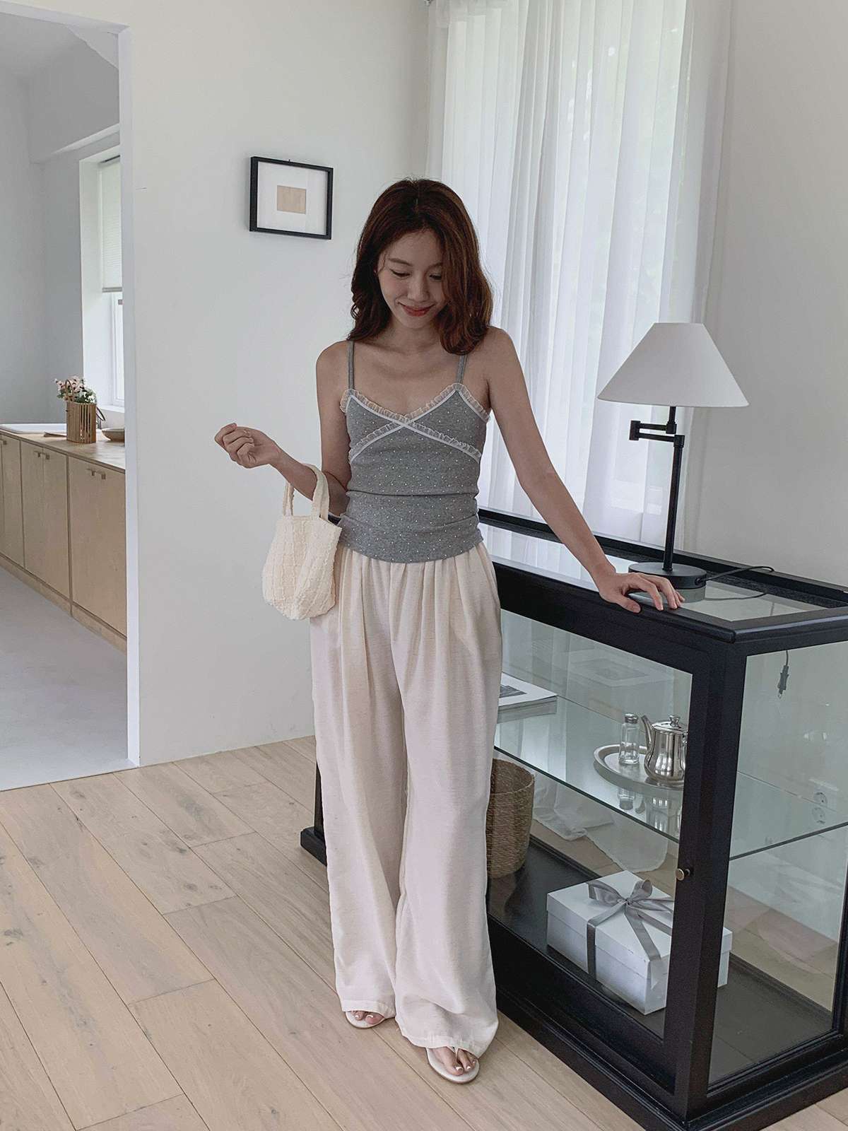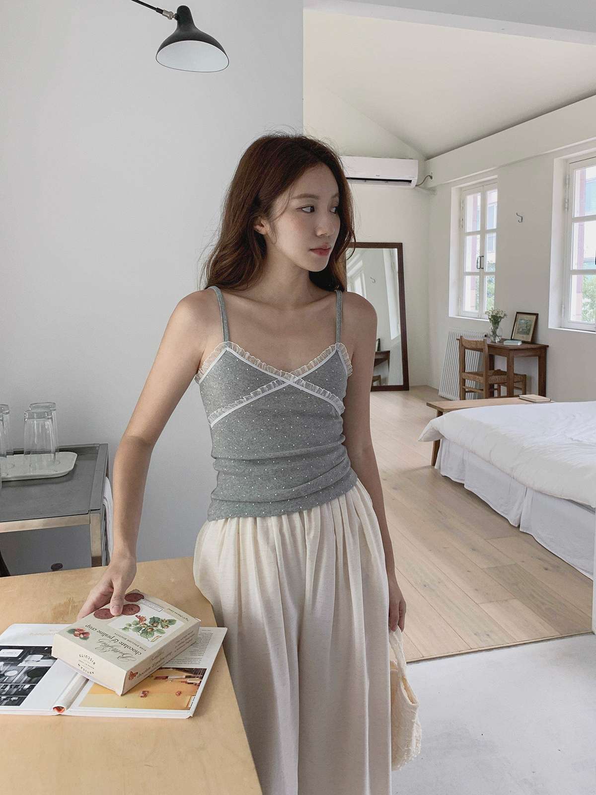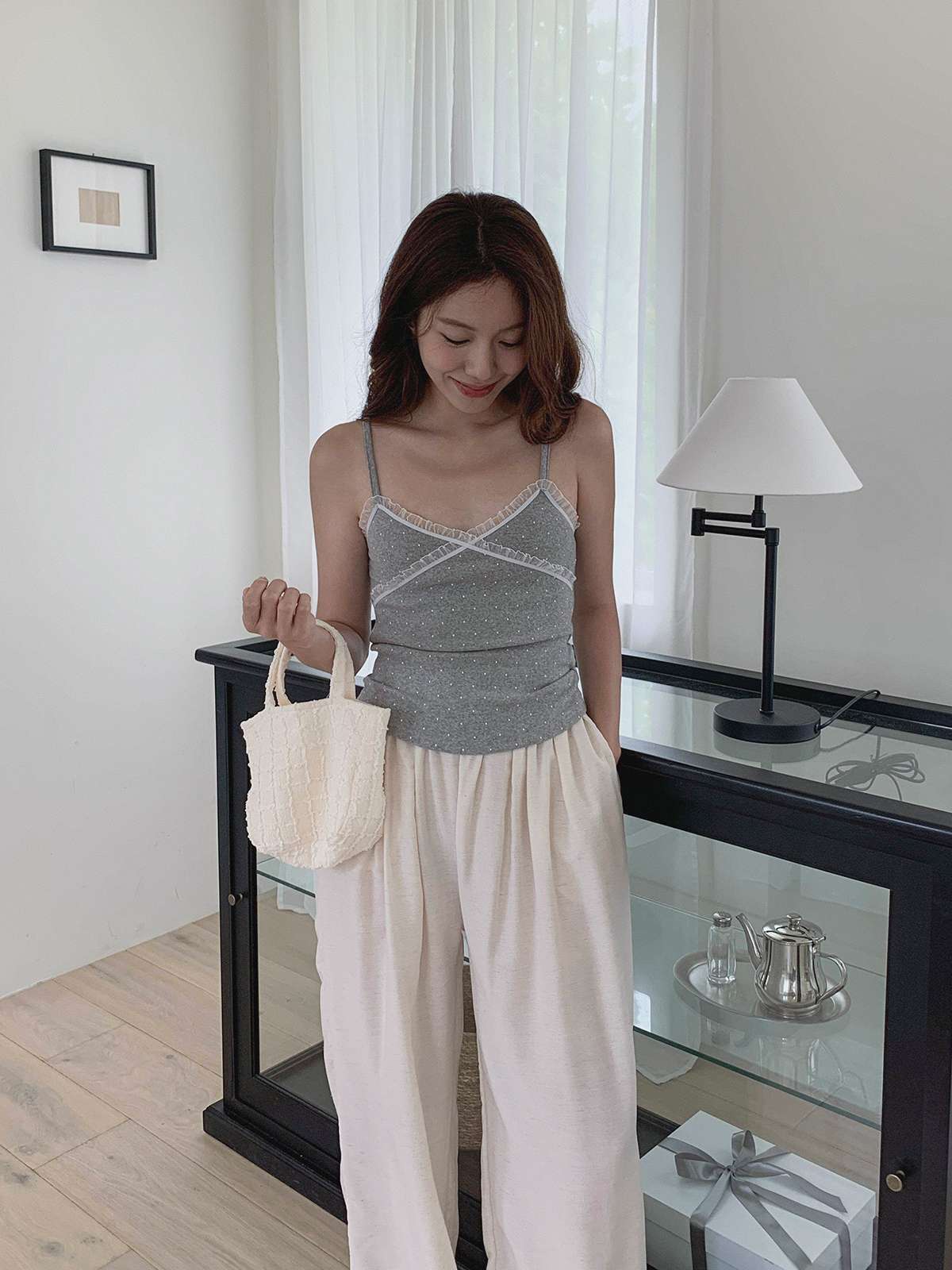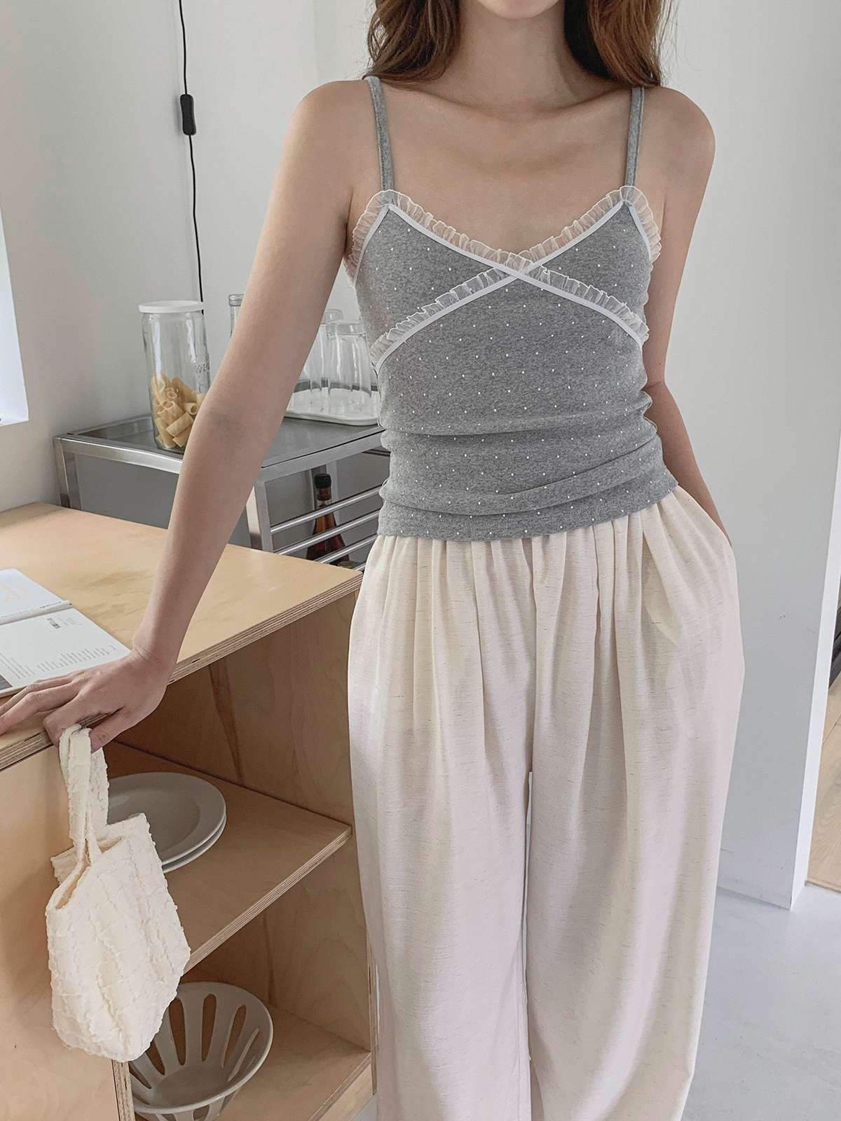 도트 패턴에 레이스 디테일로 러블리한 무드의 끈나시