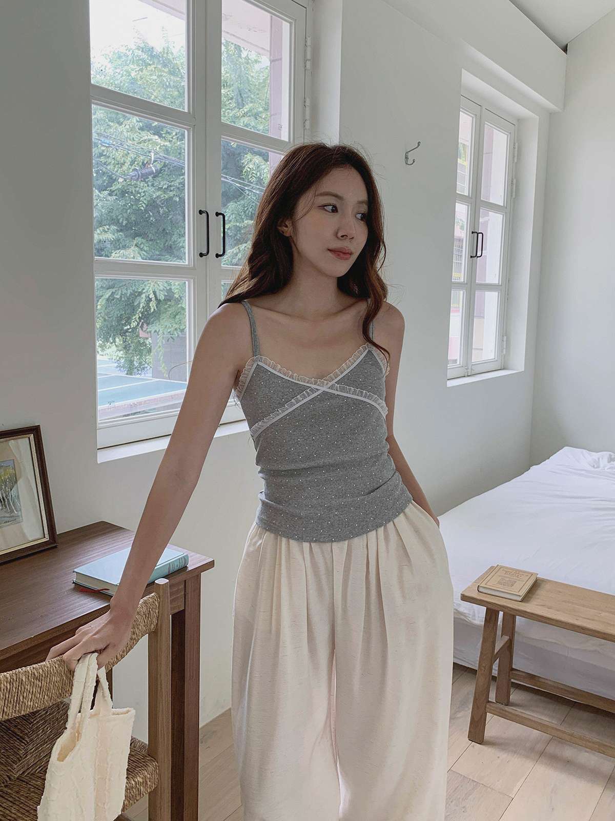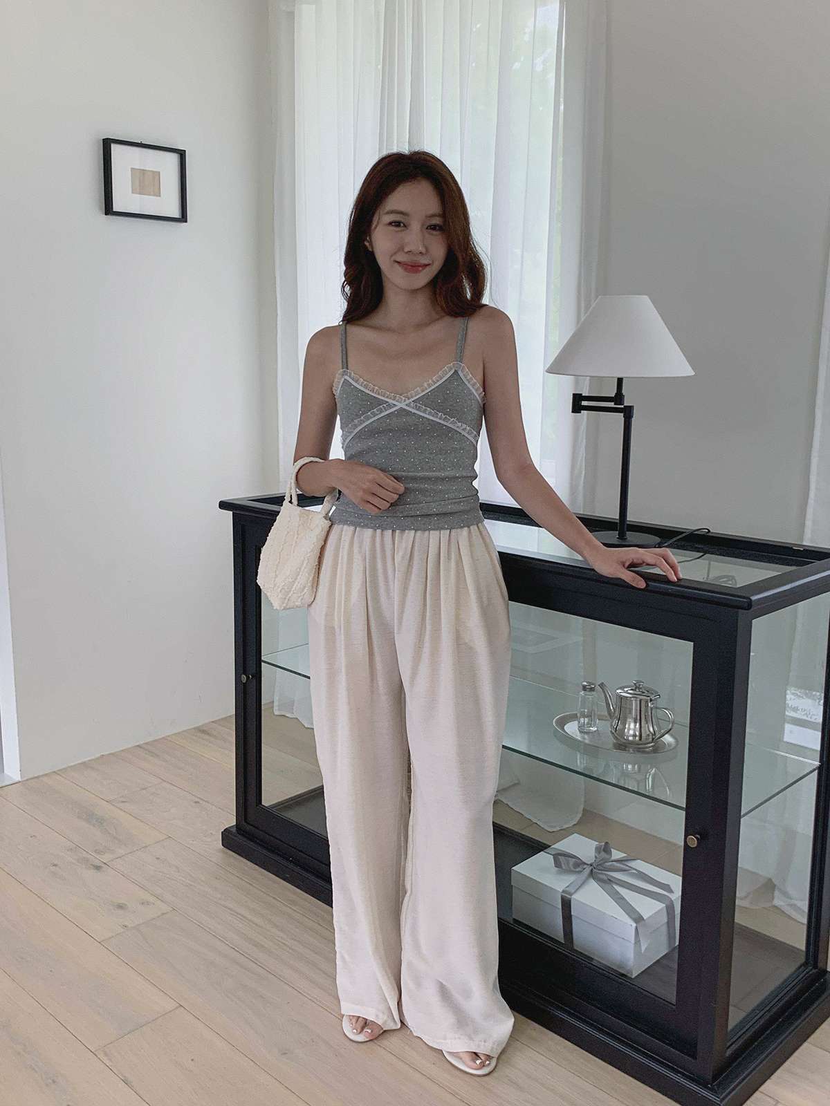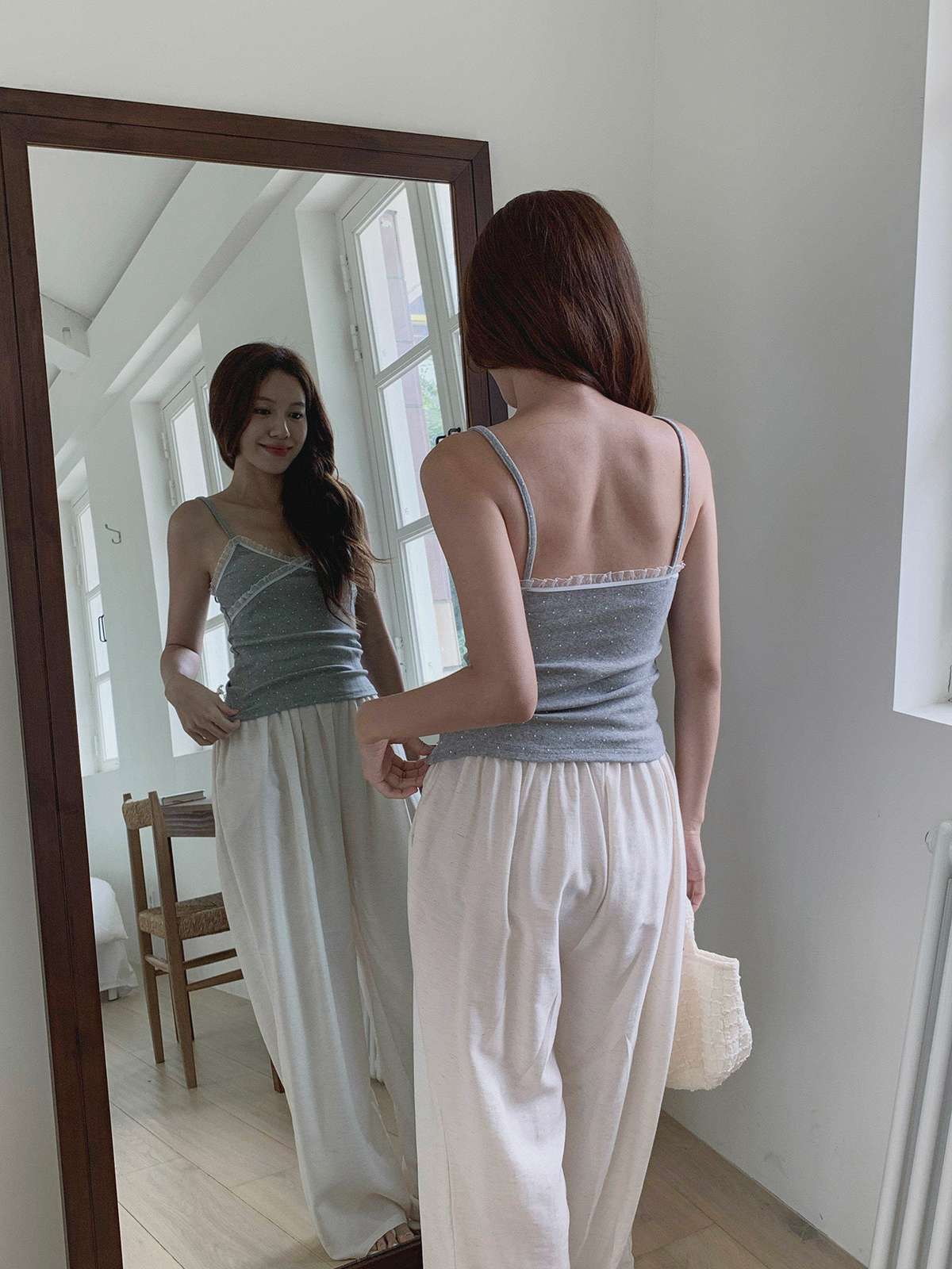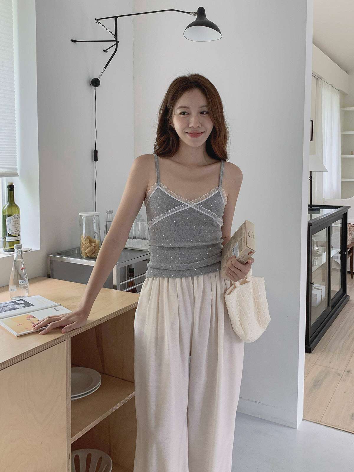 도트 패턴에 레이스 디테일로 러블리한 무드의 끈나시