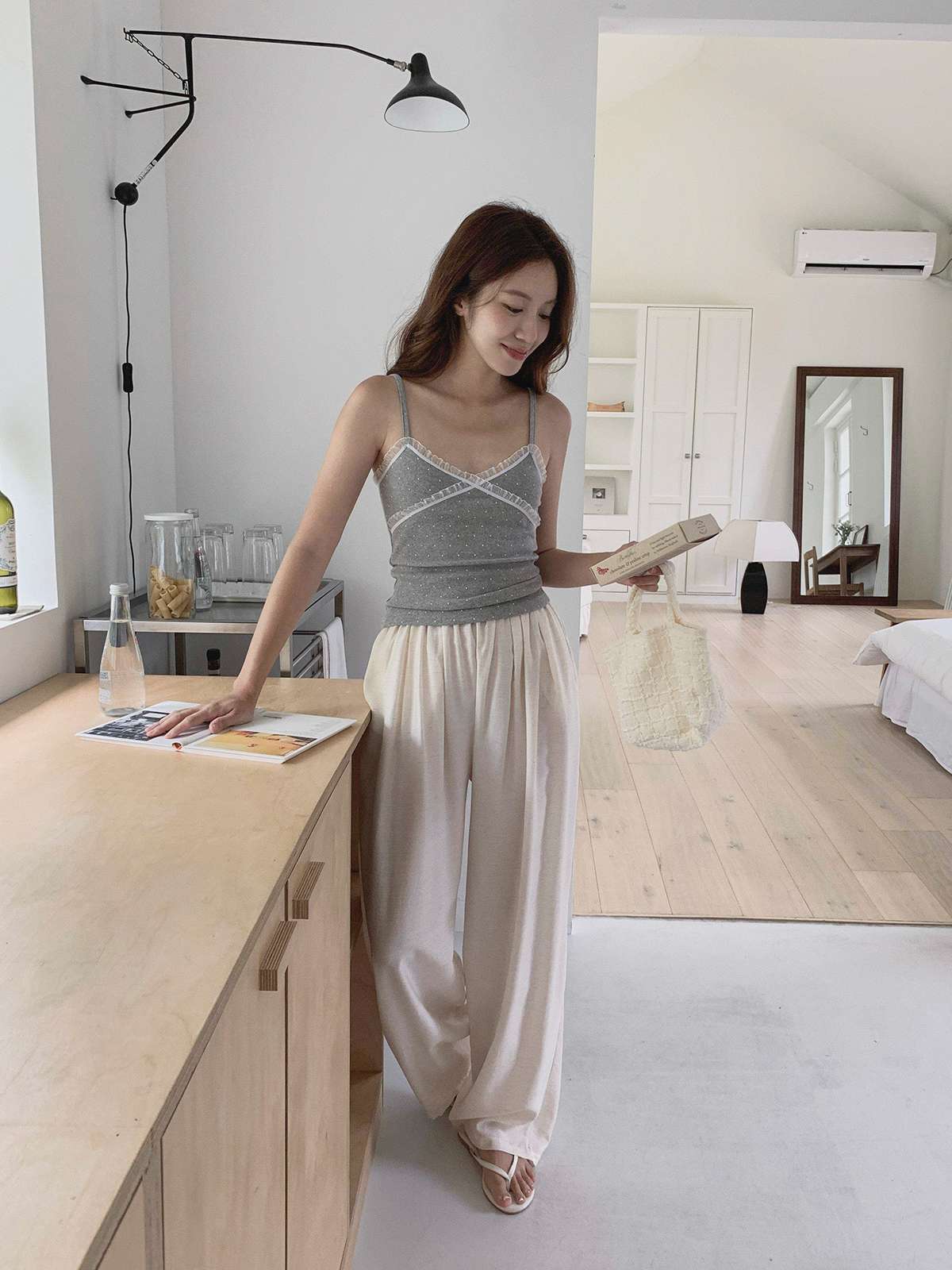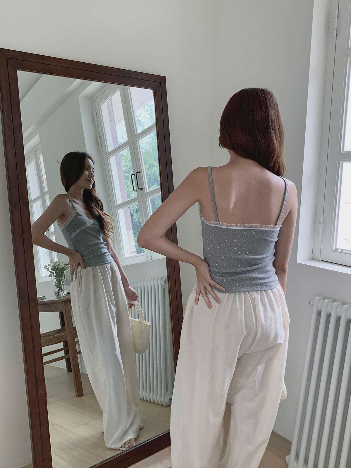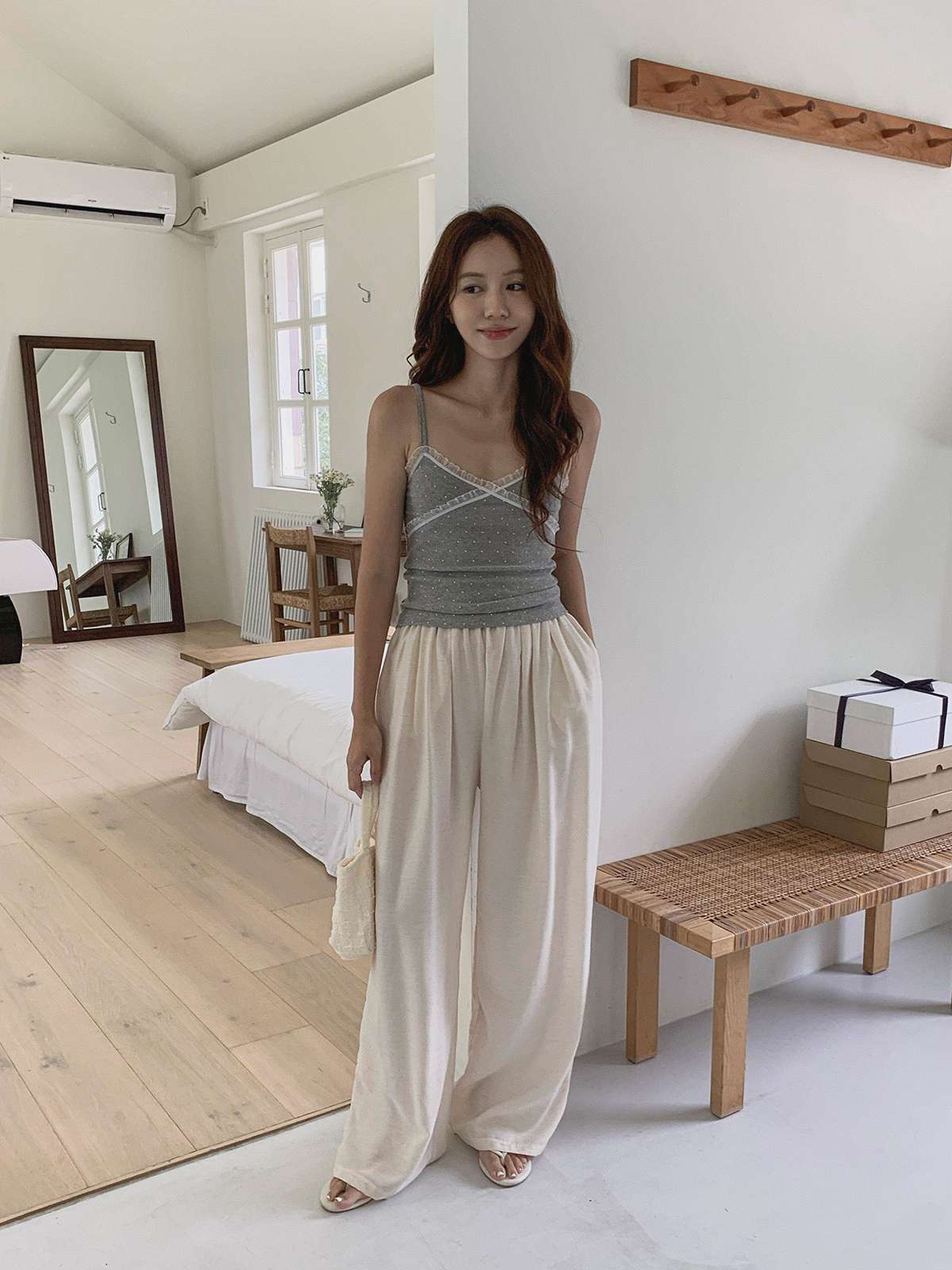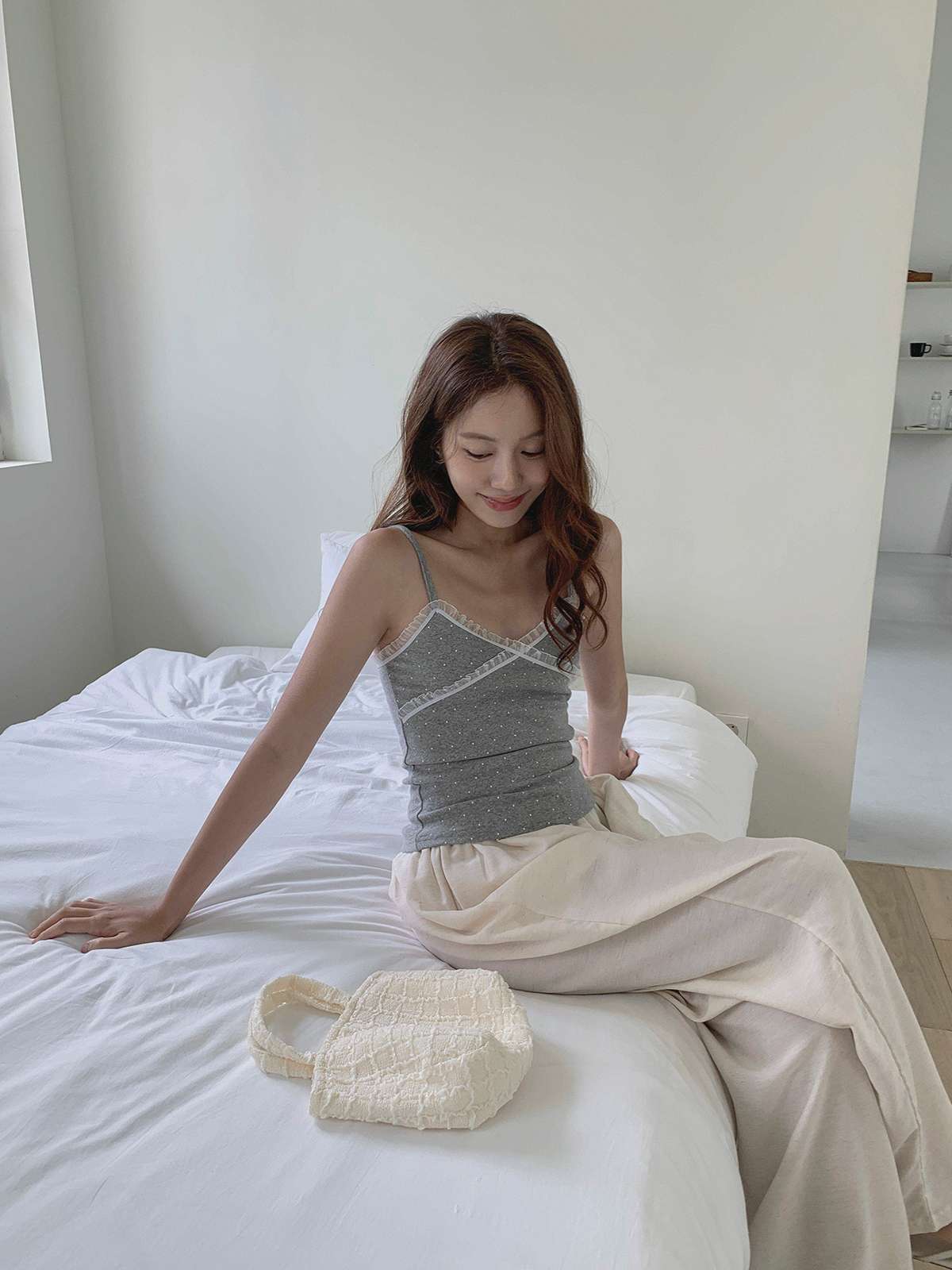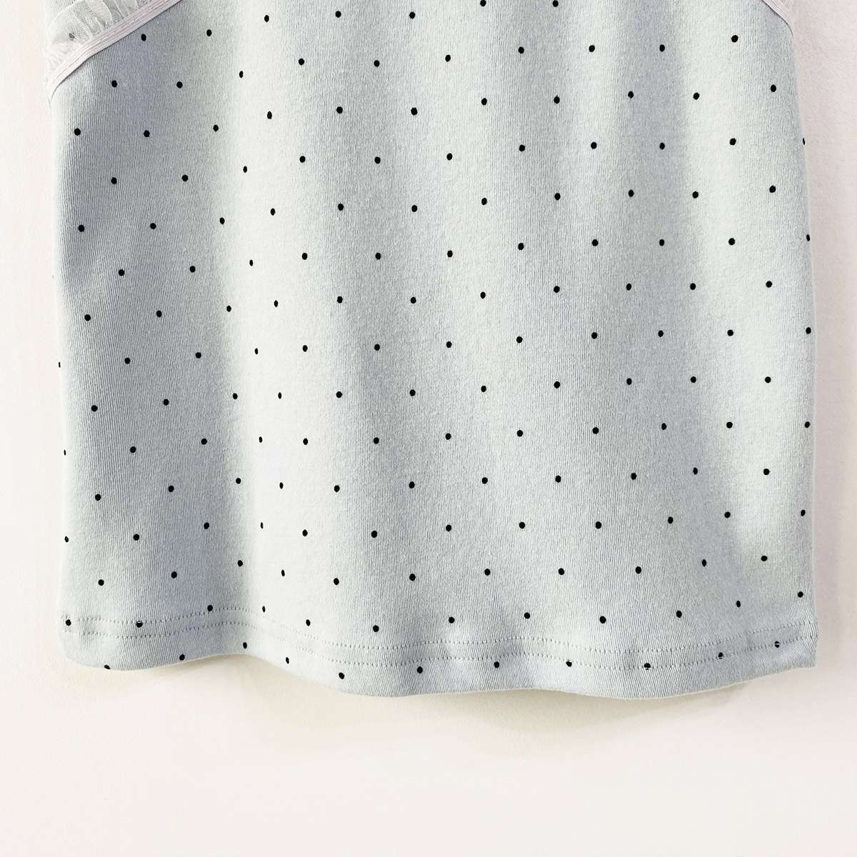 도트 패턴에 레이스 디테일로 러블리한 무드의 끈나시